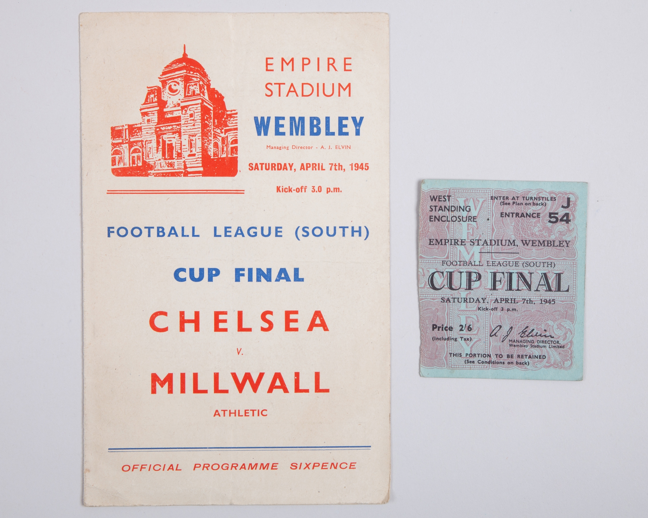 Chelsea v. Millwall Football League Cup Final programme, 7th April 1945, with ticket stub, signs of folds, text on team page (2)