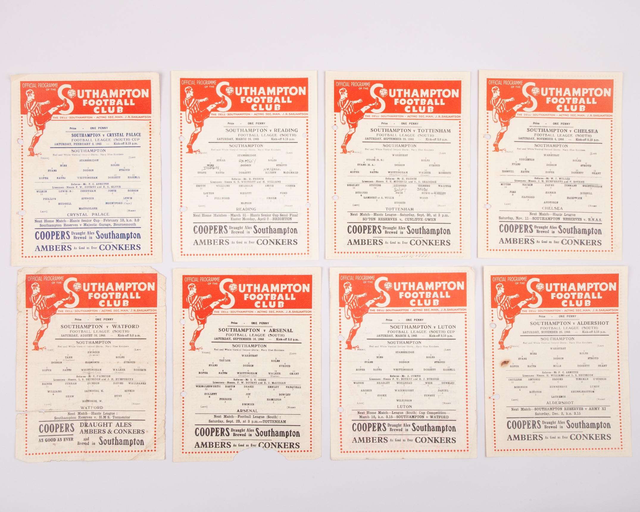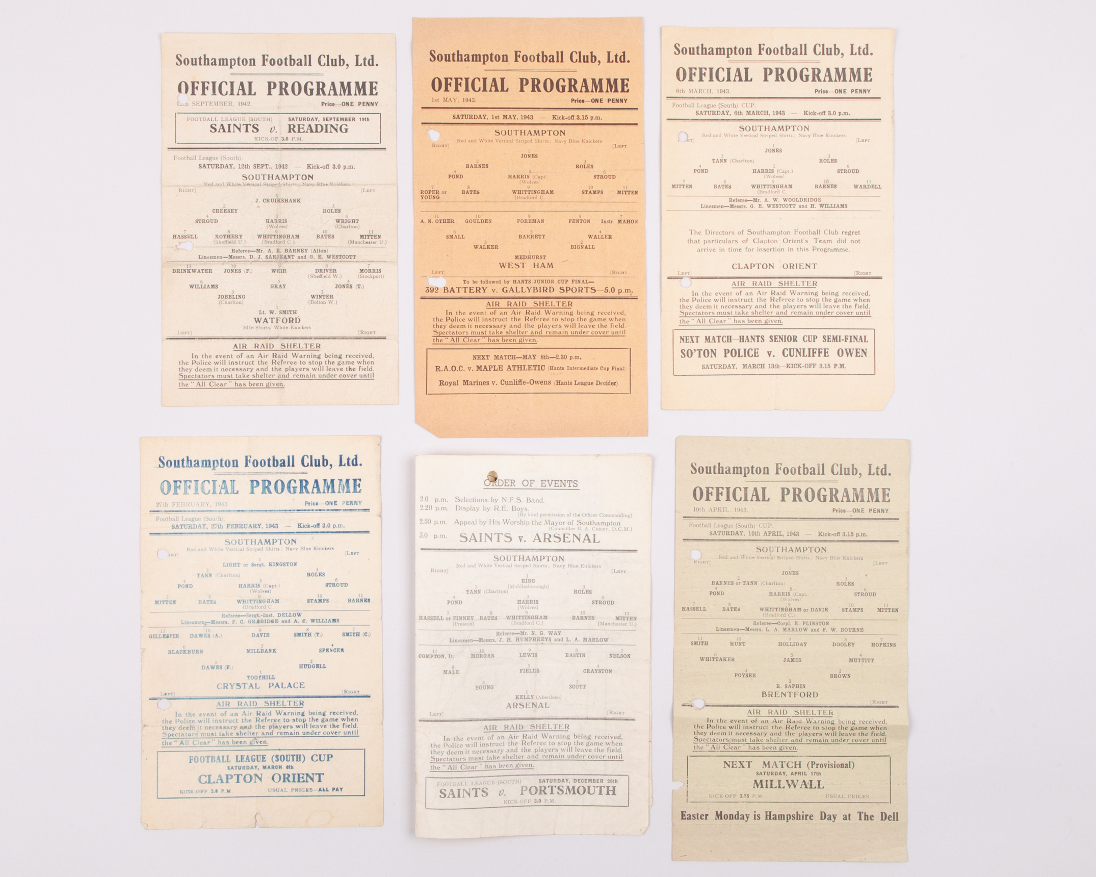 Fourteen Southampton match programmes 1942-44, including West Ham, 1st May 1943, Crystal Palace, 27th February 1943, Arsenal, 5th December 1942, 16th September 1944, Chelsea, 4th November 1944, Tottenham Hotspur, 23rd September 1944 etc, many with punch holes