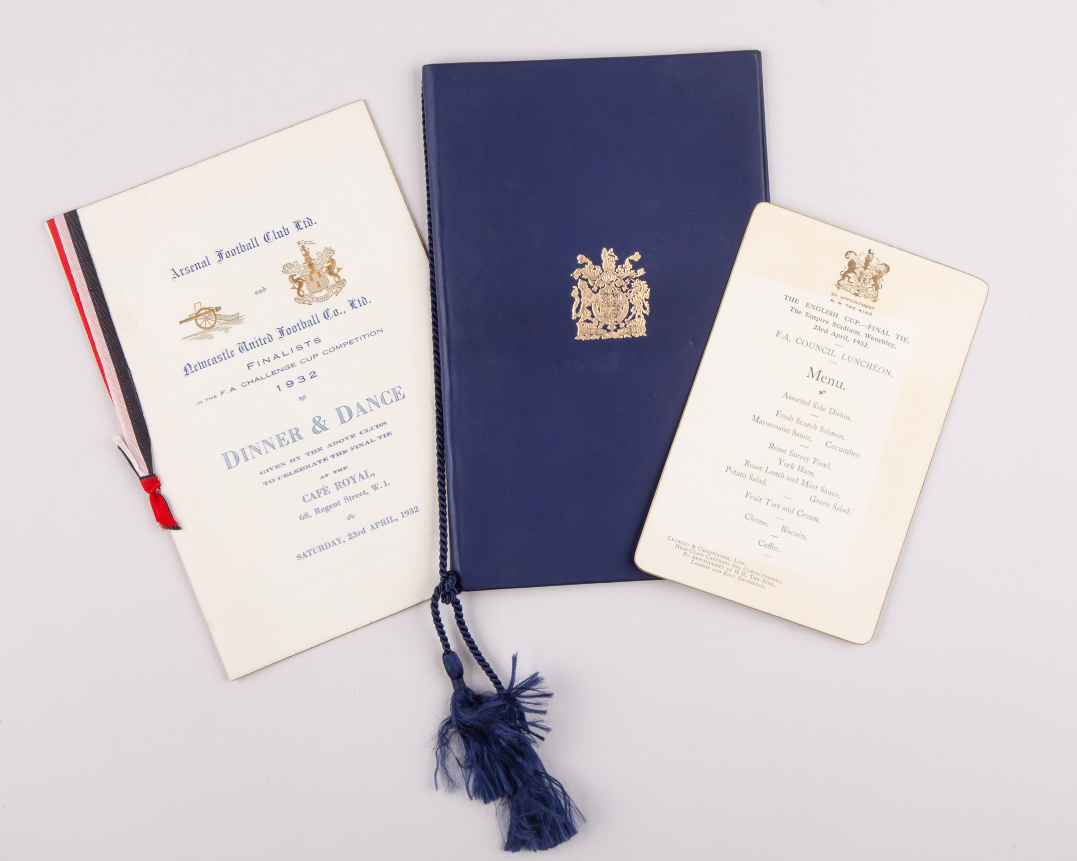 Arsenal v. Newcastle United FA Cup Final VIP programme 23rd April 1932, Dinner and Dance menu post FA Cup Final 1932 at the Cafe Royal, pre match FA Cup Final 1932 F.A. Council Luncheon menu (3)
