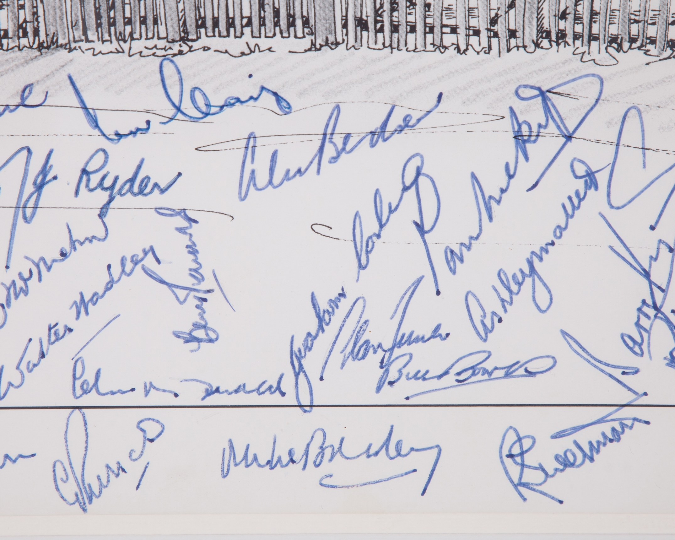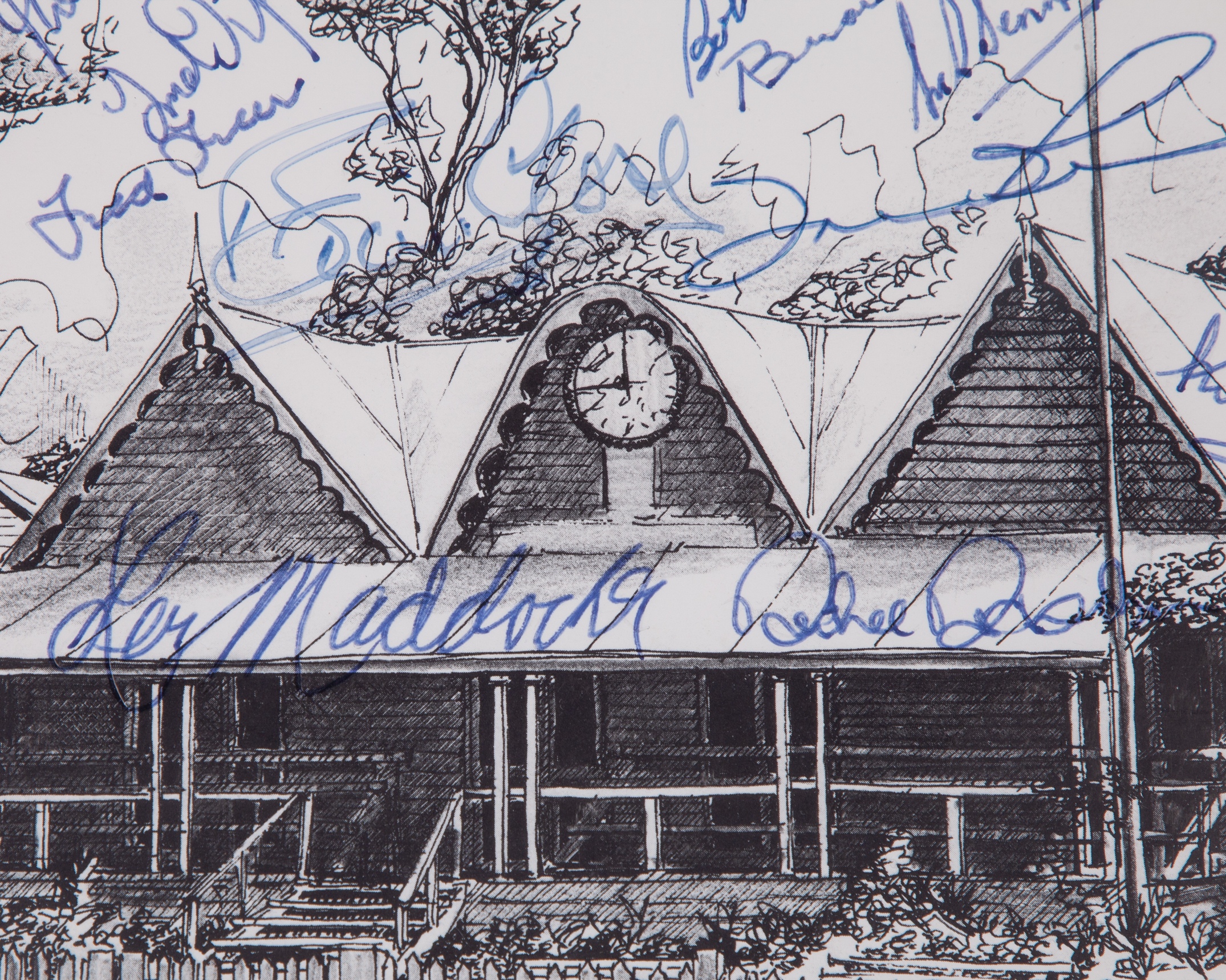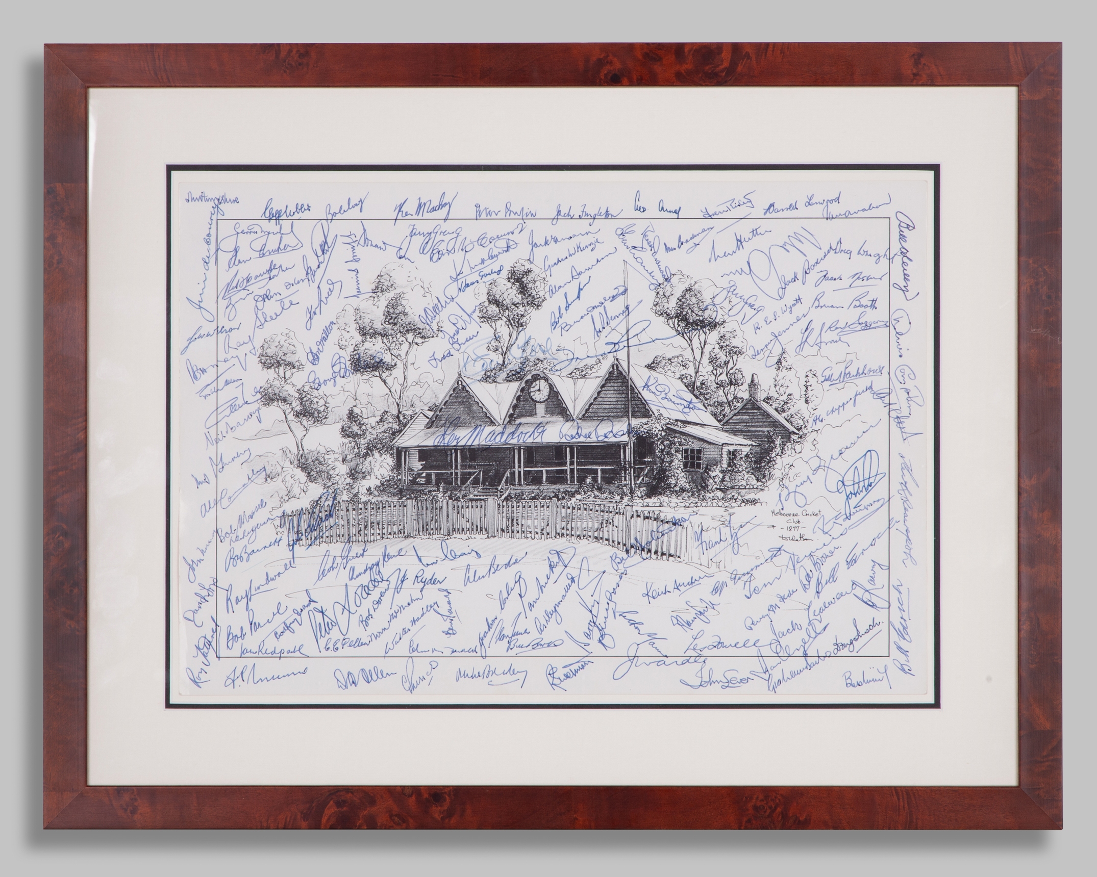 1977 Melbourne Centenary Ashes Test match an extensively signed print, the print depicting the original Melbourne Cricket Pavilion, 1877, the print with over 70 autographs including Don Bradman, Denis Compton, Dennis Lillee, Len Hutton, Keith Miller, Richard Hadlee, Fred Trueman, Ray Lindwall, Geoff Boycott, Colin Cowdry, Harold Larwood, Bill Ponsford, Alec Bedser, etc, with letter of provenance from Brian Close, the print was purchased by the vendor from Briam Close, 2009
