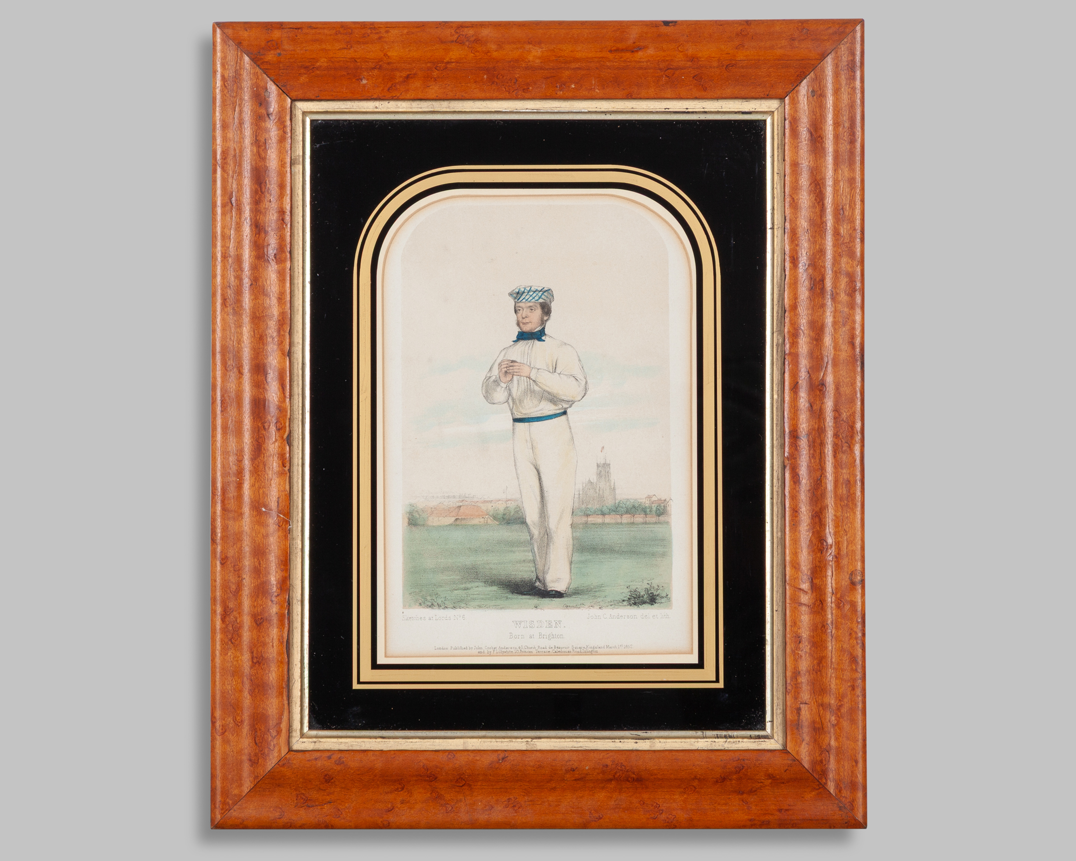 Sketches at Lords No.6 lithograph by John Corbet Anderson, depicting English cricketer John Wisden, London published by John Corbert Anderson on 40, Church Road, de Beauvoir Square, Kingsland, March 1st 1852 and by F. Lillywhite, 10 Princes Terrace, Caledonian Road, Islington, framed and glazed, 30 x 37cm
