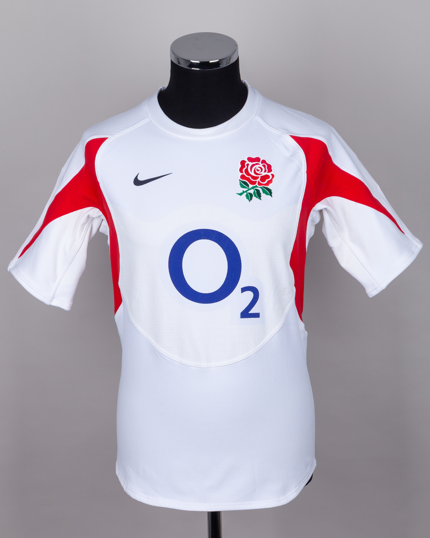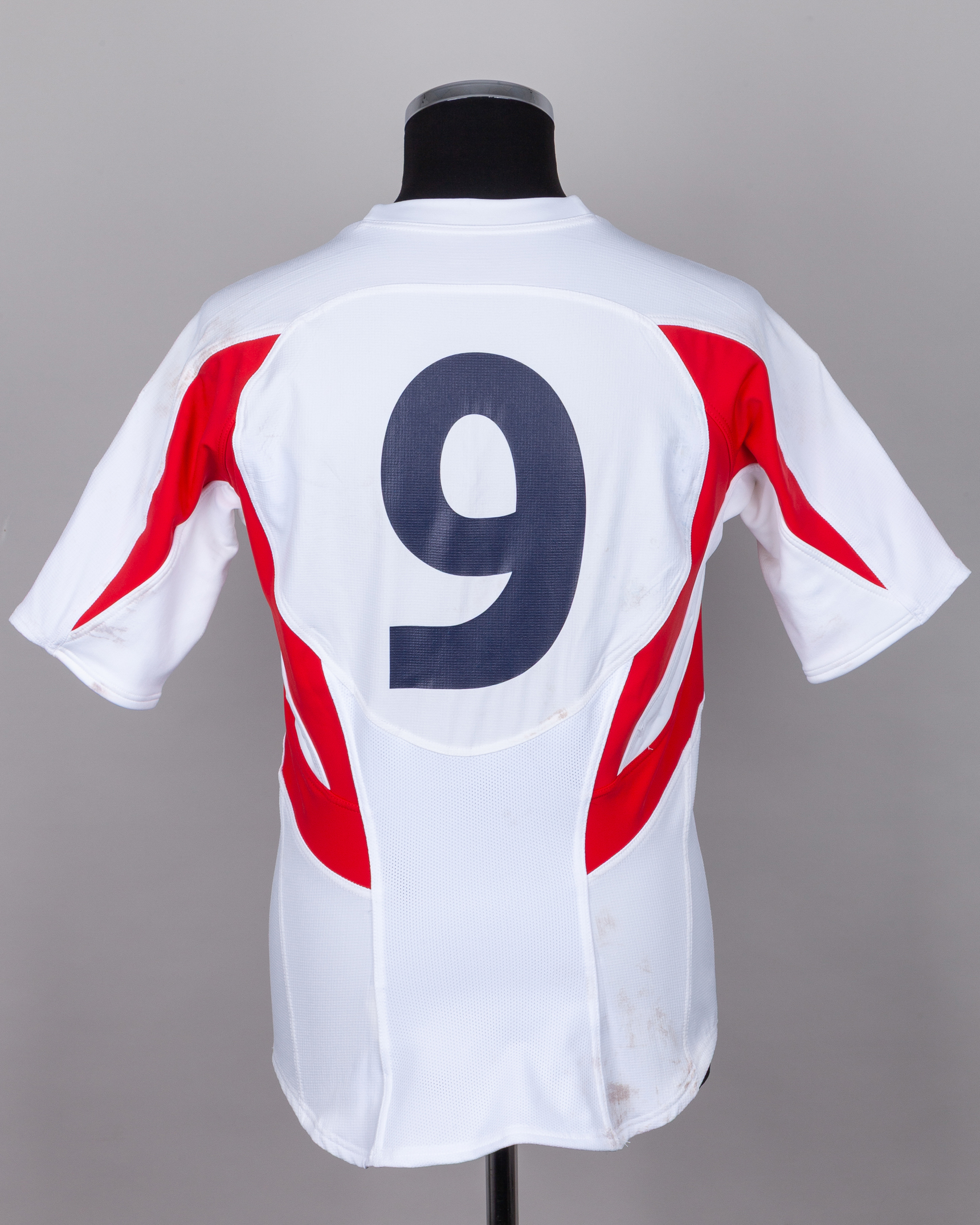 White and red No.9 England rugby union short-sleeved shirt, 2005-06, Nike, L, with crew-neck collar and felt badge, with staining and discolouration