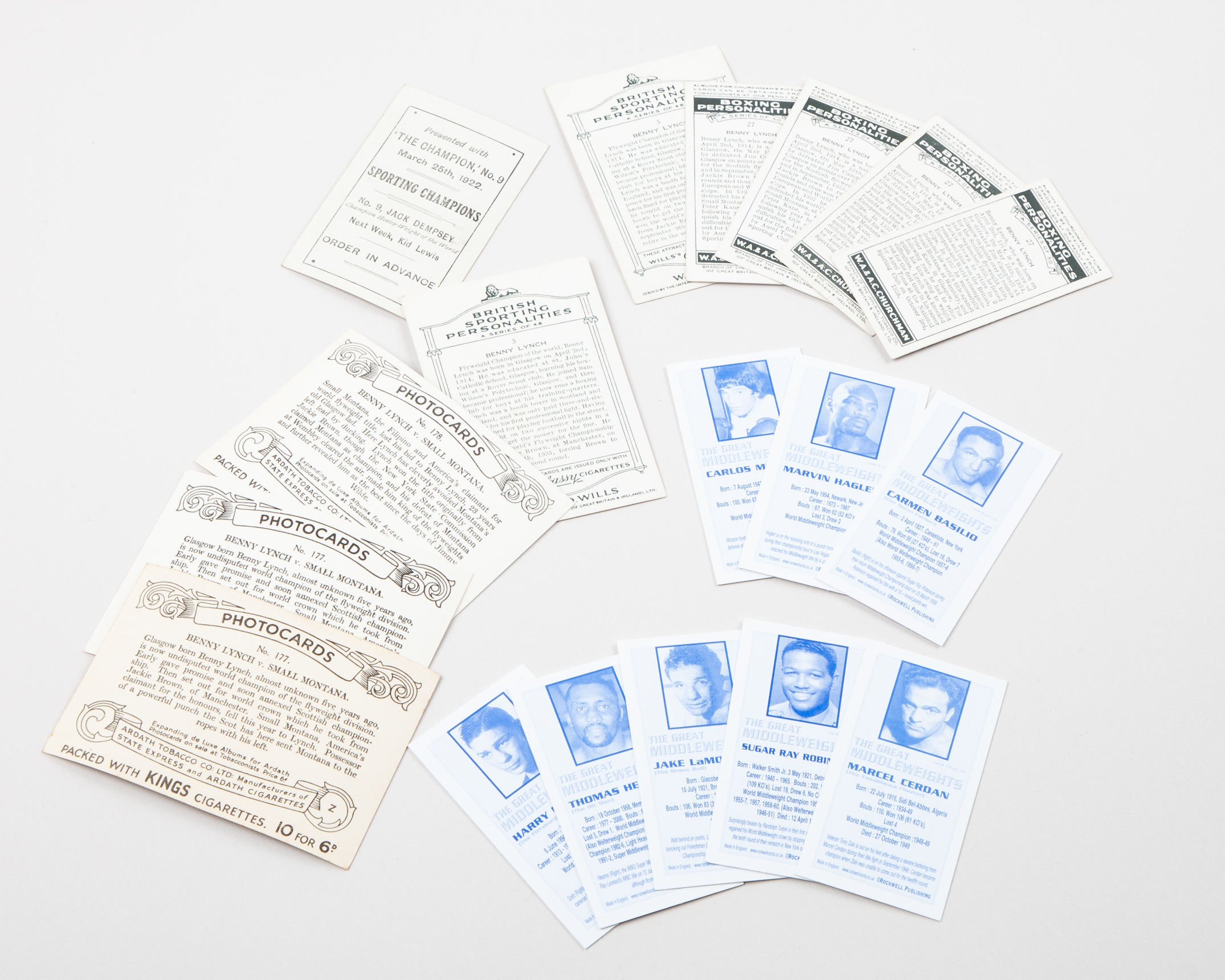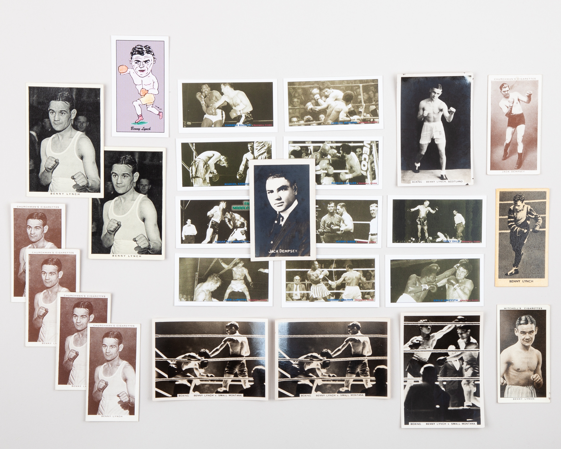 A white-metal and enamel Arsenal F.C. Henry Cooper v. Muhammad Ali lapel limited edition lapel badge, inscribed HENRY COOPER VS MUHAMMAD ALI, 21st Mau 1966, ARSENAL STADIUM, with Arsenal crest, No.23 of a limited edition of 50, Ernie Shaver signed CD box and small collection of boxing cigarette cards