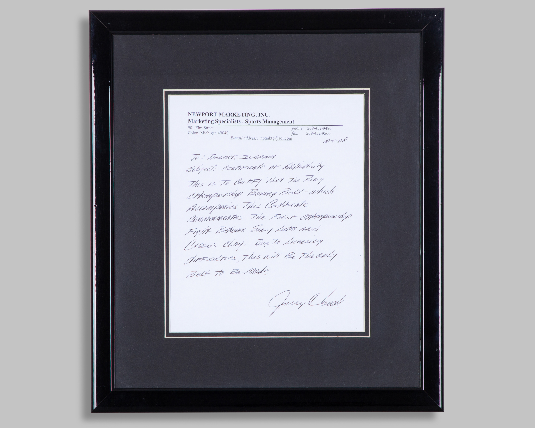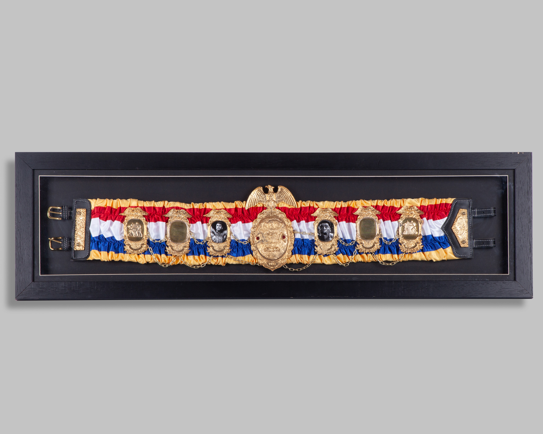 A Muhammad Ali v. Sonny Liston replica ring belt, with COA, framed, 31 x 100cm