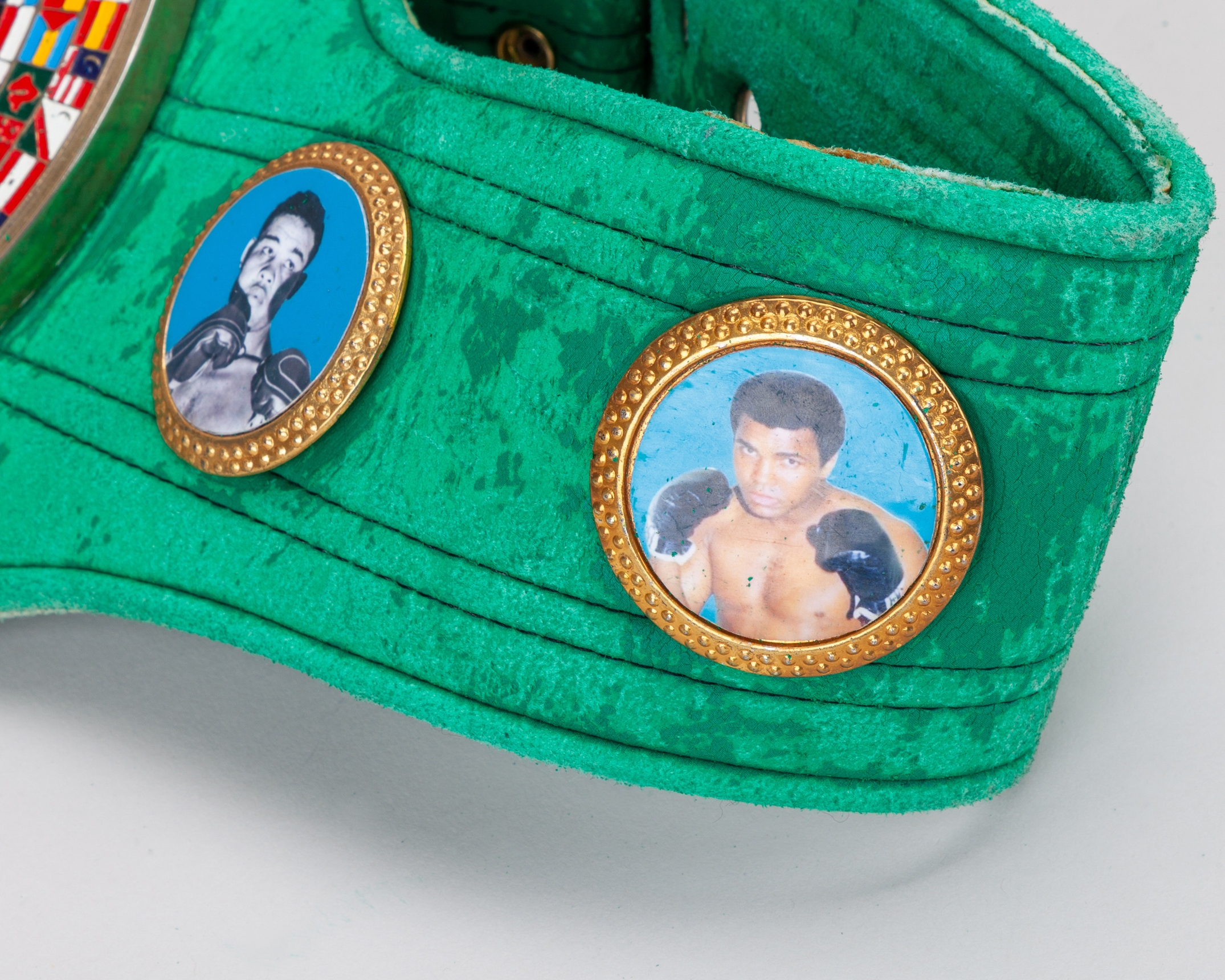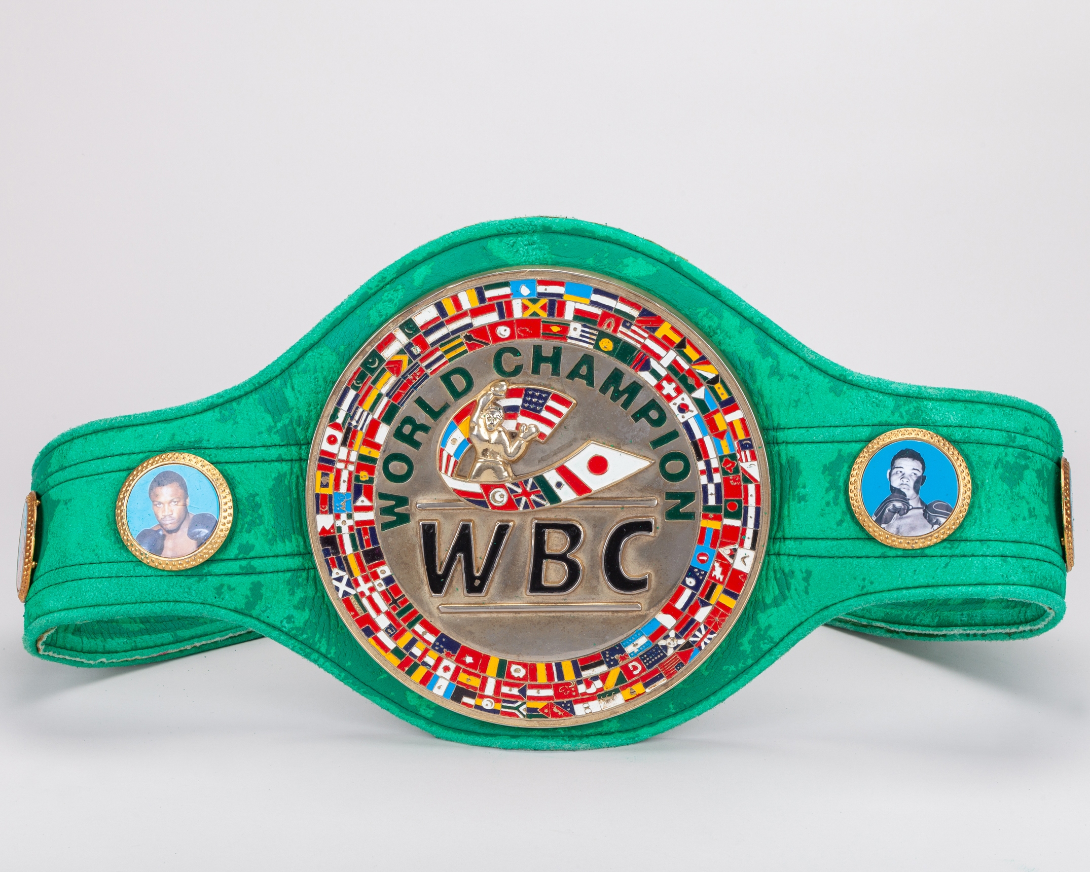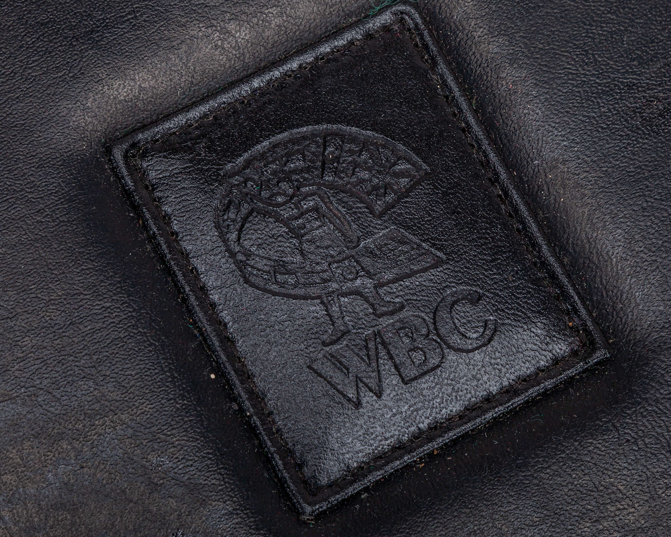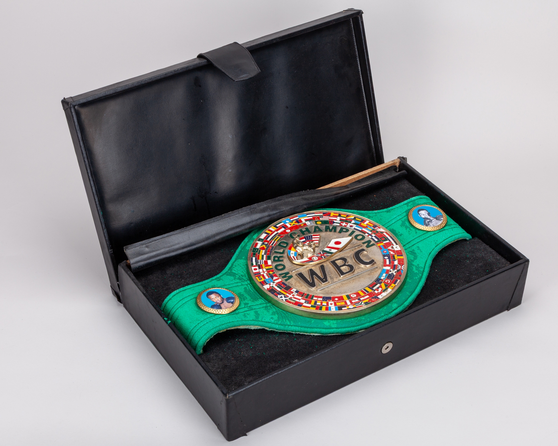 A replica WBC belt, with printed photographs of previous winners, in case, cased damaged, belt worn and damaged