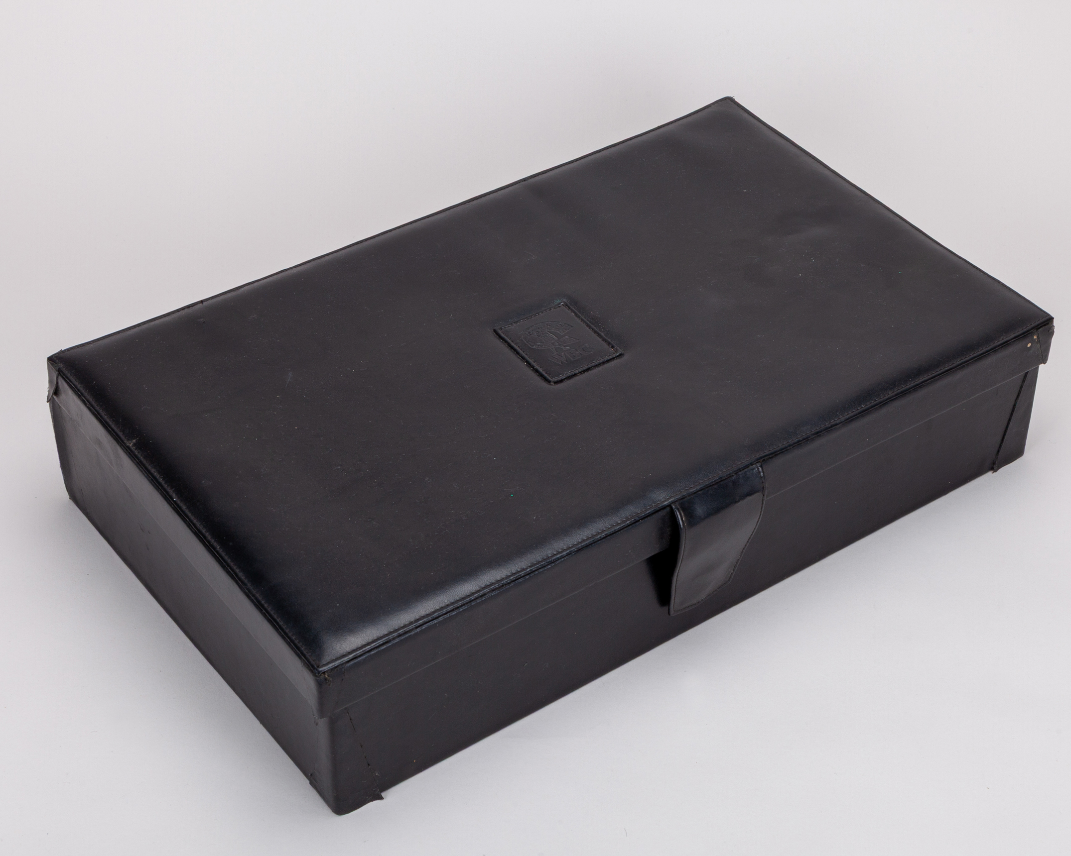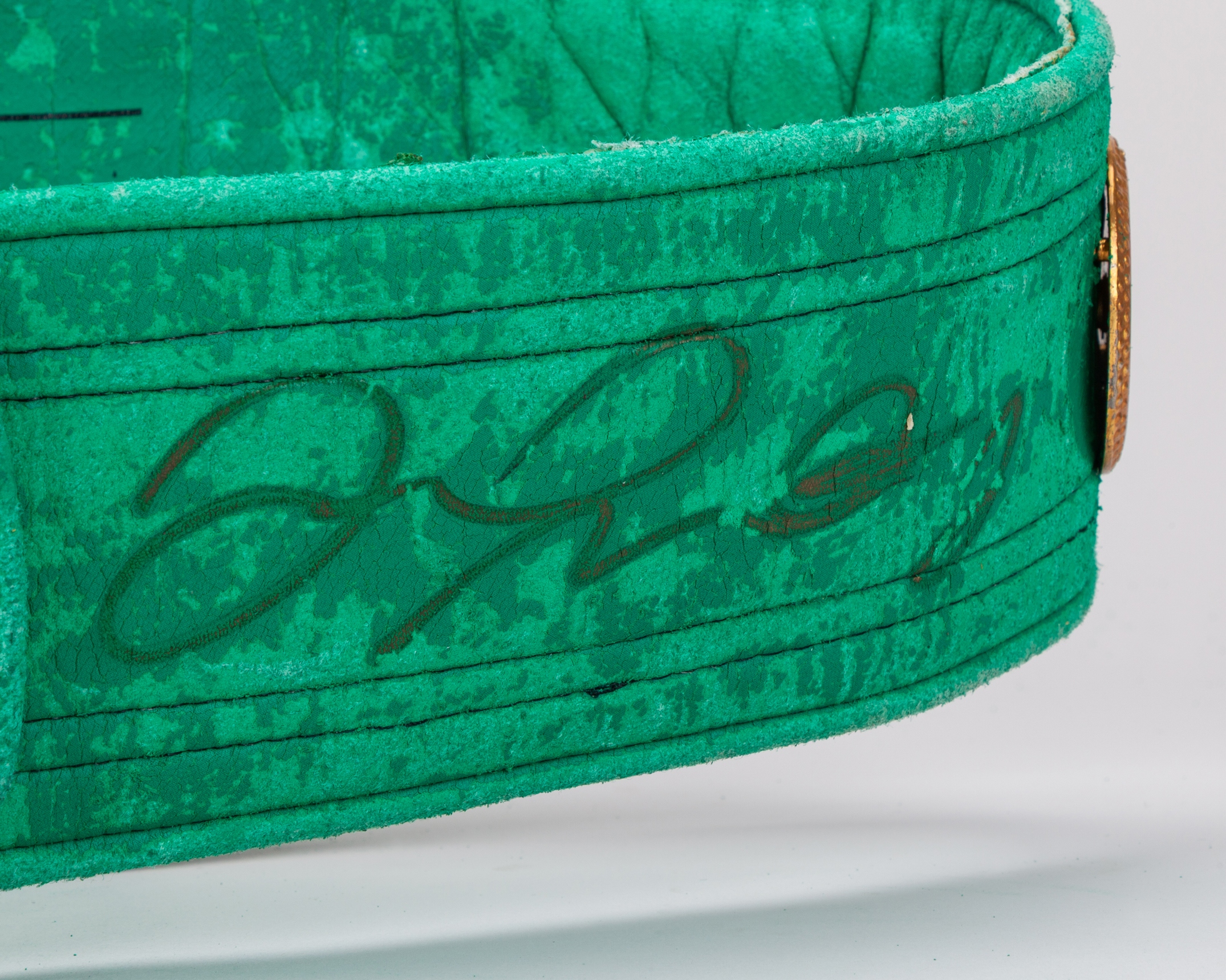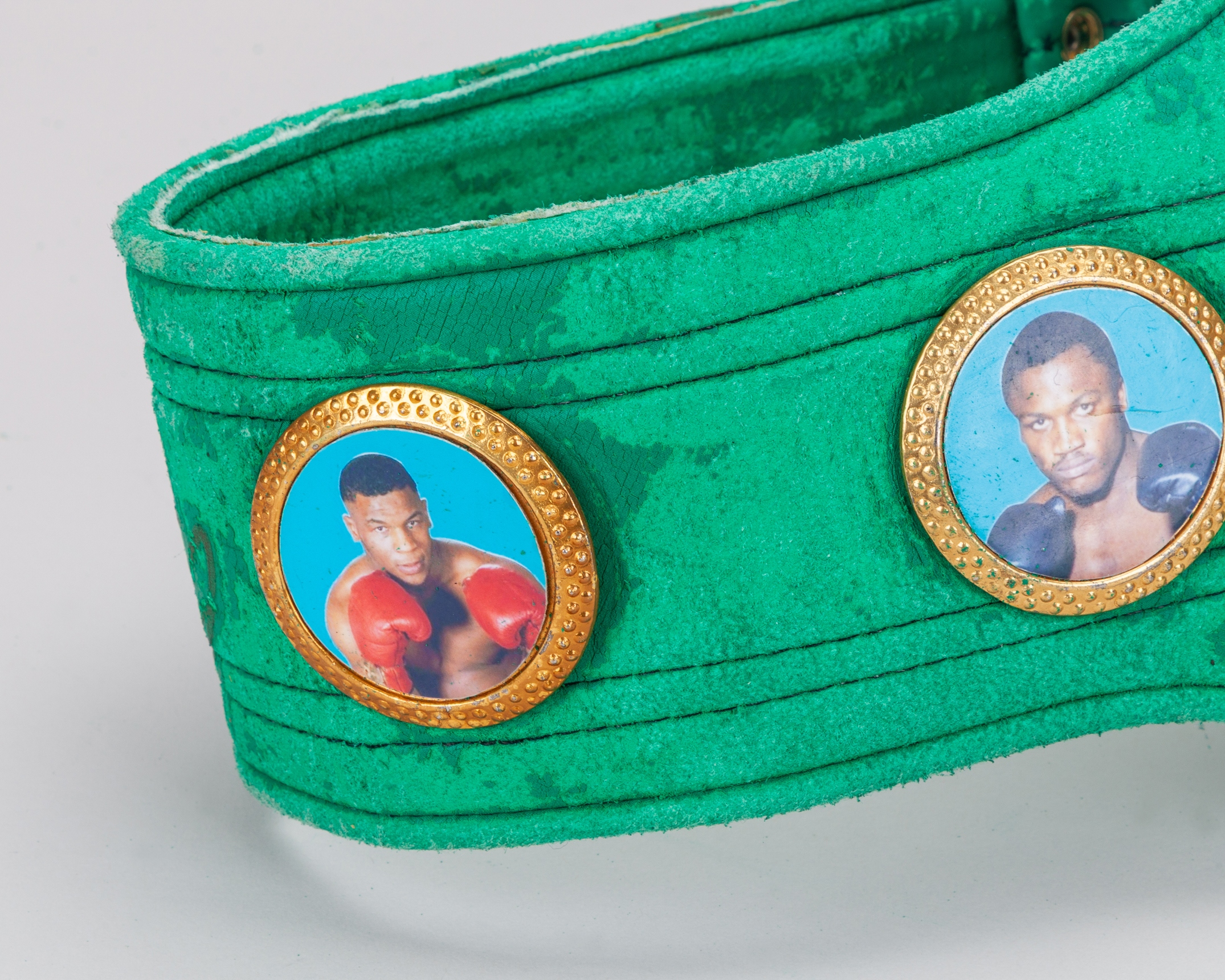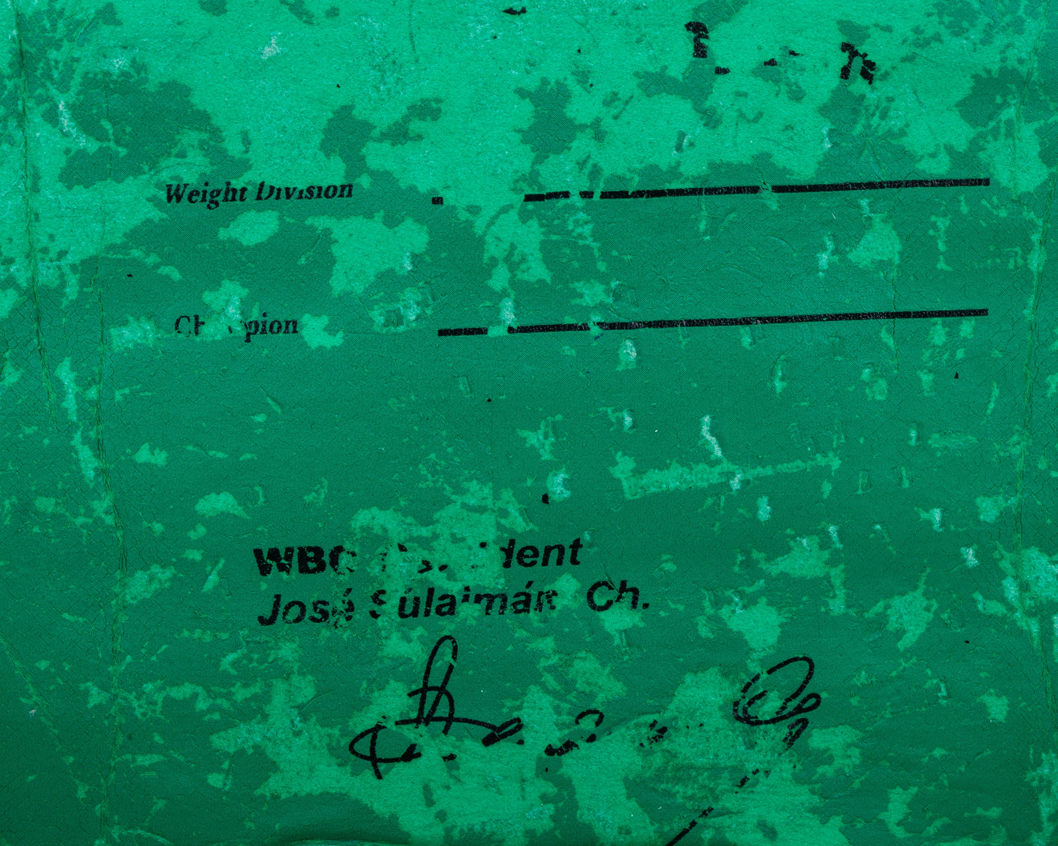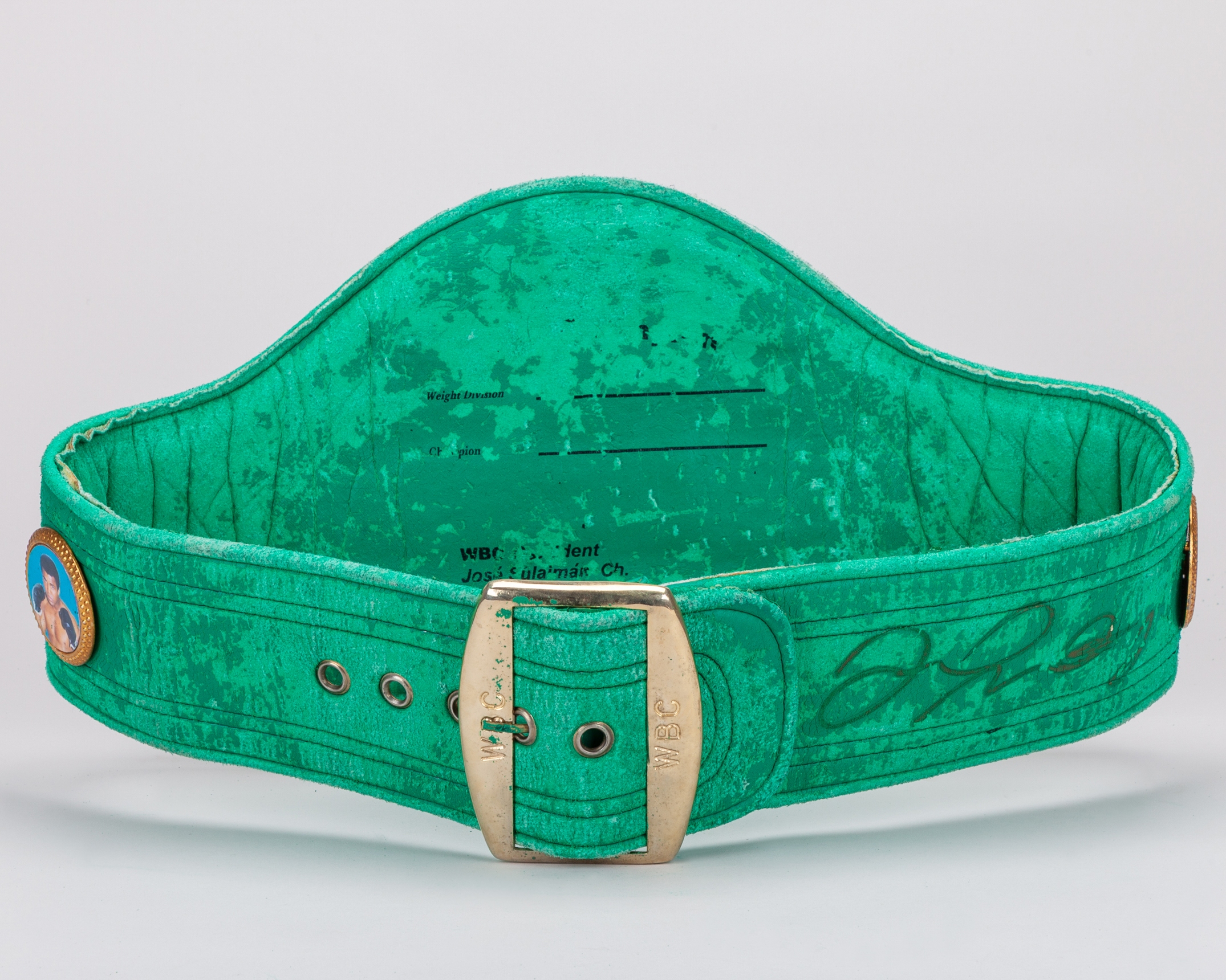 A replica WBC belt, with printed photographs of previous winners, in case, cased damaged, belt worn and damaged