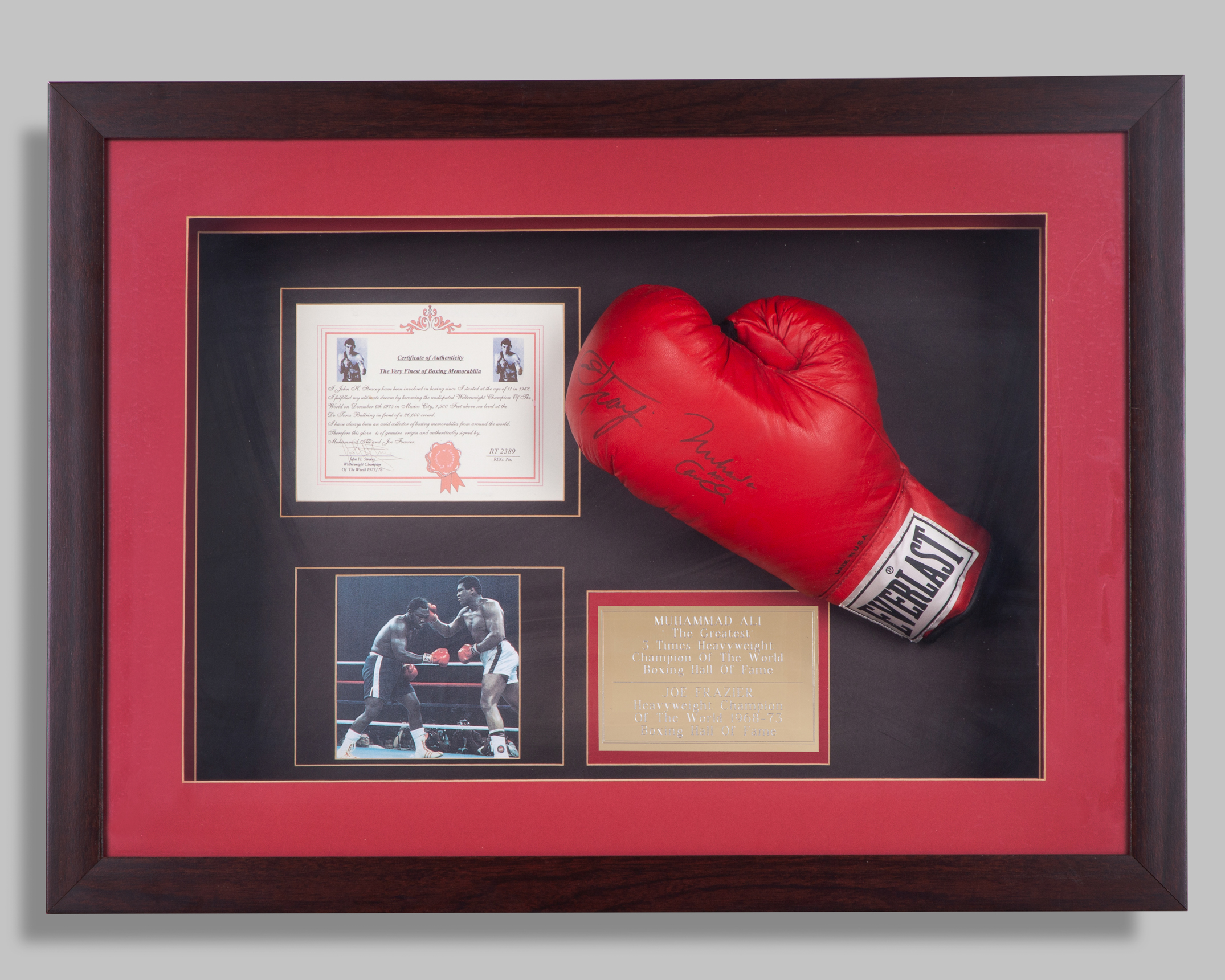 Muhammad Ali and Joe Frazier autographed red Everlast boxing glove display, with colour photograph, with COA, framed and glazed, 78 x 58cm