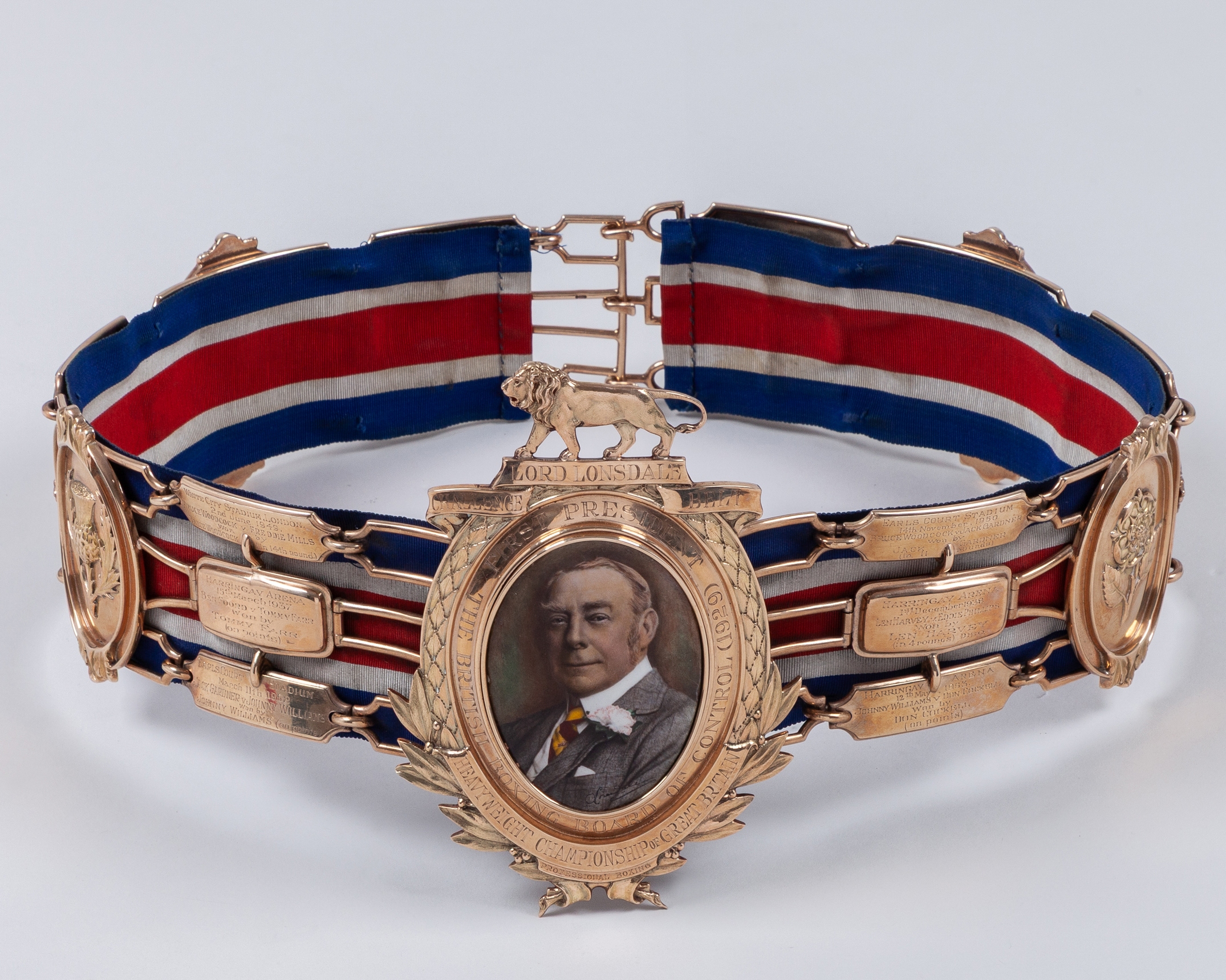 Henry Cooper 9ct gold and enamel Heavyweight Lonsdale Belt won by Henry Cooper, 1959 (twice) and 1961, by Mappin and Webb, Sheffield 1936, the large central enamel portrait panel depicting Lord Lonsdale and inscribed Lord Lonsdale Challenge Belt British Boxing Board of Control First President (1929) Heavyweight Championship of Great Britain and the reverse inscribed THIS BELT IS THE SOLE PROPERTY OF HENRY COOPER Who has won the heavyweight championship of Great Britain three times, flanked by hinged strap work and four oval medallions cast with emblems of England, Scotland, Wales and Ireland and two enamel plaques of boxers in action, fourteen plaques inscribed with championship fight details, comprising Harringay Arena 15th March 1937 Ben Food v Tommy Farr won by Tommy Farr on points, Harringay Arena 1st December 1938 Len Harvey v Eddie Phillips won by Len Harvey in 4 rounds disq.; Belle Vue Manchester 15th September 1944 Jack London v Fred Mills, won by Jack London on points; Tottenham Hotspur Football Ground 17th July 1945 Jack London v Bruce Woodcock won by Brice Woodcock in 6 rounds; White City Stadium London, 2nd June 1949 Bruce Woodcock v Freddy Mills won by Bruce Woodcock in 14th round; Earls Court Stadium 14th November 1950, Bruce Woodcock v Jack Gardner won by Jack Gardner in 11 rounds; Earls Court Stadium March 11th 1952 Jack Gardner v Johnny Williams won by Johnny Williams on points; Harringay Arena 12th May 1953 Johnny Williams v Don Cockell won by Don Cockell on points; Maindy Stadium, Cardiff 27th August 1956 Joe Erskine v Johnny Williams won by Joe Erskine on points; Harringay Arena 17th September 1957 Joe Erskine v Henry Cooper won by Joe Erskine on points; 1958 White City Stadium 3rd June 1958, Joe Erskine v Brian London, won by Brian London in 8 rounds; Earls Court Arena 17th November 1959, Henry Cooper v Joe Erskine won by Henry Cooper in 12 rounds; Earls Court Stadium 12th January 1959 Brian London v Henry Cooper won by Henry Cooper on points; Empire Pool Wembley 21st March 1961, Henry Cooper v Joe Ersline won by Henry Cooper in 5 rounds', complete with red, white and blue ribbon backing and in original velvet lined and leather mounted Mappin & Webb case, the belt 94cm long and a fine printed chronicle from 1937 to 1961 relating to the fights