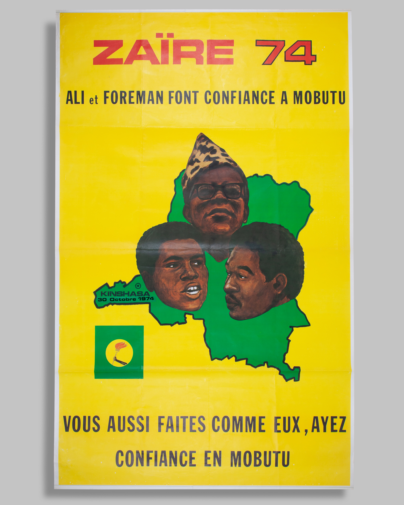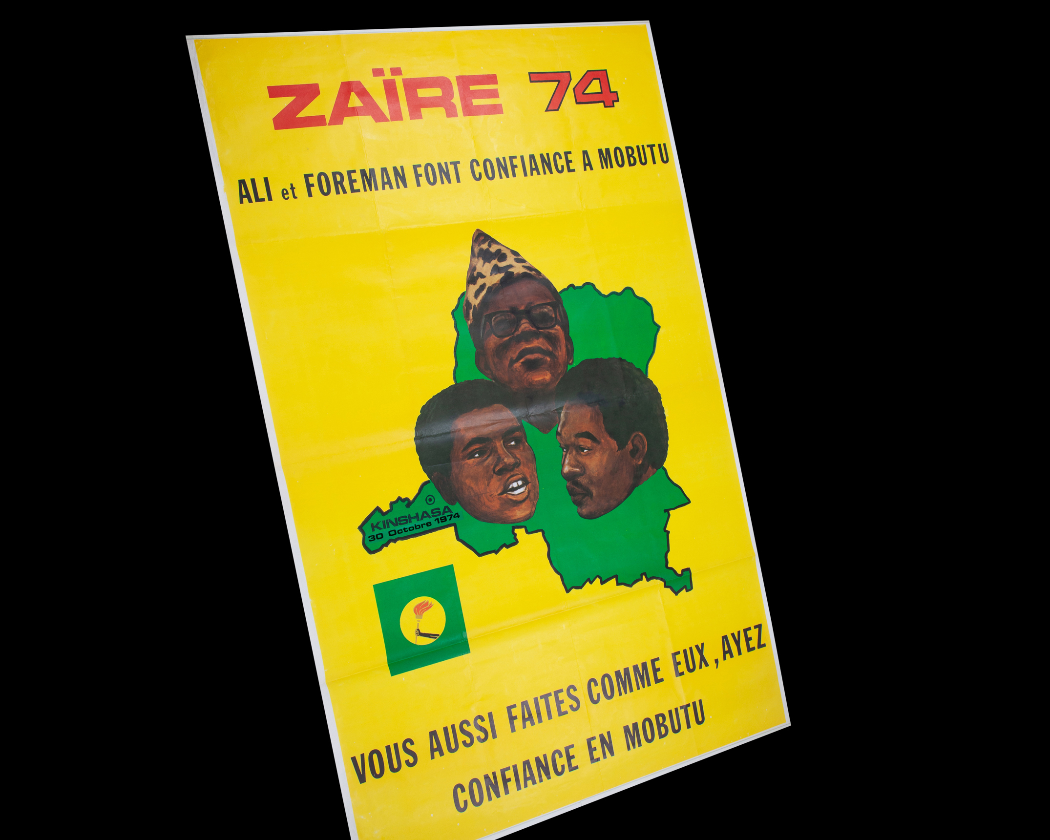 Rumble in the Jungle: a large on-site original poster for the 1974 Zaire Ali v Foreman 'Rumble in the Jungle', in Kinshasa on 30th October, French language poster featuring both boxers set against the geographical shape of Zaire and President Mobutu, in French, 190 x 120cm, folds and minor tears on edges