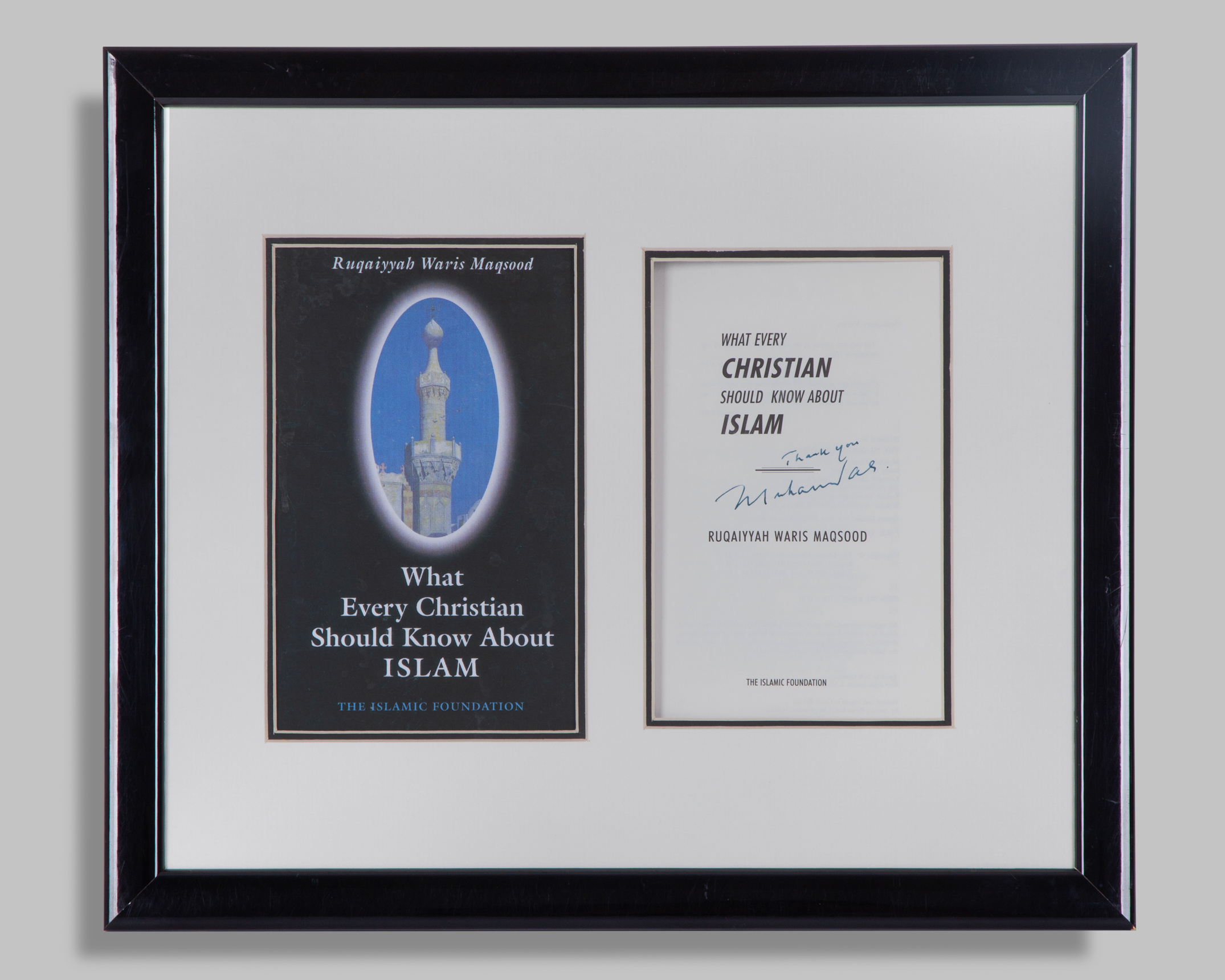 Muhammad Ali autographed What Every Christian Should Know About Islam The Islamic Foundation booklet, framed and glazed, 39 x 34cm