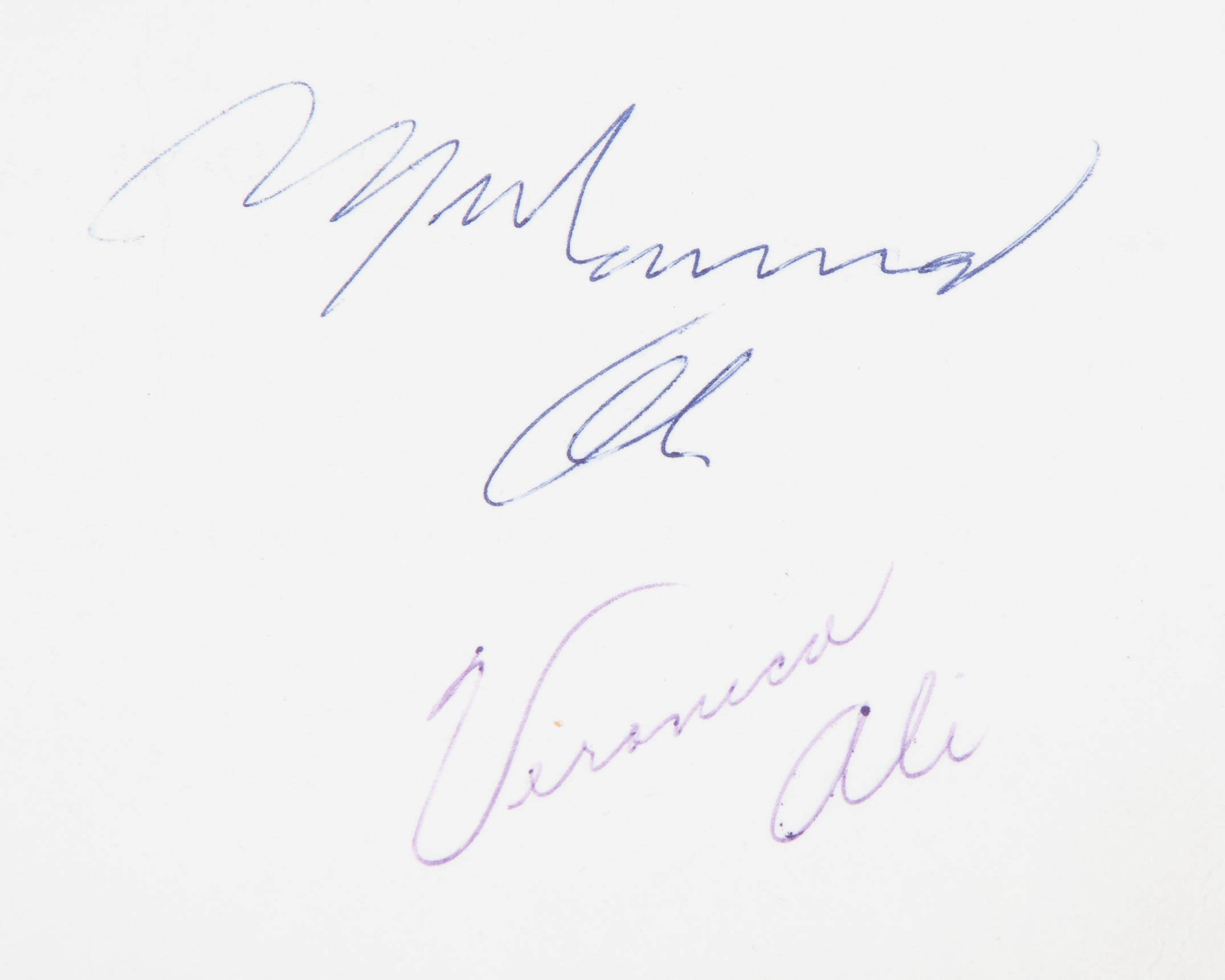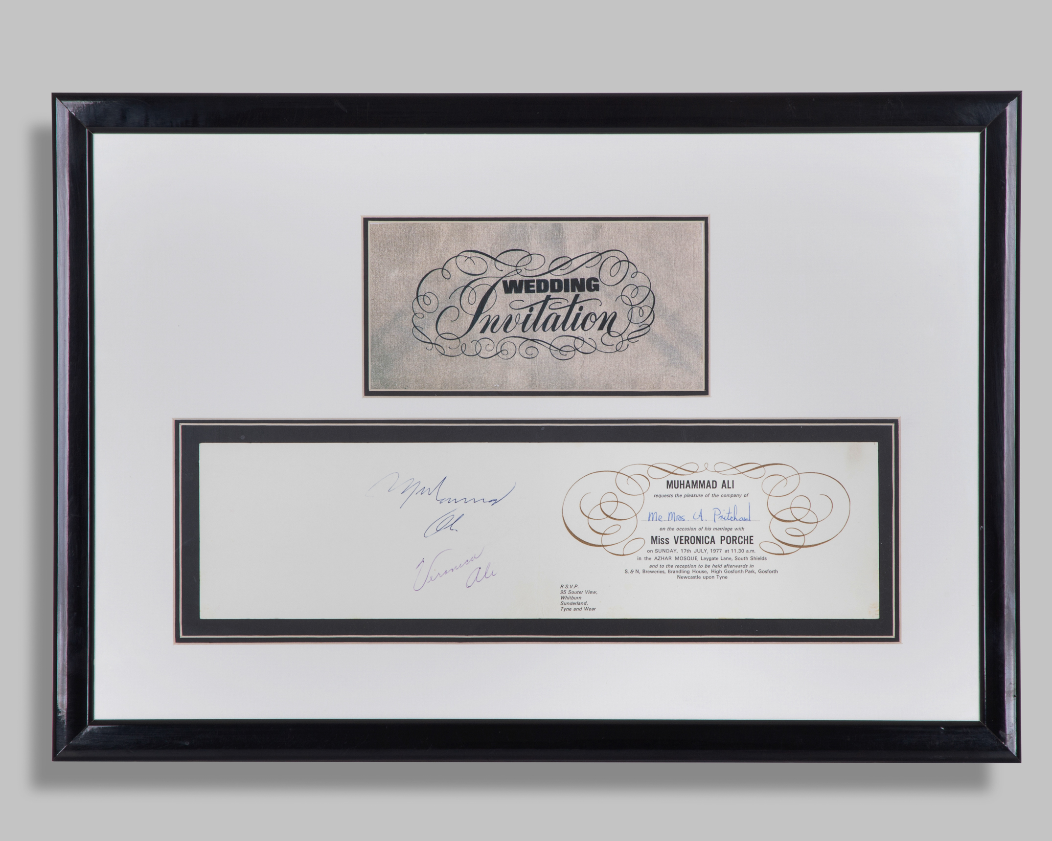 A rare Muhammad Ali and Veronica Ali autographed wedding invitation South Shields 1977, addressed to Mr. Mrs. A. Pritchard to attend the wedding of Muhammed Ali and Miss Veronica Porche on 17th July 1977 in Azhar Mosque, South Shields (England), framed and glazed, 55 x 38cm