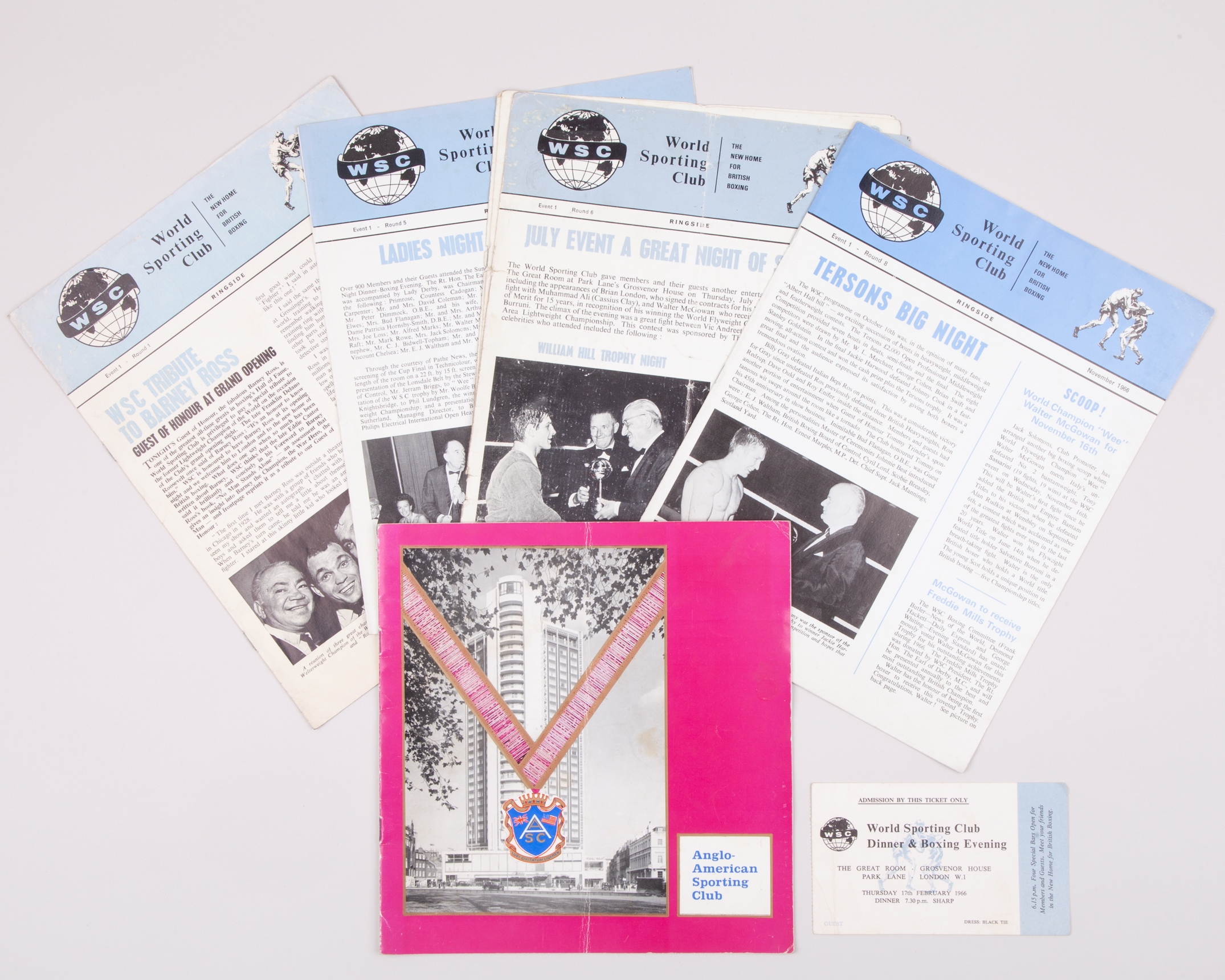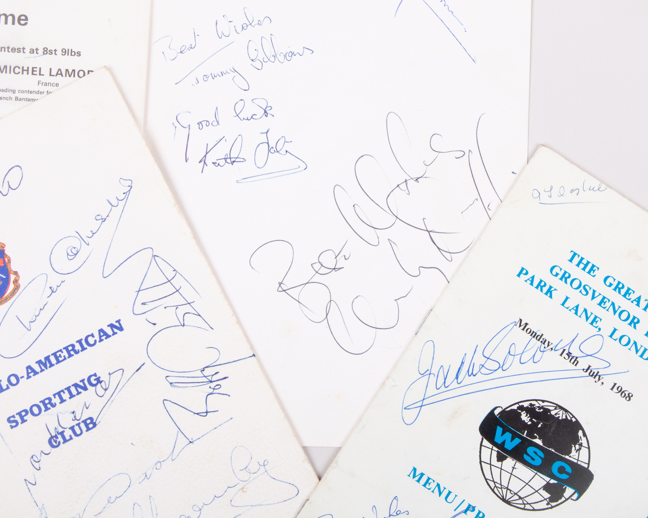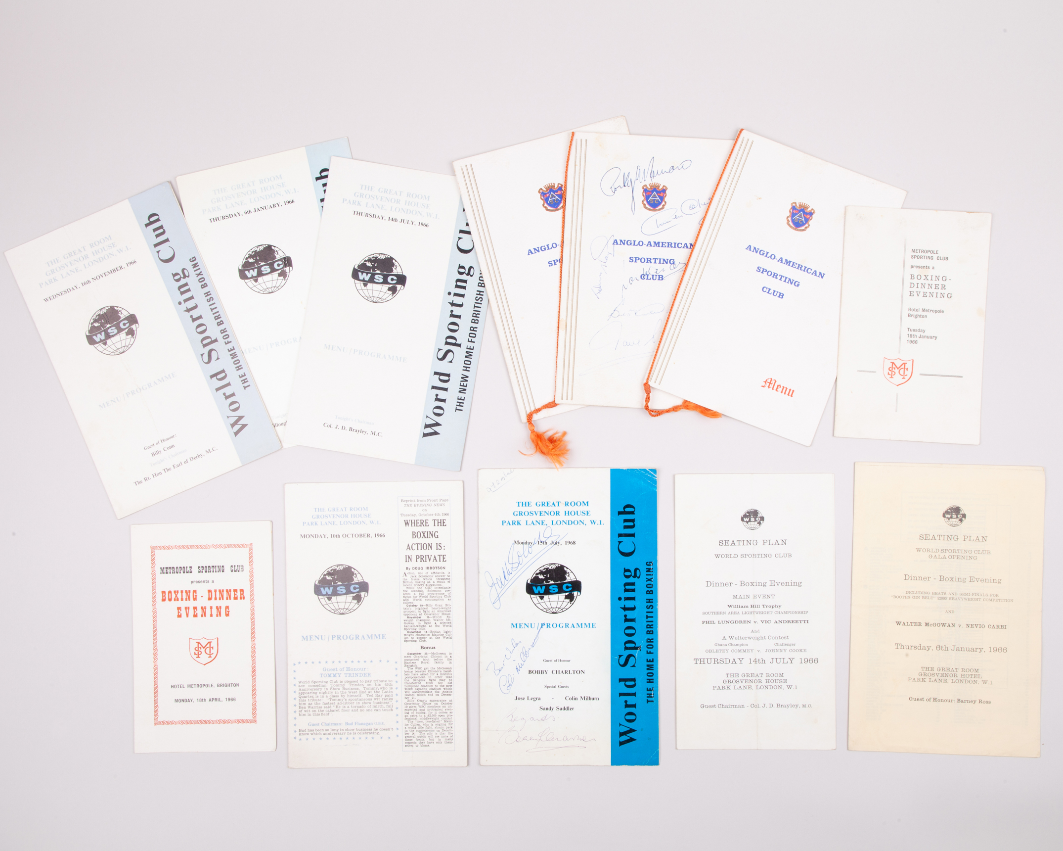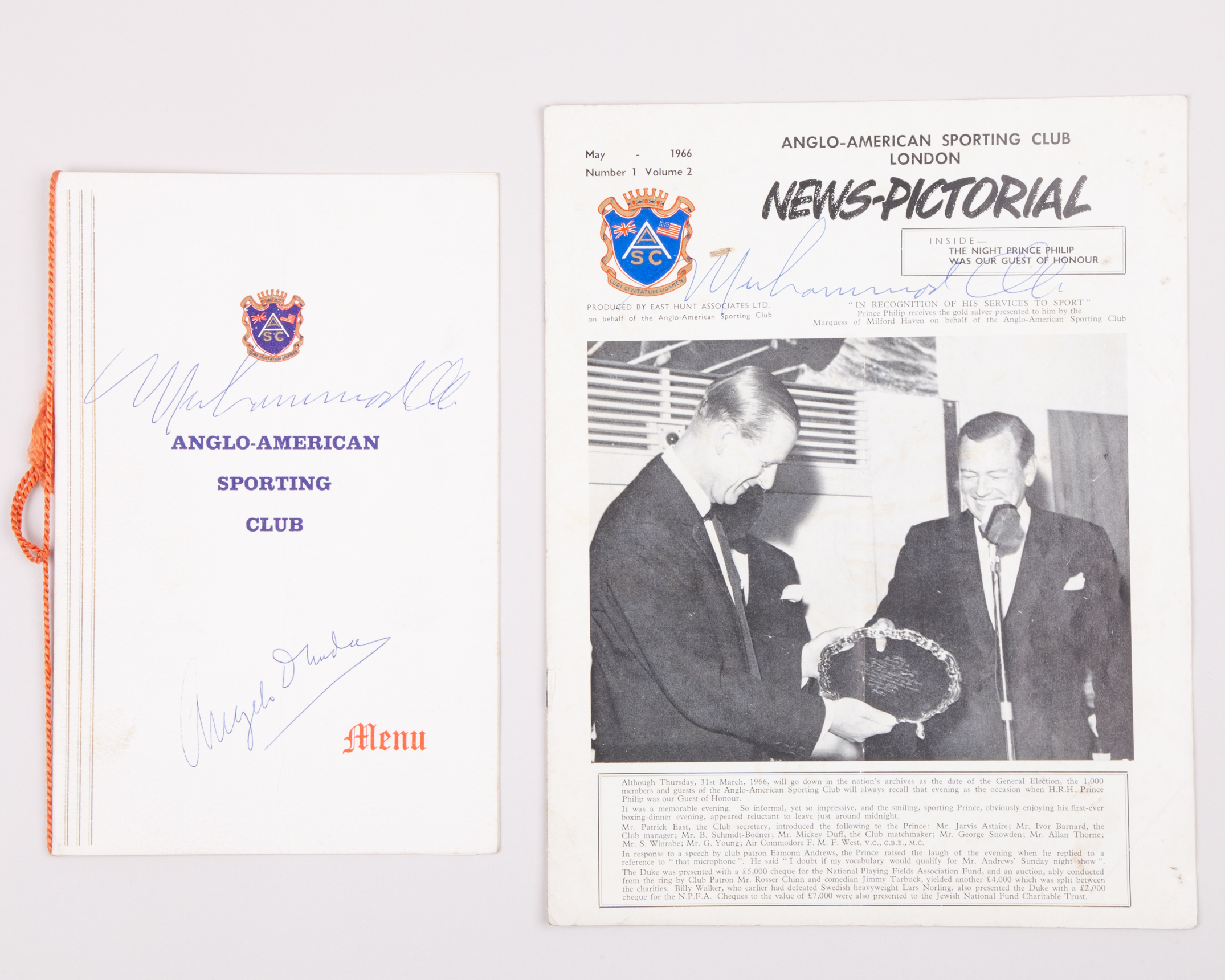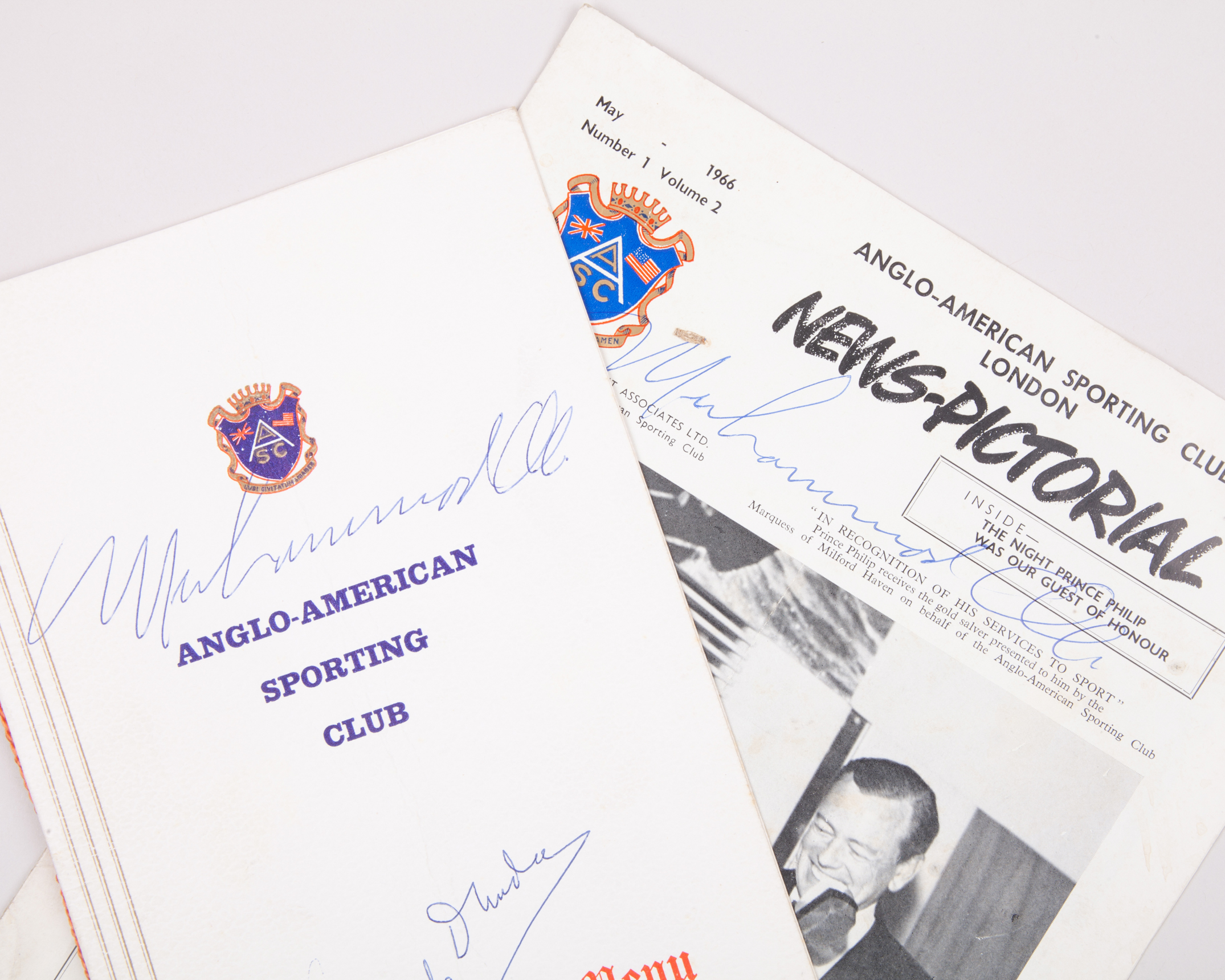 Muhammad Ali an Anglo-American Sporting Club autographed menu, 9th May 1966, the cover autographed by Muhammad Ali and Angelo Dundee, another dated 1st November 1965, the front cover bearing seven autographs including Rocky Marciano, Charlie Chester, another dated 11th October 1965, autographed, A News Pictorial magazine autographed by Muhammad Ali and a collection of other menus etc