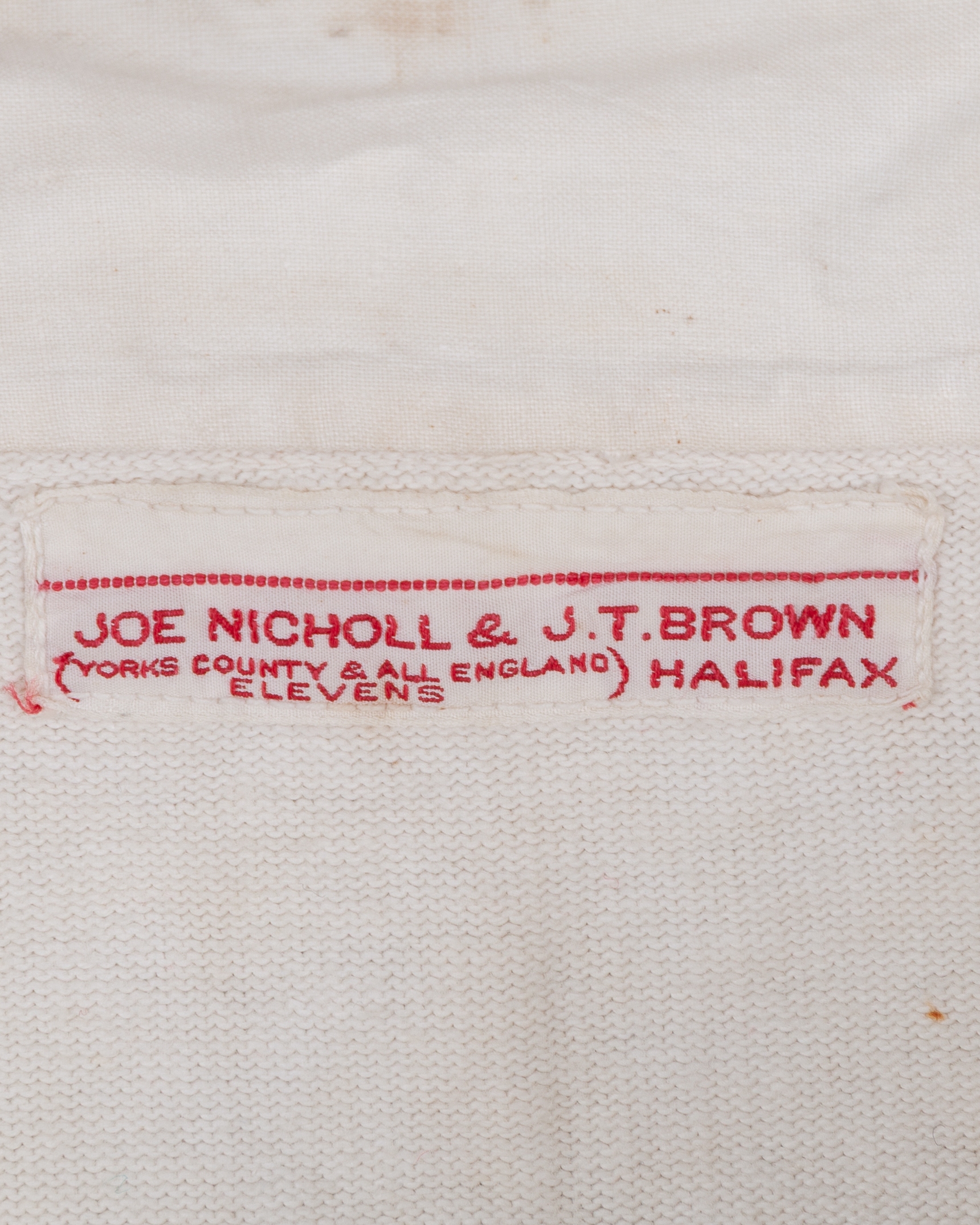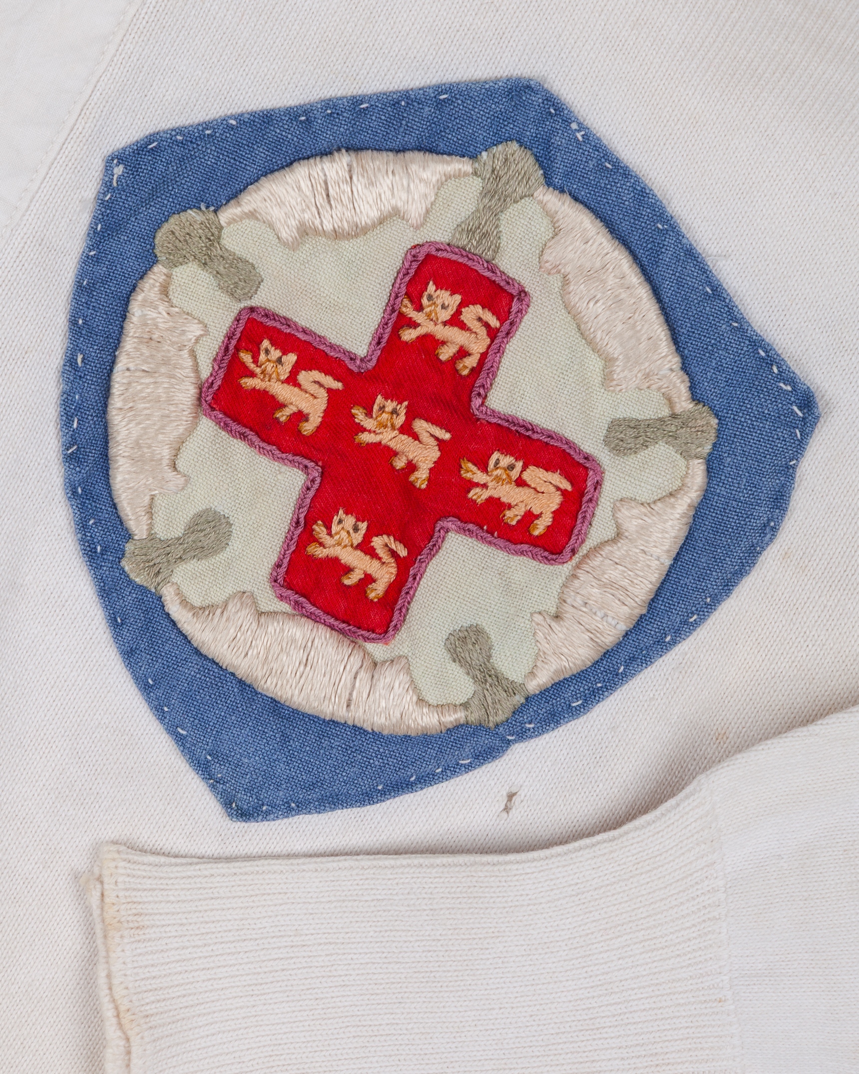 A very rare white Manningham FC long-sleeved rugby league shirt, c.1900, by Joe Nicholl & J.T. Brown (Yorks County & all England elevens) Halifax, with button-up collar and embroidered cloth badge, staining and discolouration, with top and third button missing