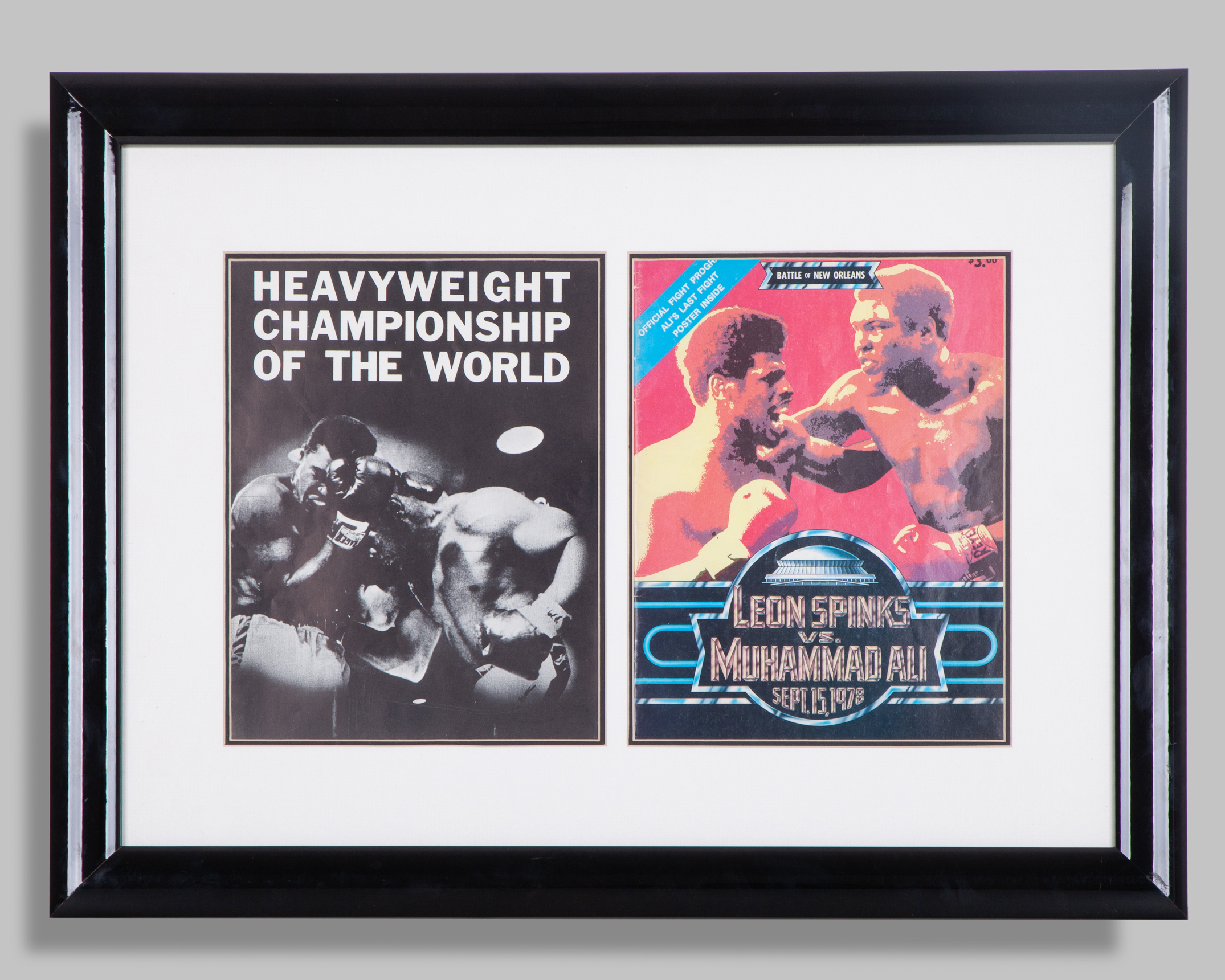 Muhammad Ali v. Sonny Liston programme 25th May 1965, Leon Spinks v. Muhammad Ali programme 15th September 1978, framed and glazed, 63 x 47cm, frame has not been opened to check condition