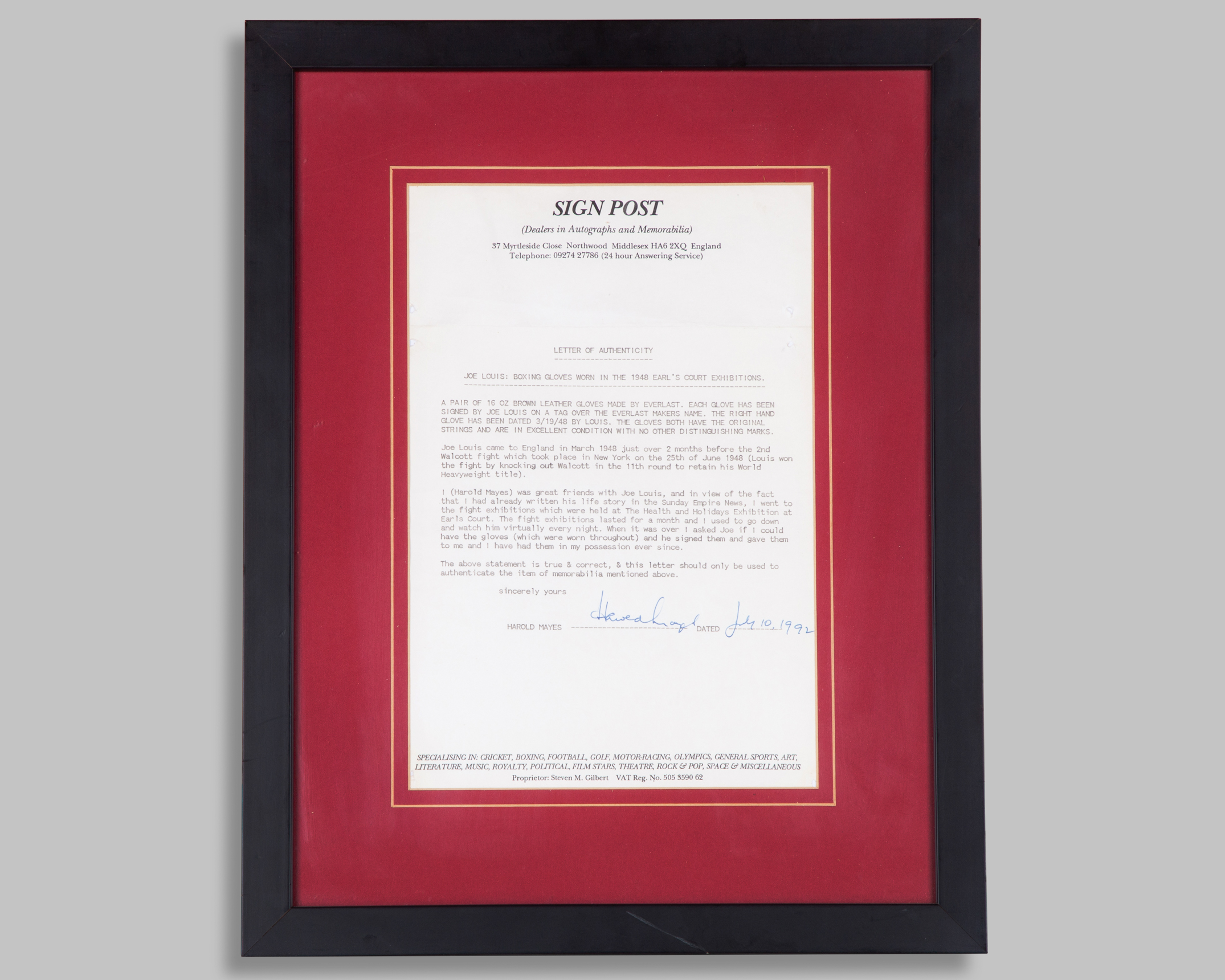 Joe Louis exhibition worn Everlast gloves Earls Court London, 1948, with framed and glazed Sign Post COA, with autographed tape over makers label, autographs completely faded, framed and glazed, 78 x 57cm