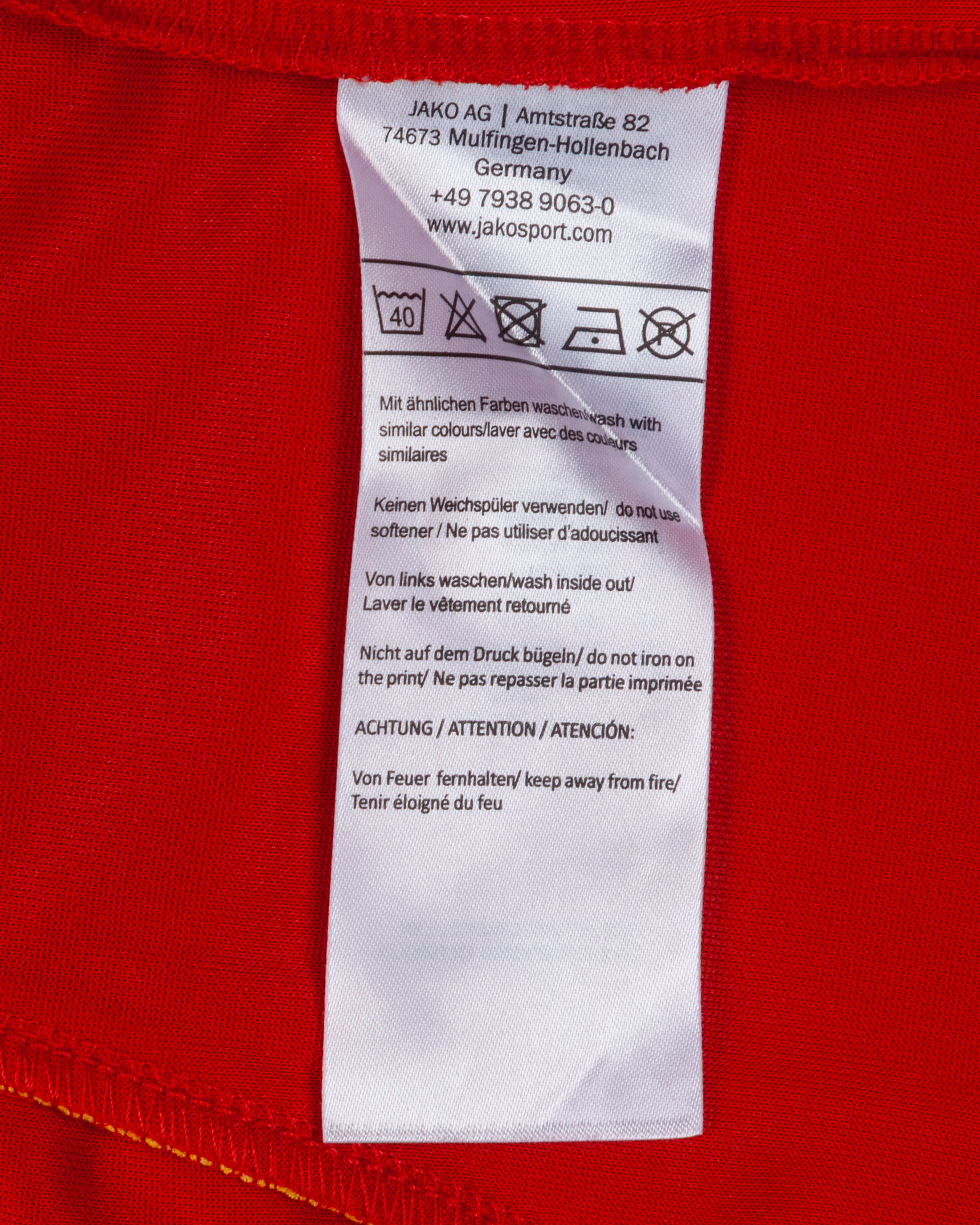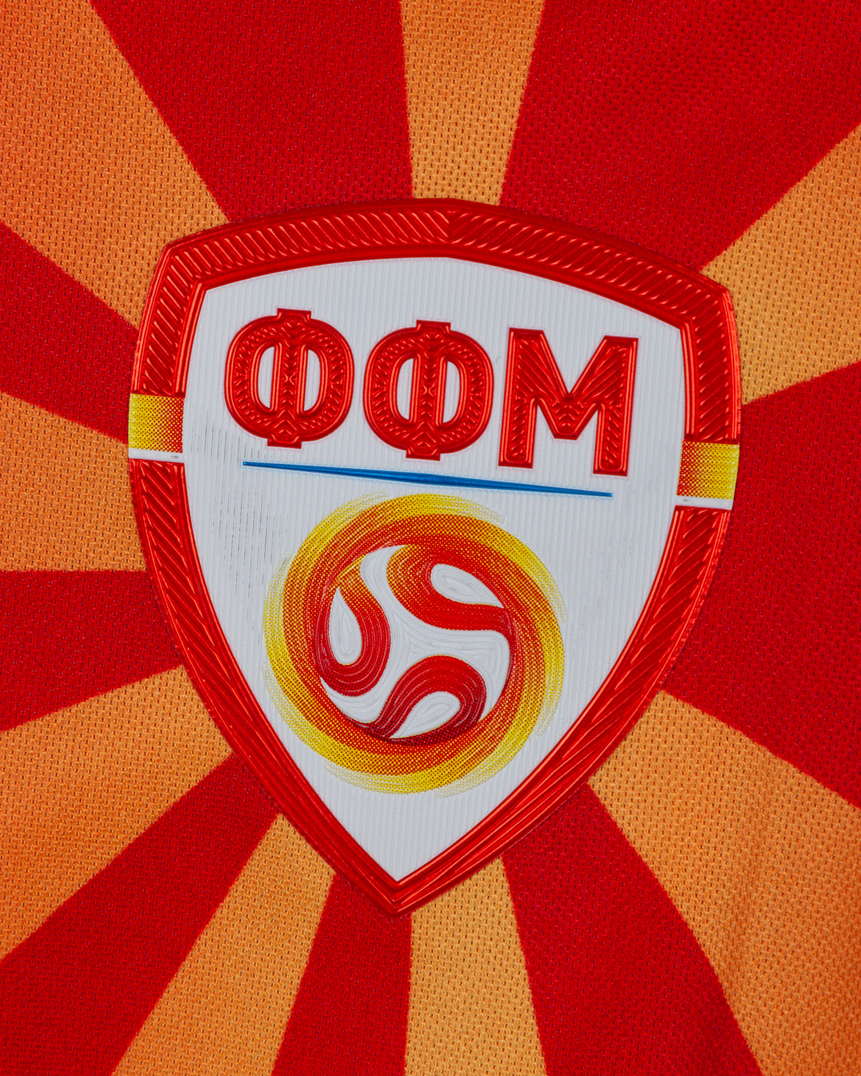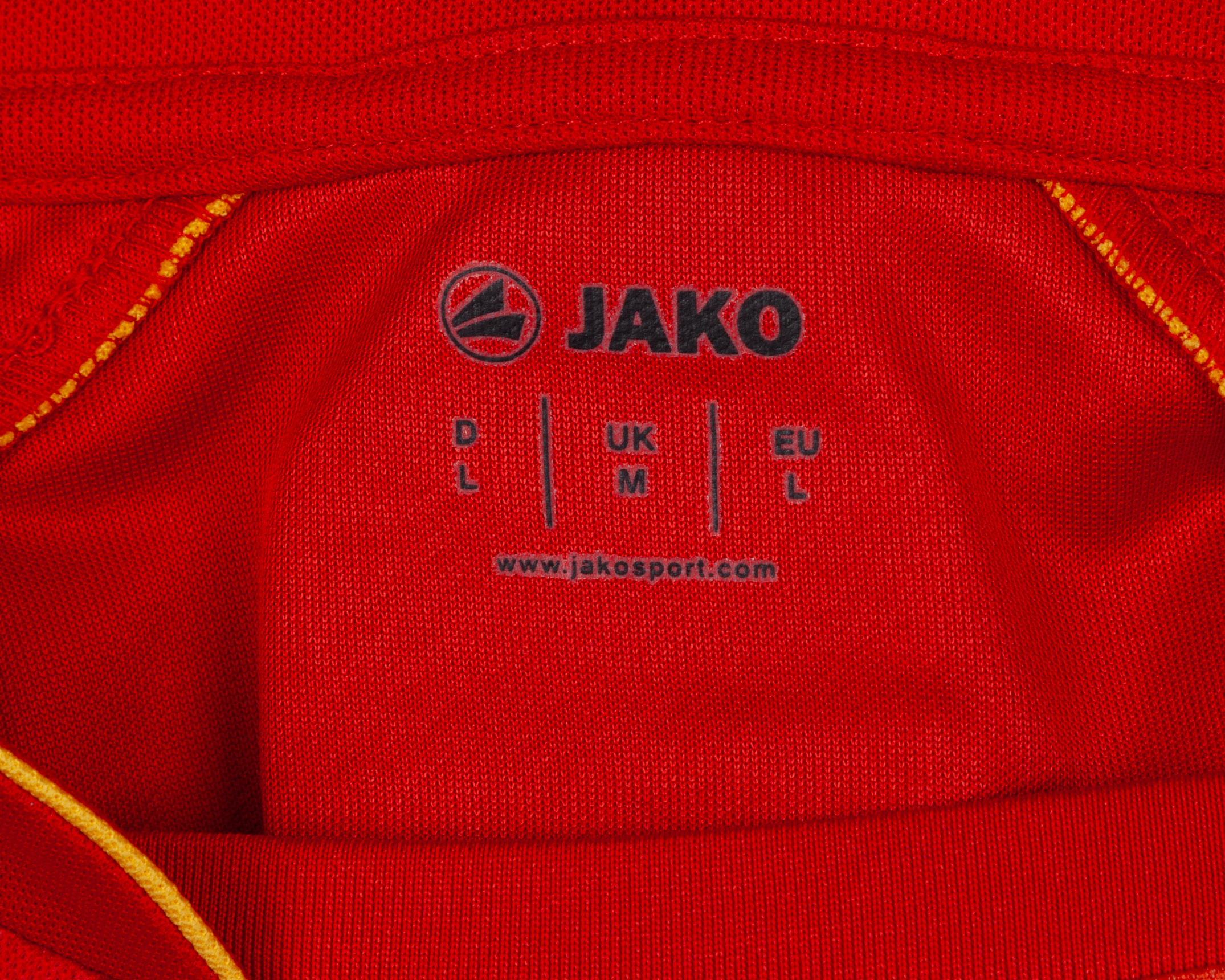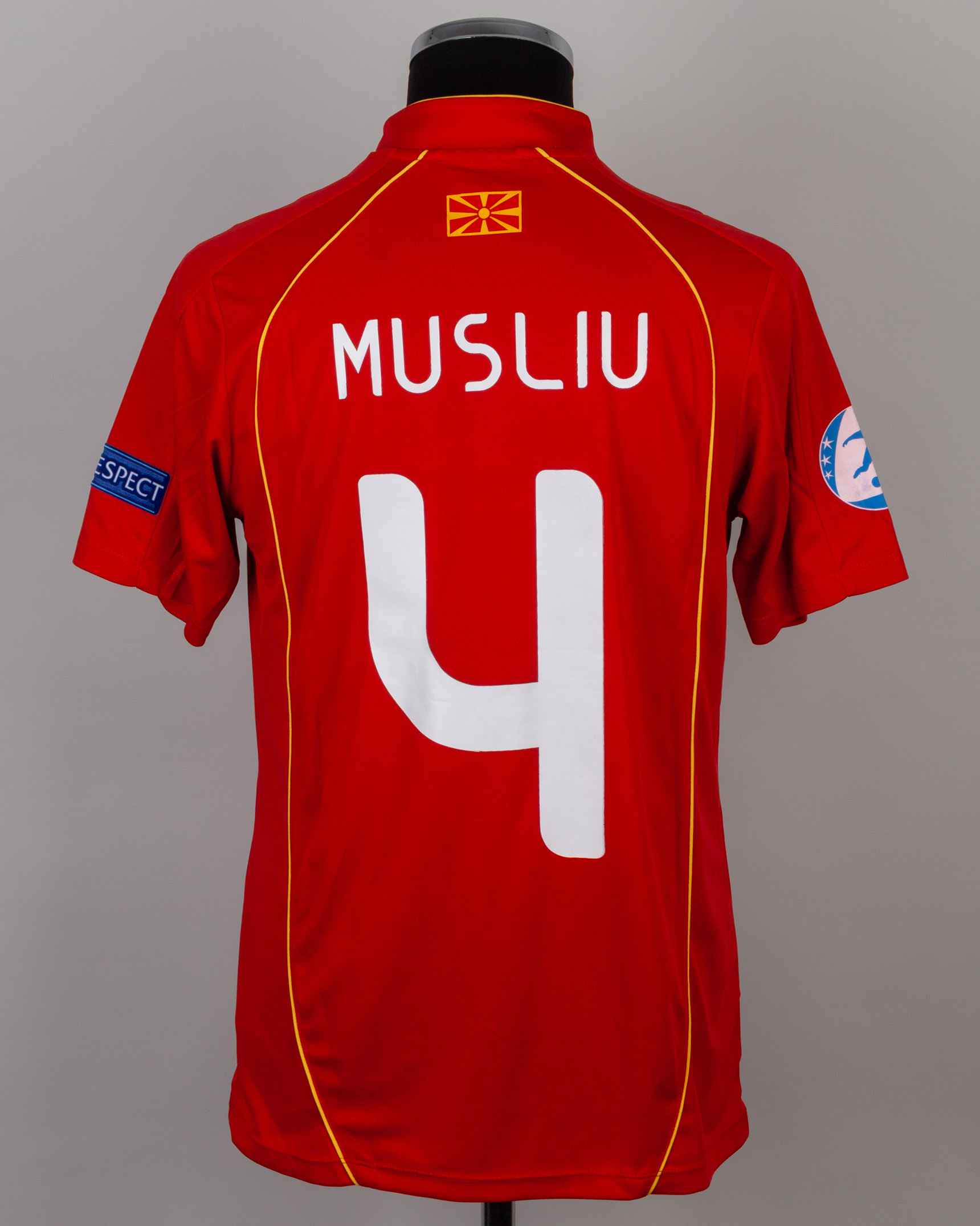 Musliu red and yellow No.4 North Macedonia Under-21 short-sleeved shirt, Jako, M, with crew-neck collar and printed badge, the reverse lettered MUSLIU, the right sleeve with Euros U-21 flash and the left with respect flash
