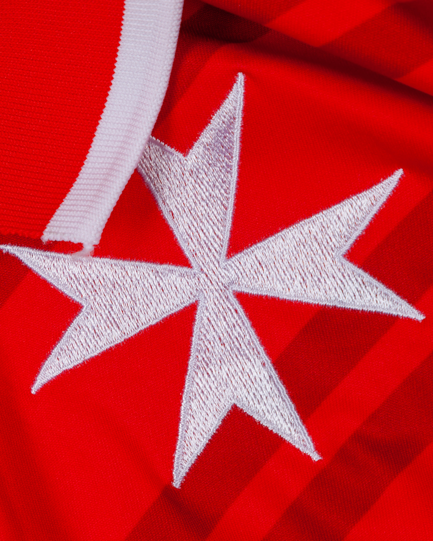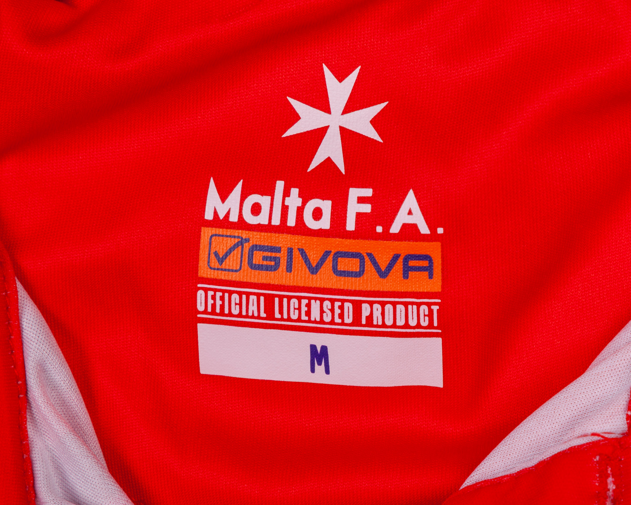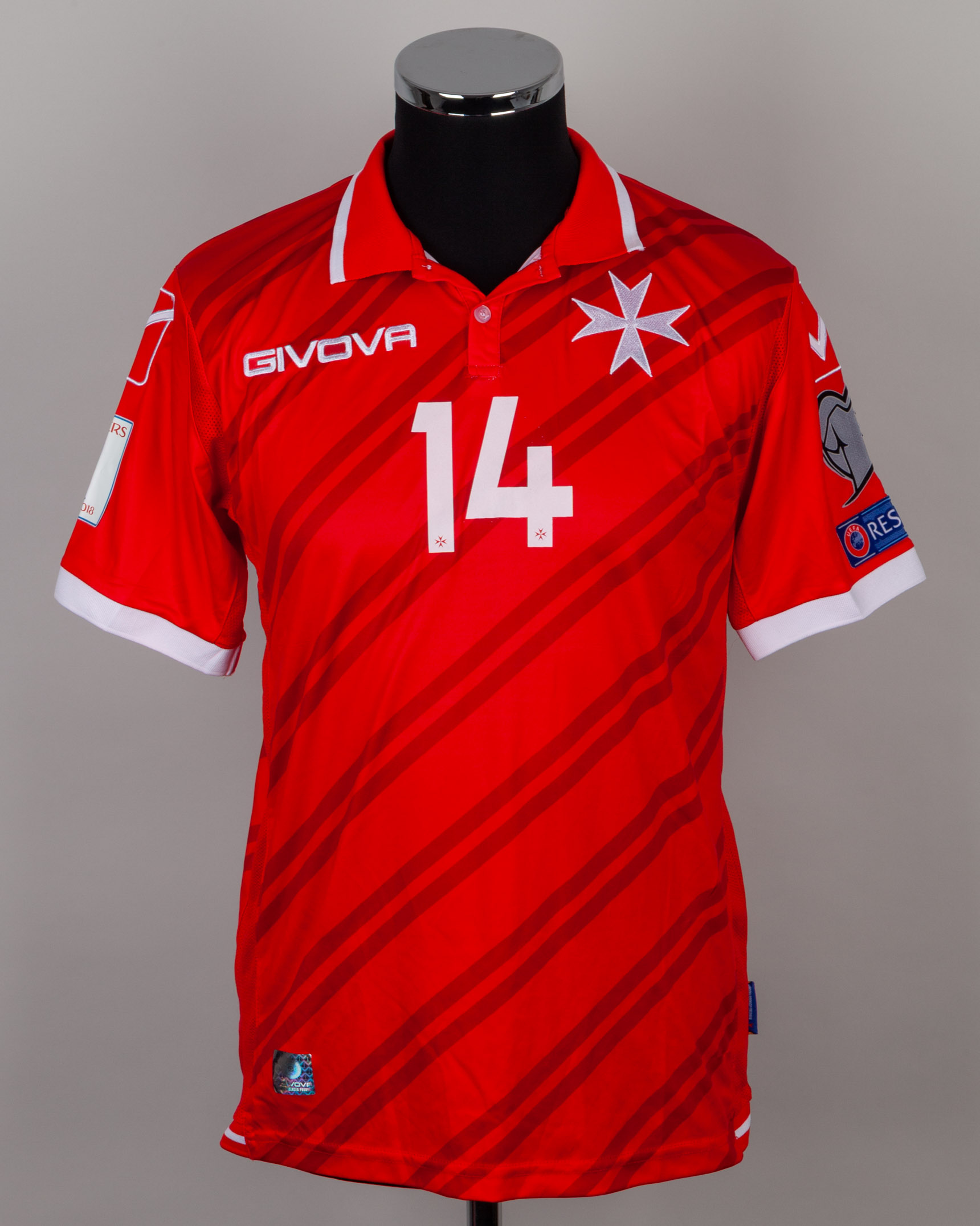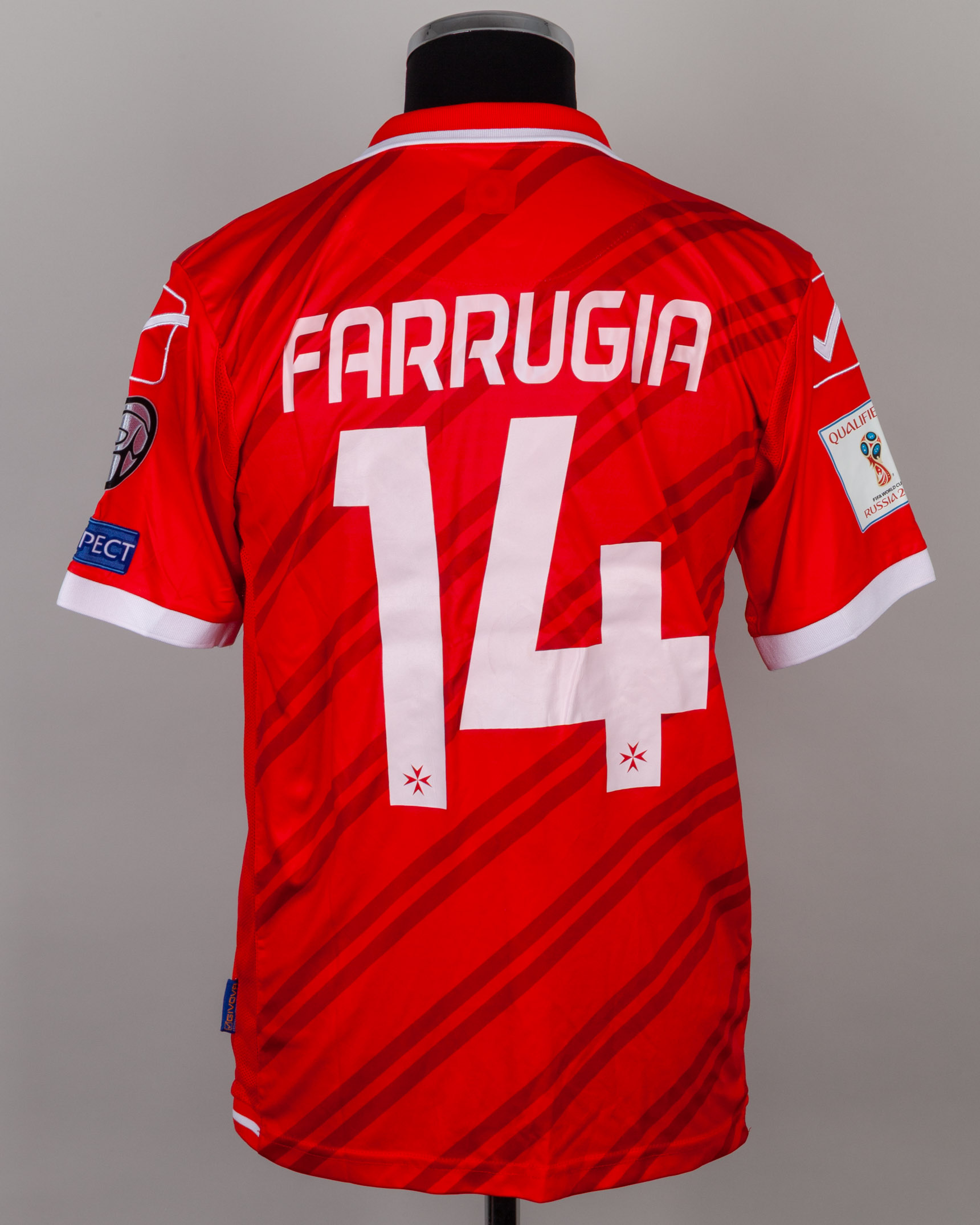 Jean-Paul Farrugia red No.14 Malta short-sleeved shirt, Givova, M, with buttoned-up collar and embroidered badge, the reverse lettered FARRUGIA, the right sleeve with qualifiers FIFA World Cup Russia 2018 and the left sleeve with respect flash