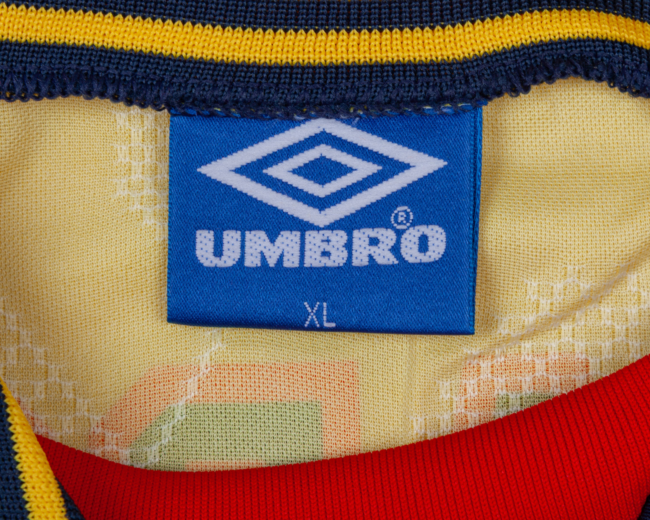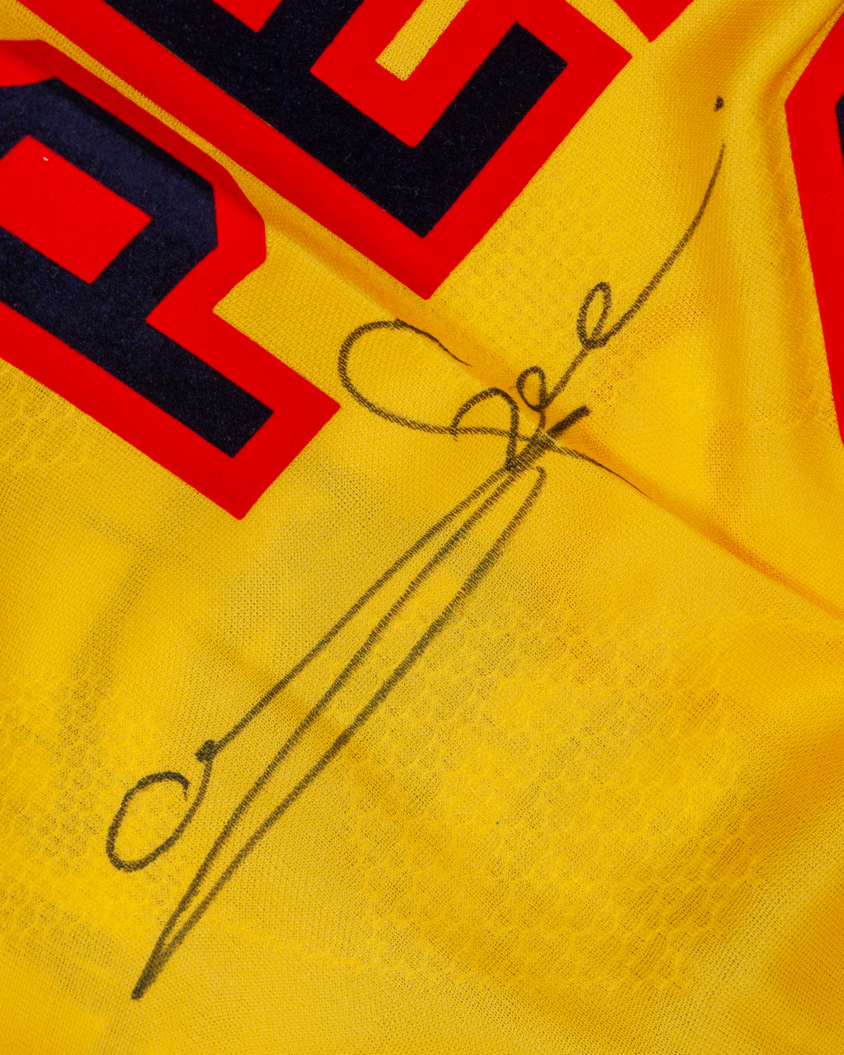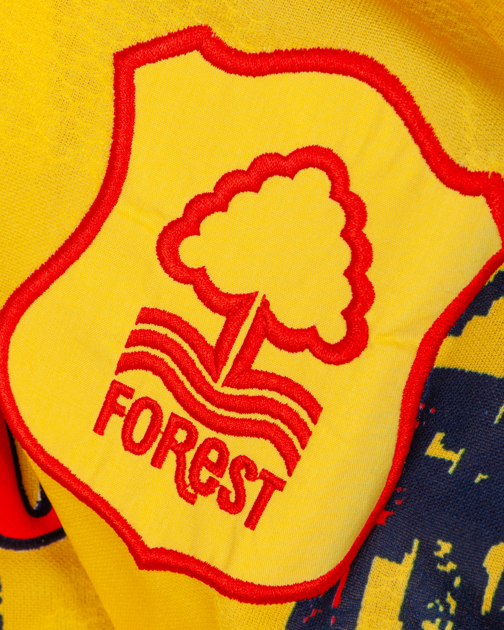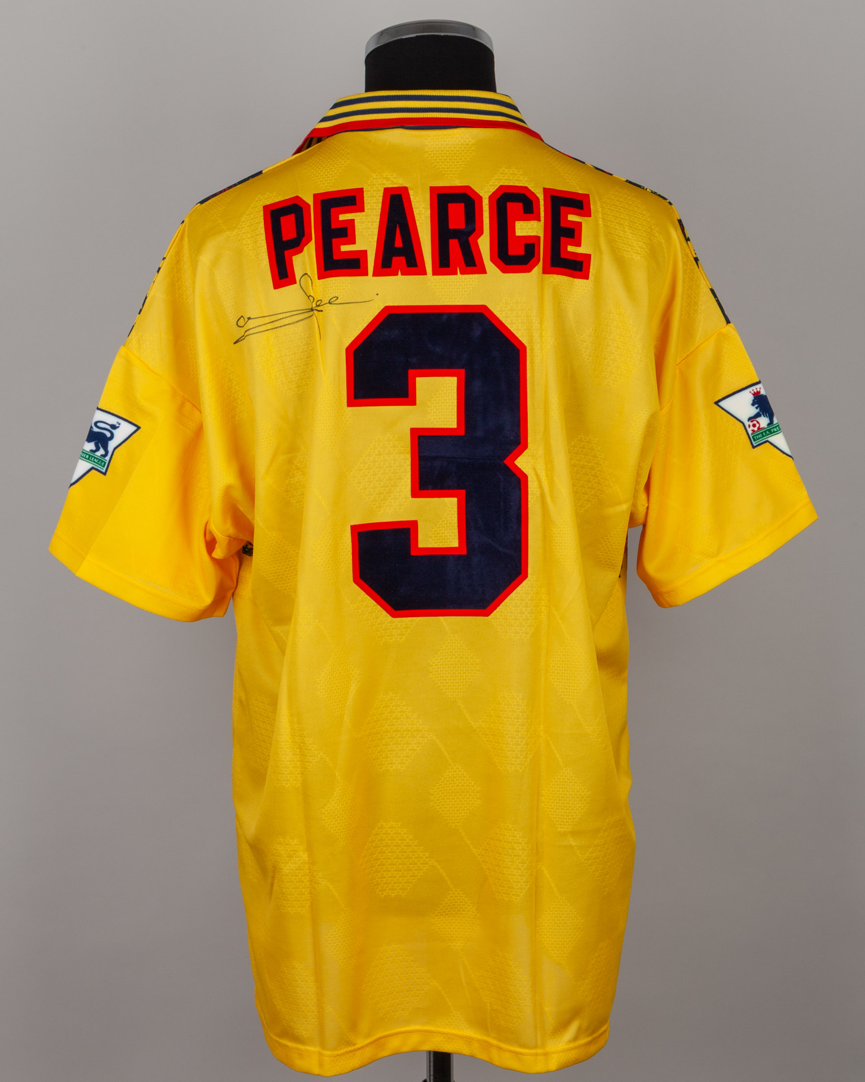 Stuart Pearce yellow, blue and red No.3 Nottingham Forest autographed short-sleeved shirt, Umbro, XL, with v-neck style collar and embroidered cloth badge inscribed FOREST, the reverse lettered PEARCE, the sleeves with The F.A. Premier League flashes, autographed on the back and front