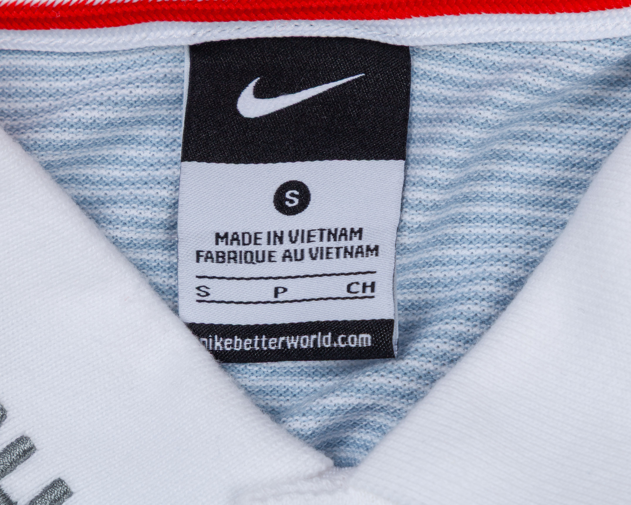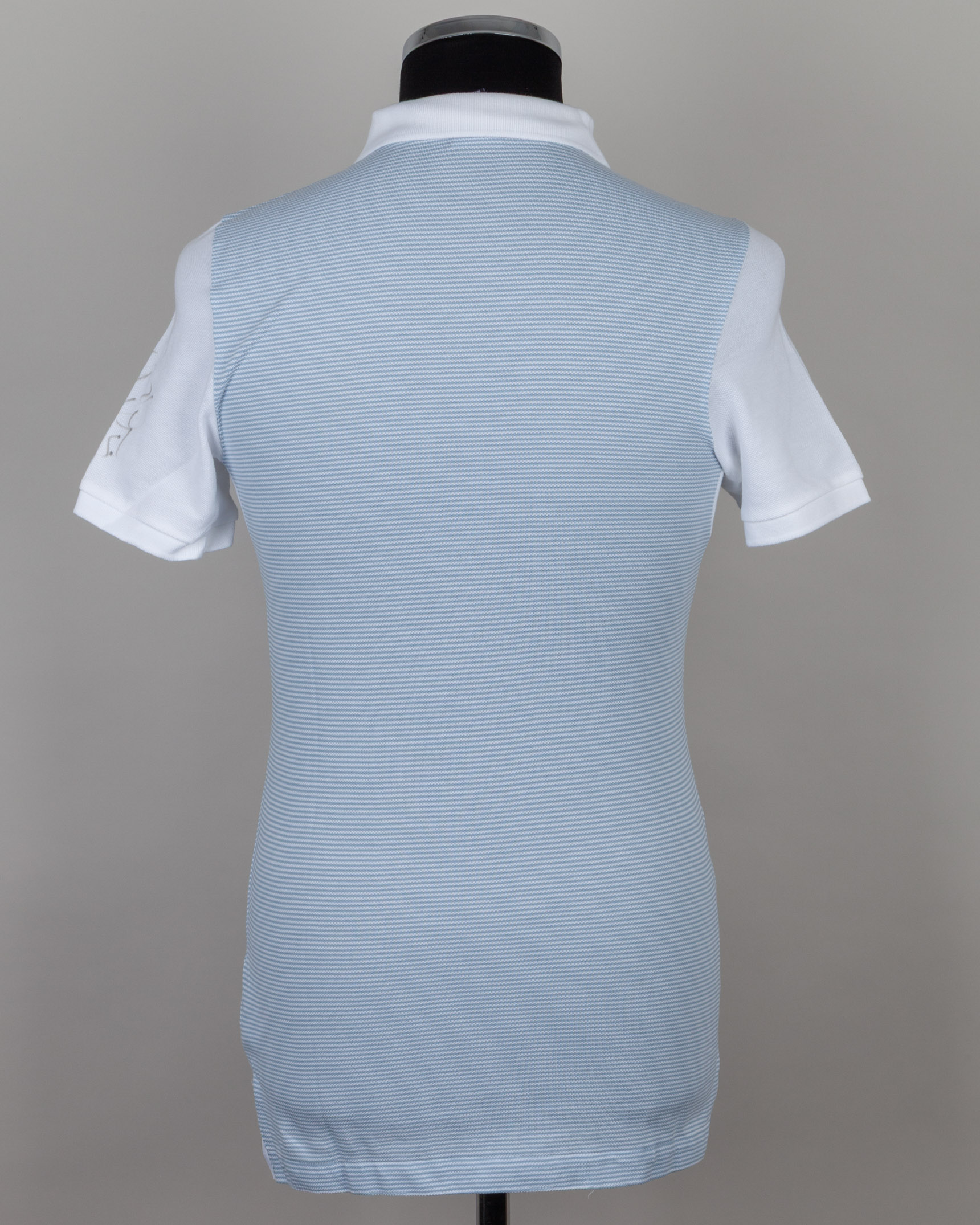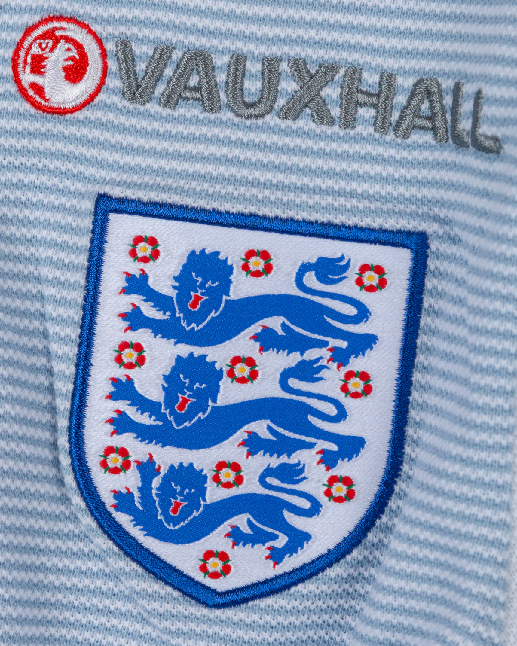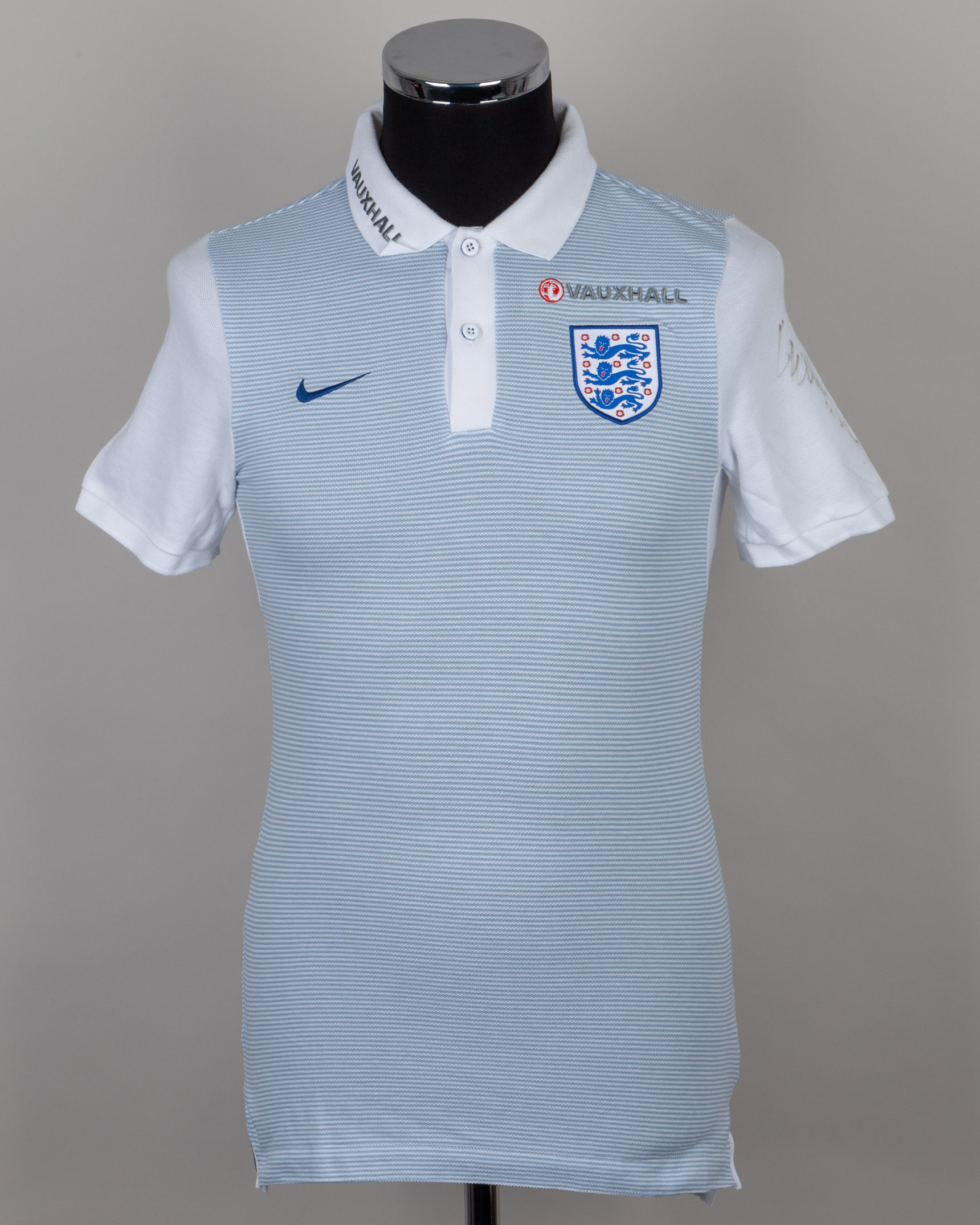 Blue and white England football autographed polo shirt, Nike, S, with button-up collar and embroidered cloth badge, the left sleeve autographed