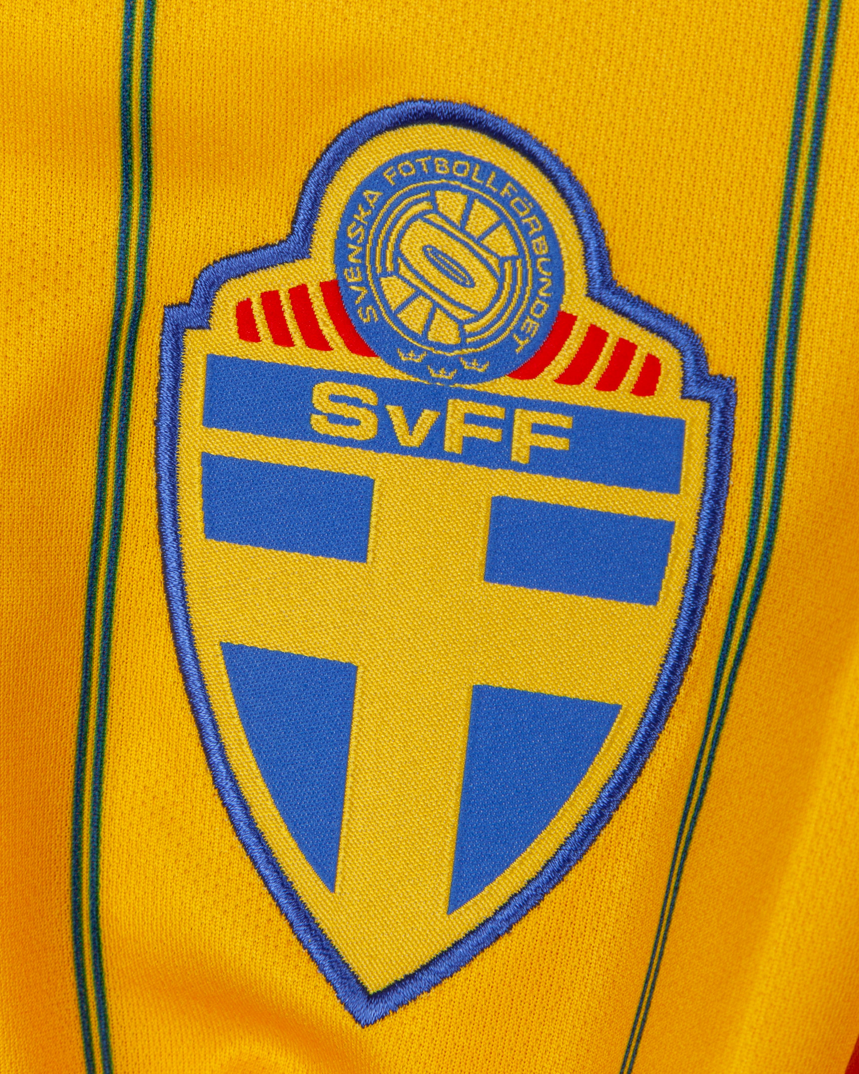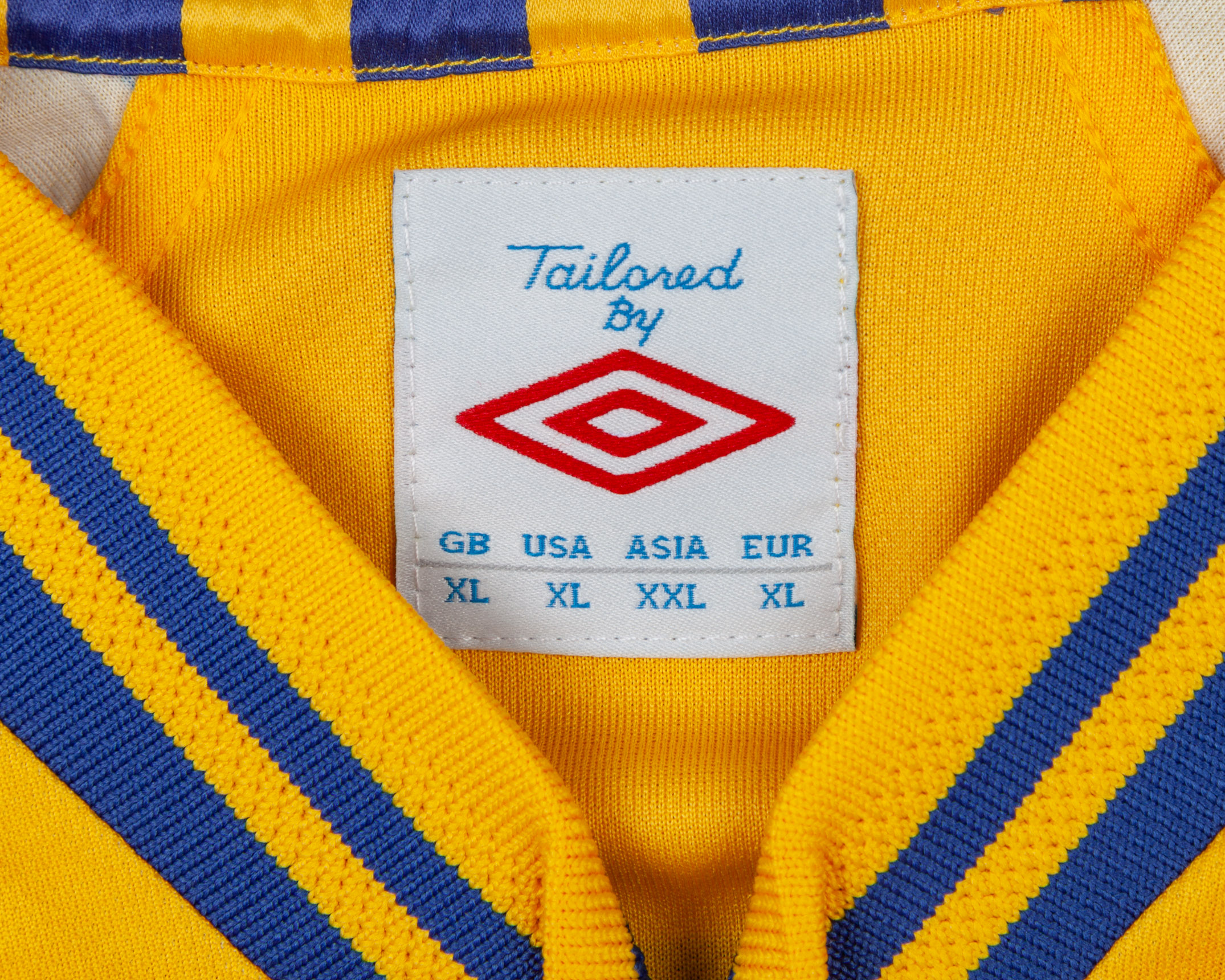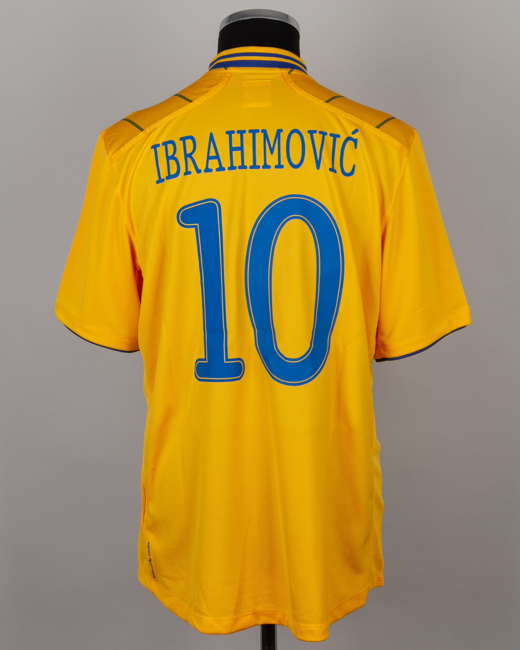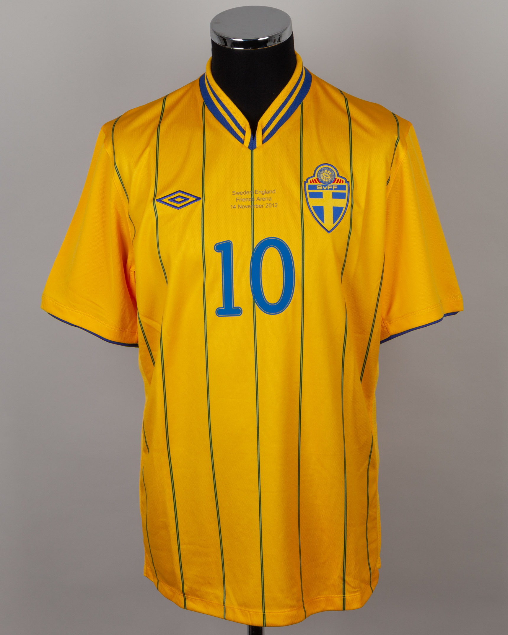 Zlatan Ibrahimovic yellow and blue No.10 Sweden v. England short-sleeved shirt, 2012, Umbro, XL, with v-neck collar and embroidered cloth badge inscribed SvFF SVENSKA FOTBOLLFORBUNDET, with Sweden-England Friends Arena 14 November 2012, the reverse lettered IBRAHIMOVIC