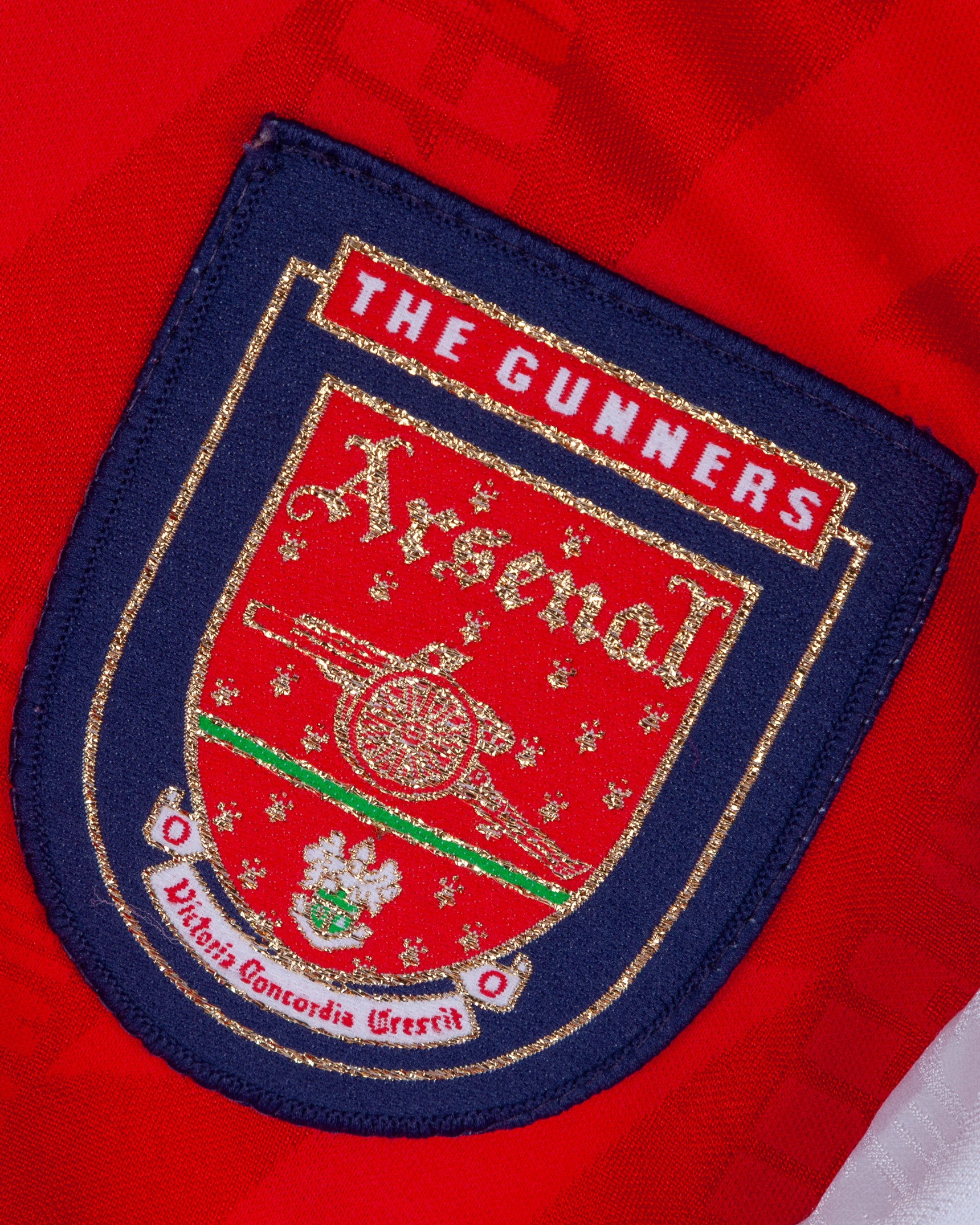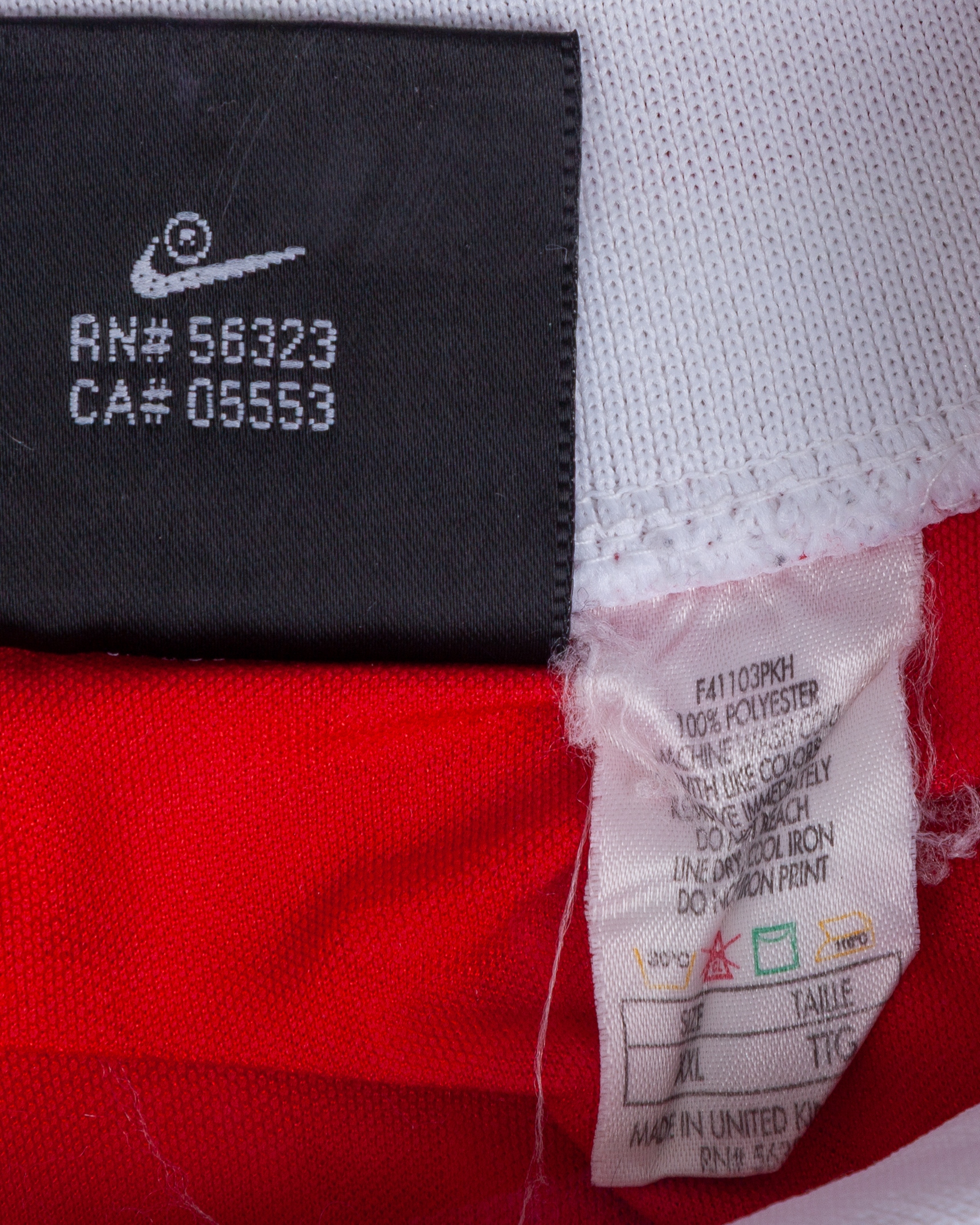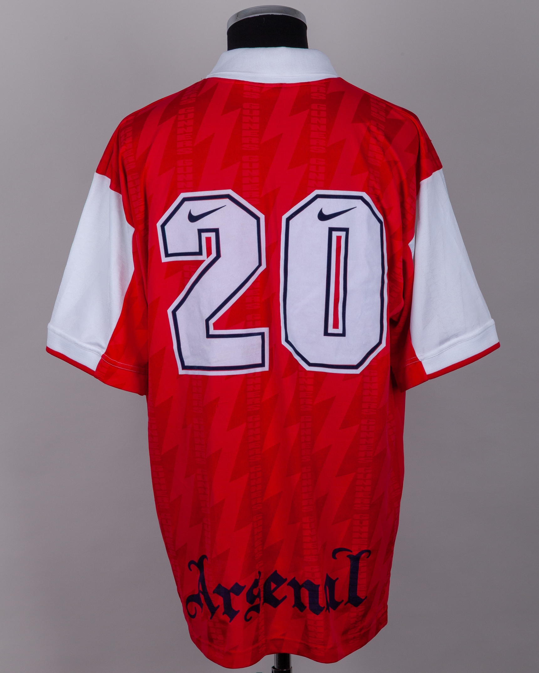 John Hartson Autographed replica red and white No.20 Arsenal short-sleeved shirt, Nike, XXL, with crew-neck collar and embroidered cloth badge inscribed THE GUNNERS Arsenal Victoria Concordia Crescit