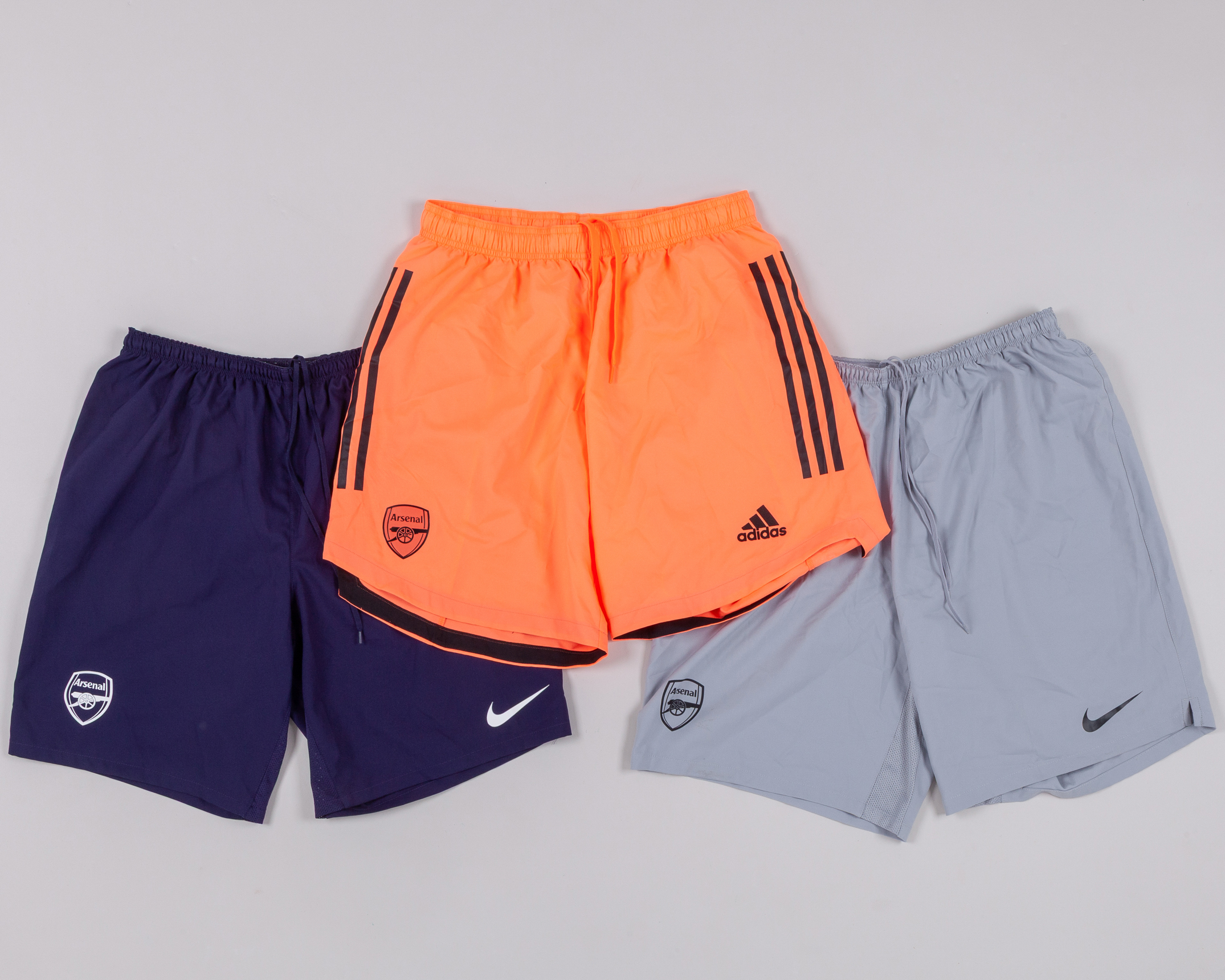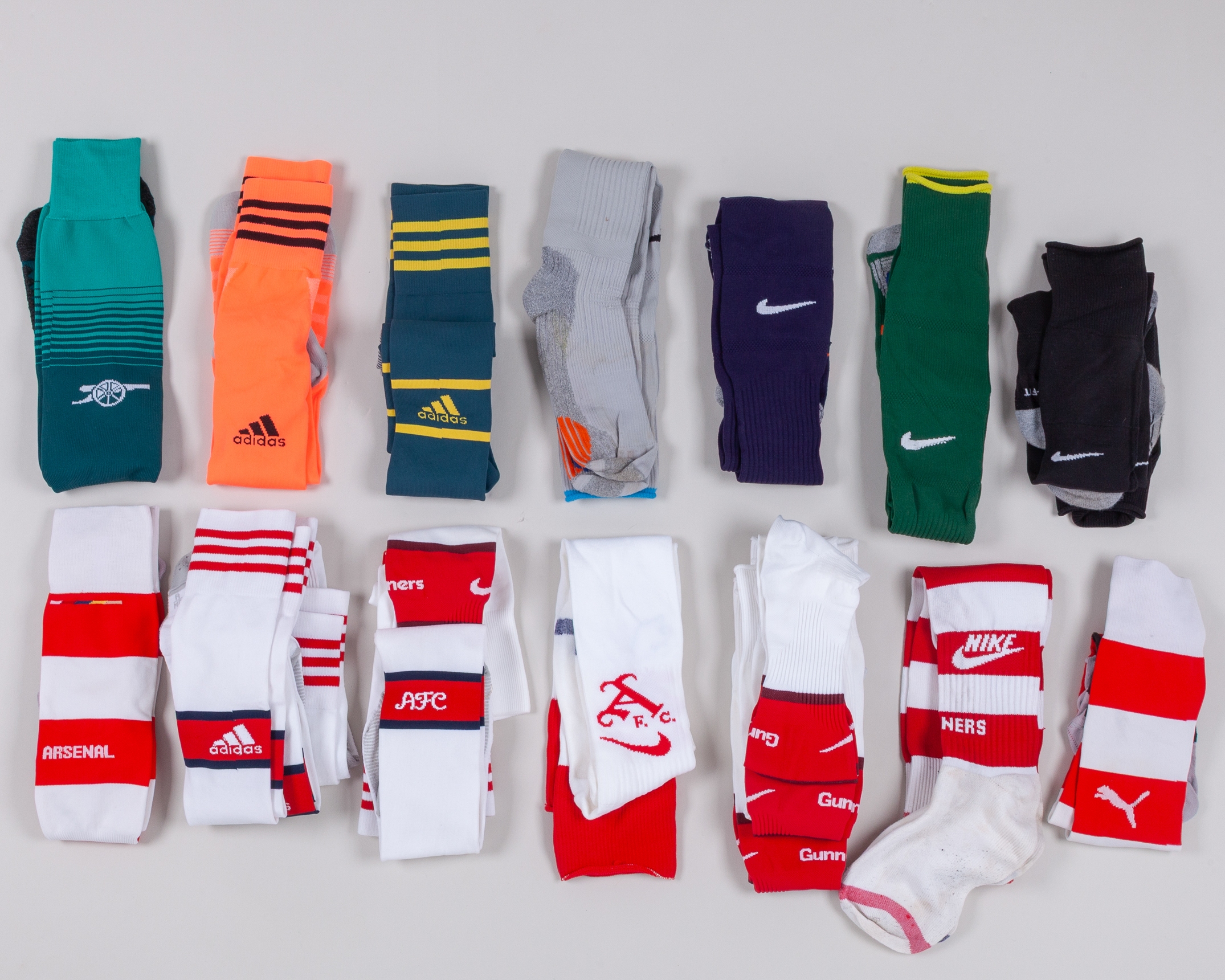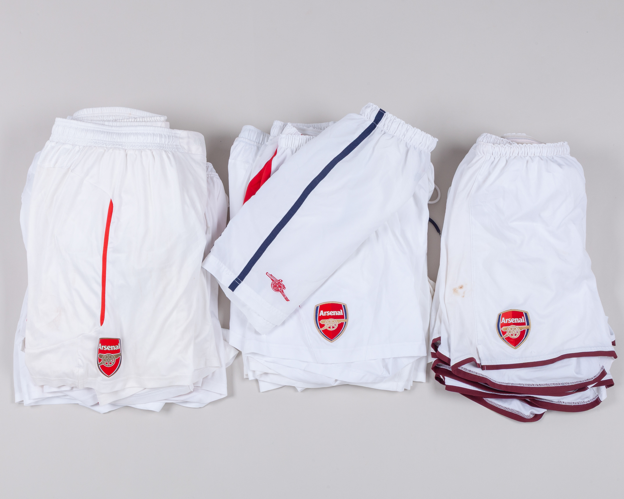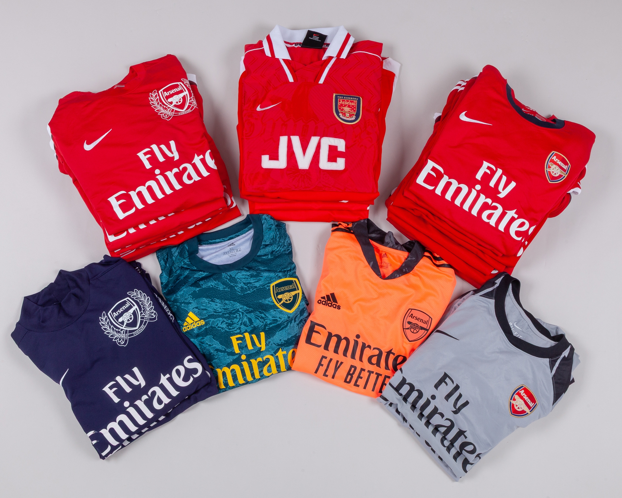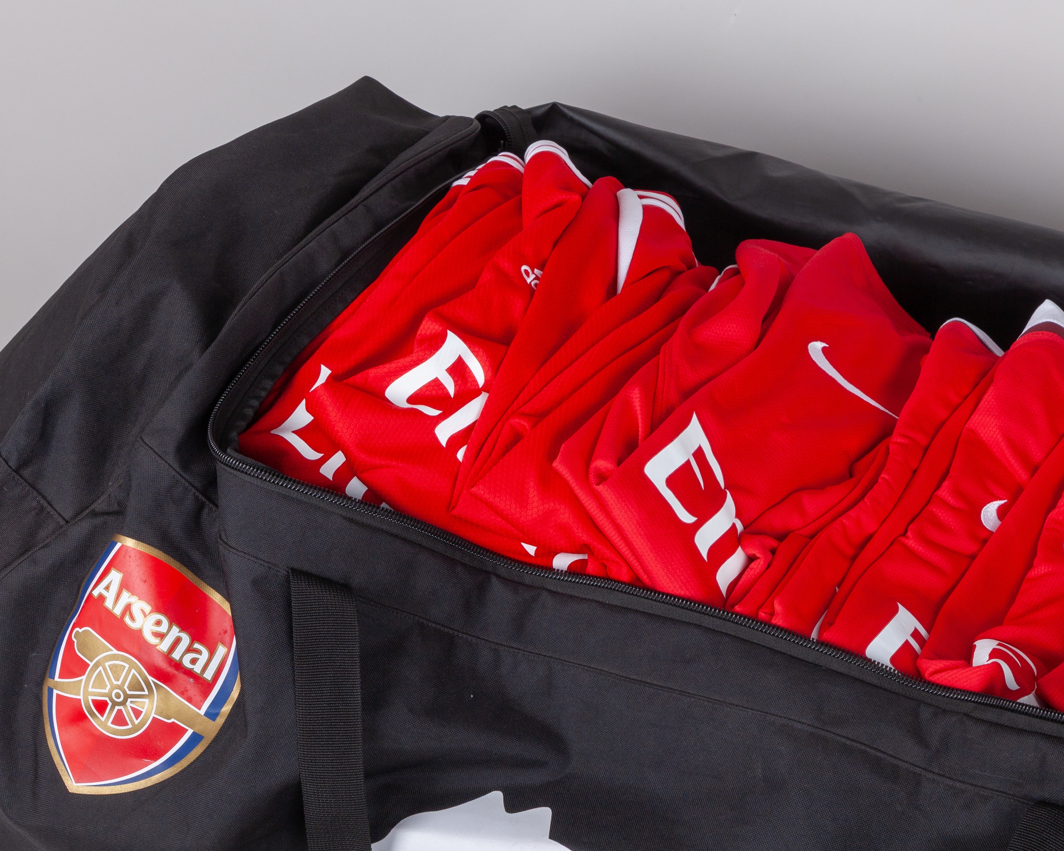 Collection of Arsenal equipment bags and kits, including approximately twenty-eight various shirts of various sizes and numbers, approximately thirty-three pairs of shorts and approximately twenty-one pairs of socks, with four equipment bags, two with Arsenal printed badges, staining (a lot)