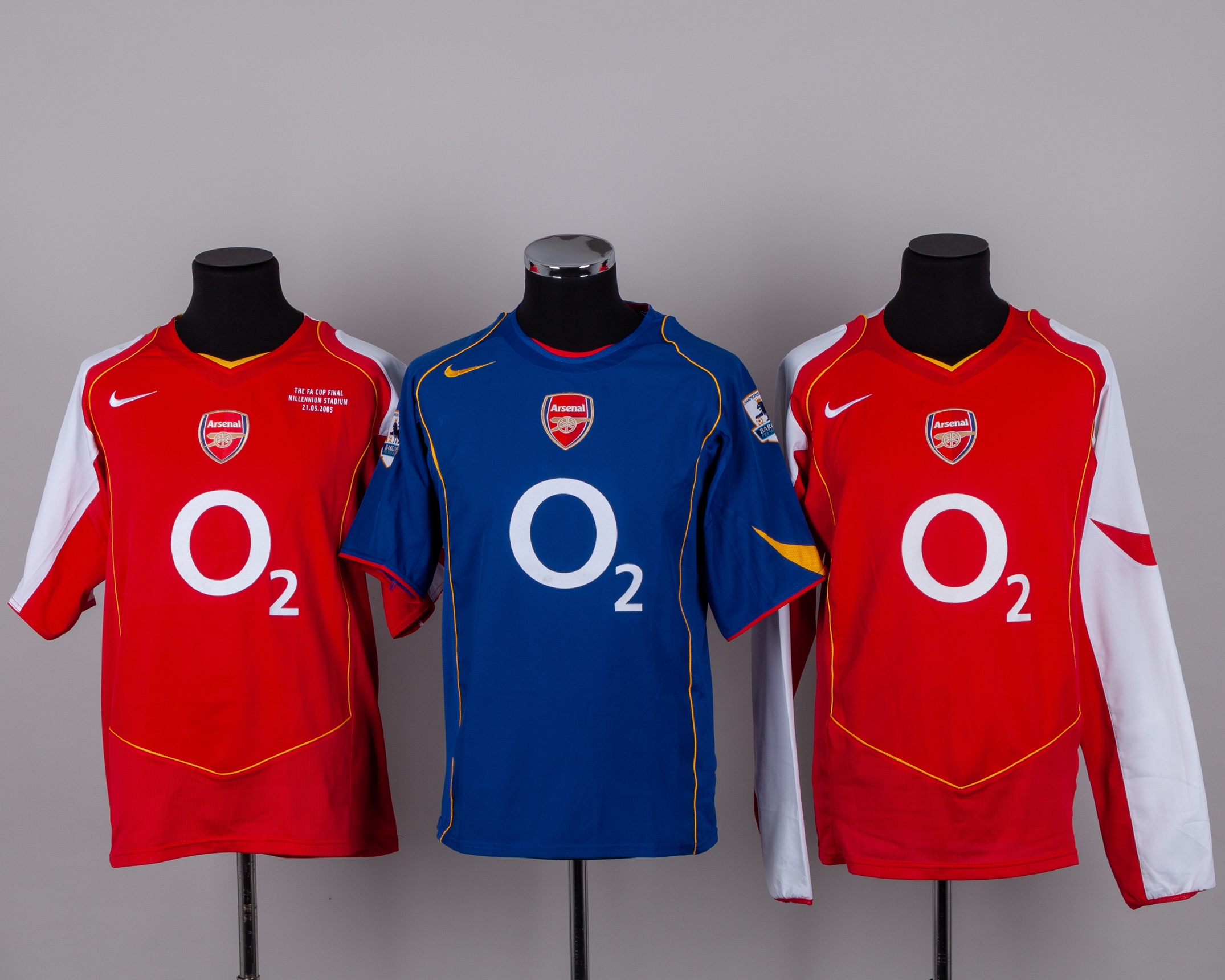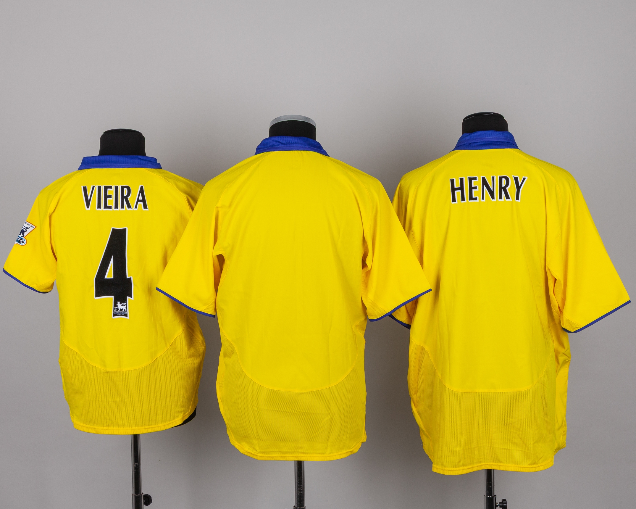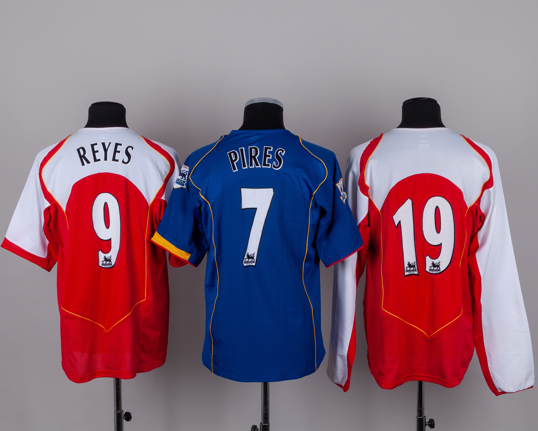 Six various Arsenal early 2000's shirts, including Antonio Reyes red and white No.9 Arsenal short-sleeved shirt with THE FA CUP FINAL MILLENIUM STADIUM 21.05.2005 decal, staining and number torn, red and white No.19 Arsenal long-sleeved shirt, Robert Pires blue No.7 short-sleeved shirt, Patrick Viera yellow No.4 Arsenal short-sleeved shirt, XL but appears shrunk, Thierry Henry Arsenal short-sleeved shirt, without number, yellow Arsenal short-sleeved shirt (6)