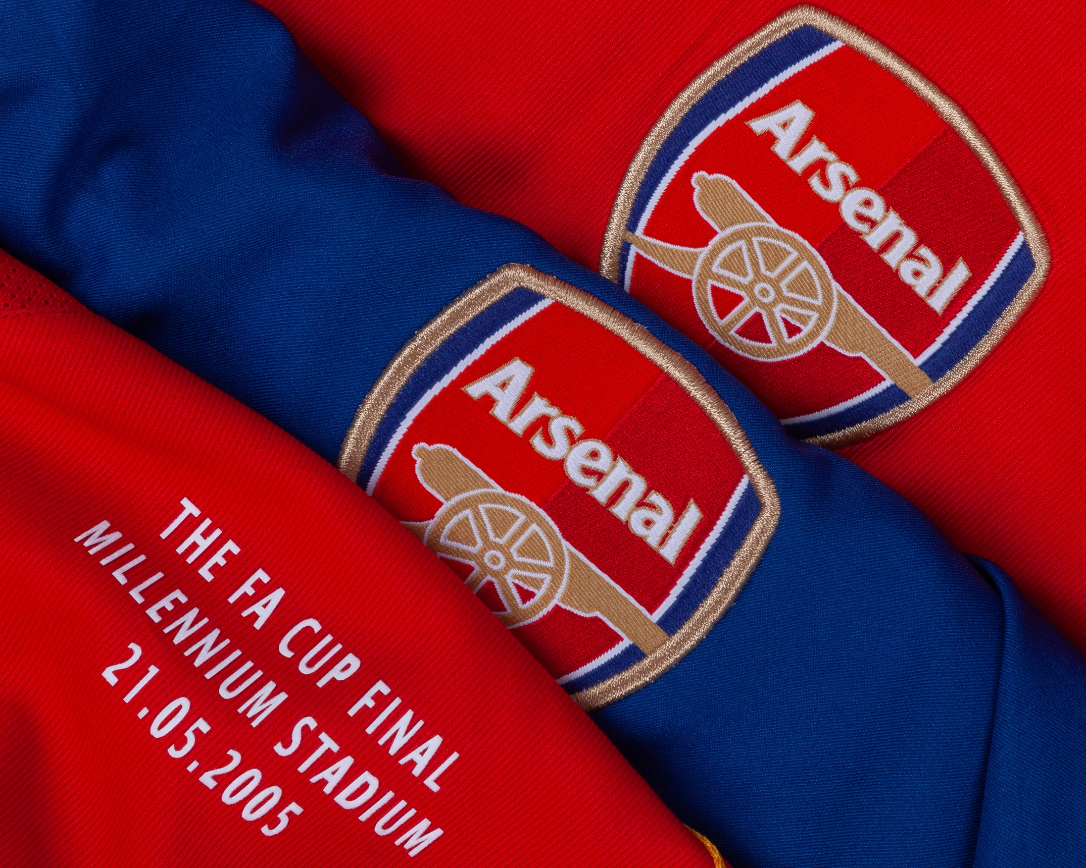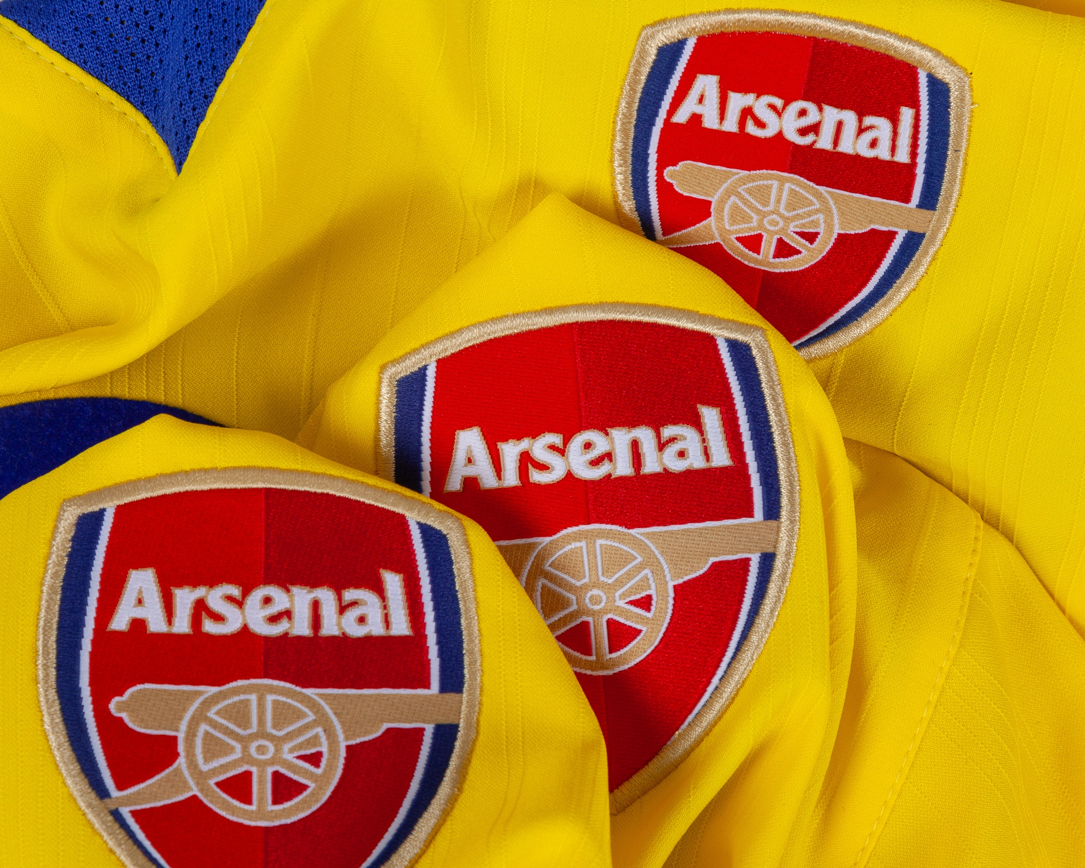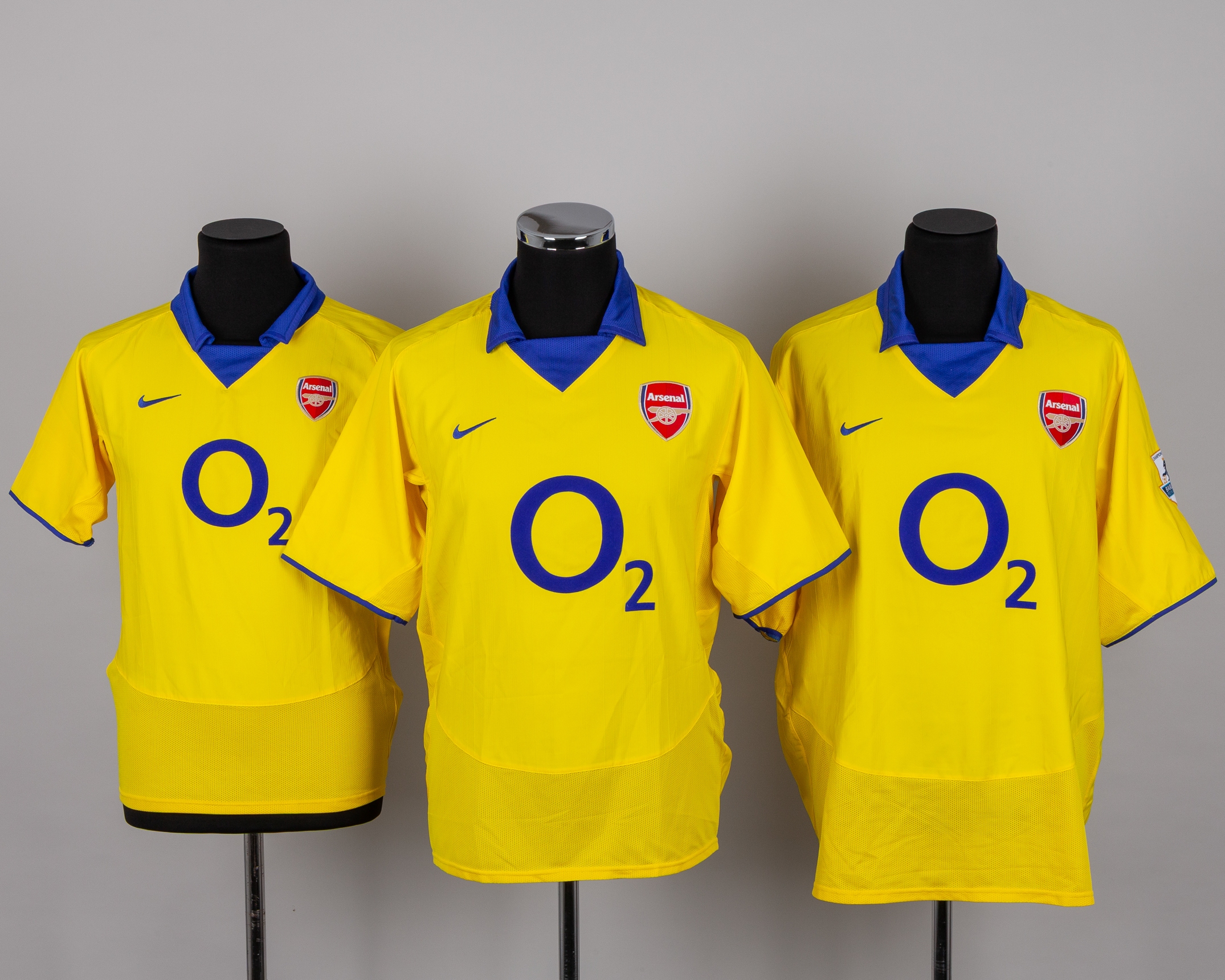 Six various Arsenal early 2000's shirts, including Antonio Reyes red and white No.9 Arsenal short-sleeved shirt with THE FA CUP FINAL MILLENIUM STADIUM 21.05.2005 decal, staining and number torn, red and white No.19 Arsenal long-sleeved shirt, Robert Pires blue No.7 short-sleeved shirt, Patrick Viera yellow No.4 Arsenal short-sleeved shirt, XL but appears shrunk, Thierry Henry Arsenal short-sleeved shirt, without number, yellow Arsenal short-sleeved shirt (6)