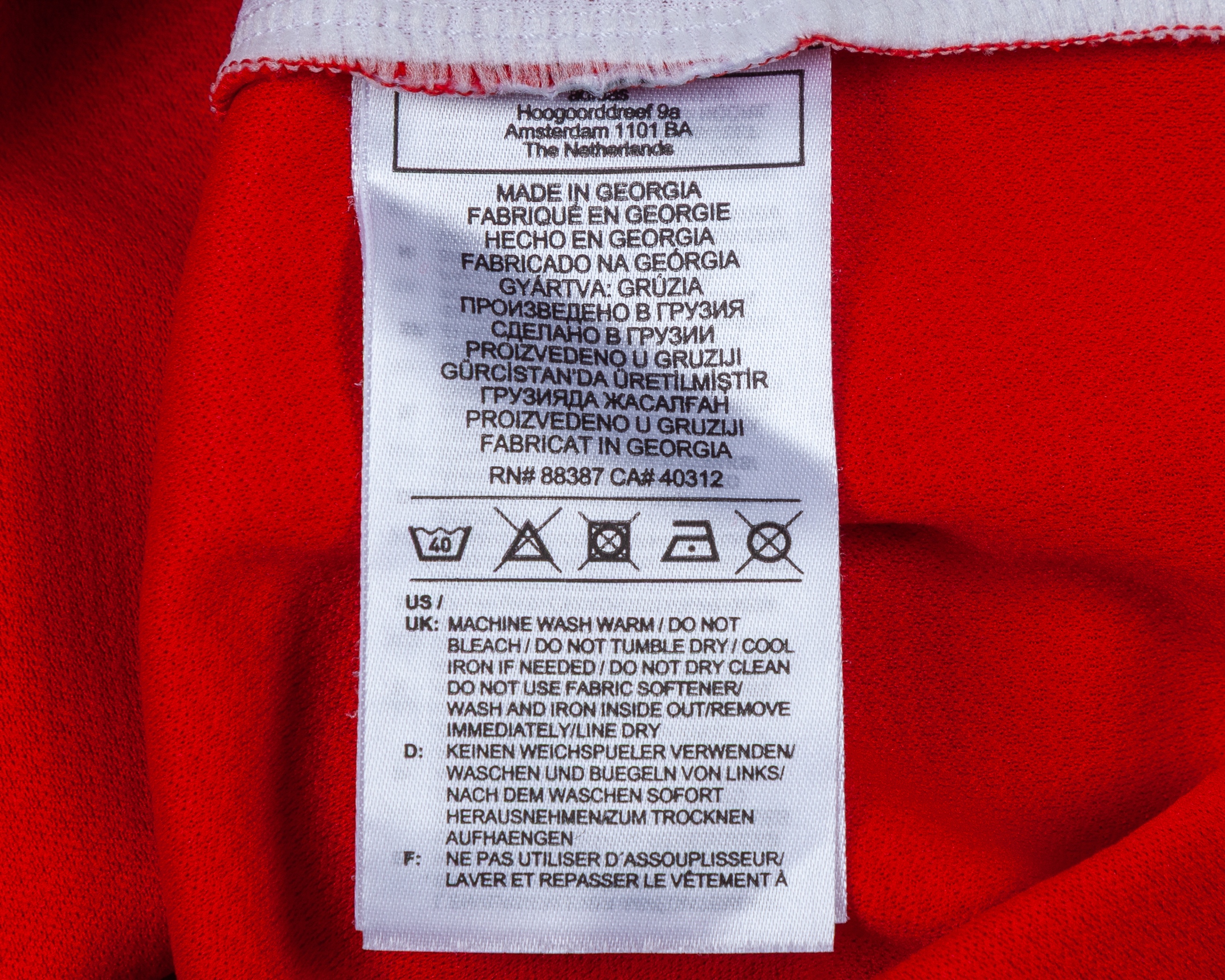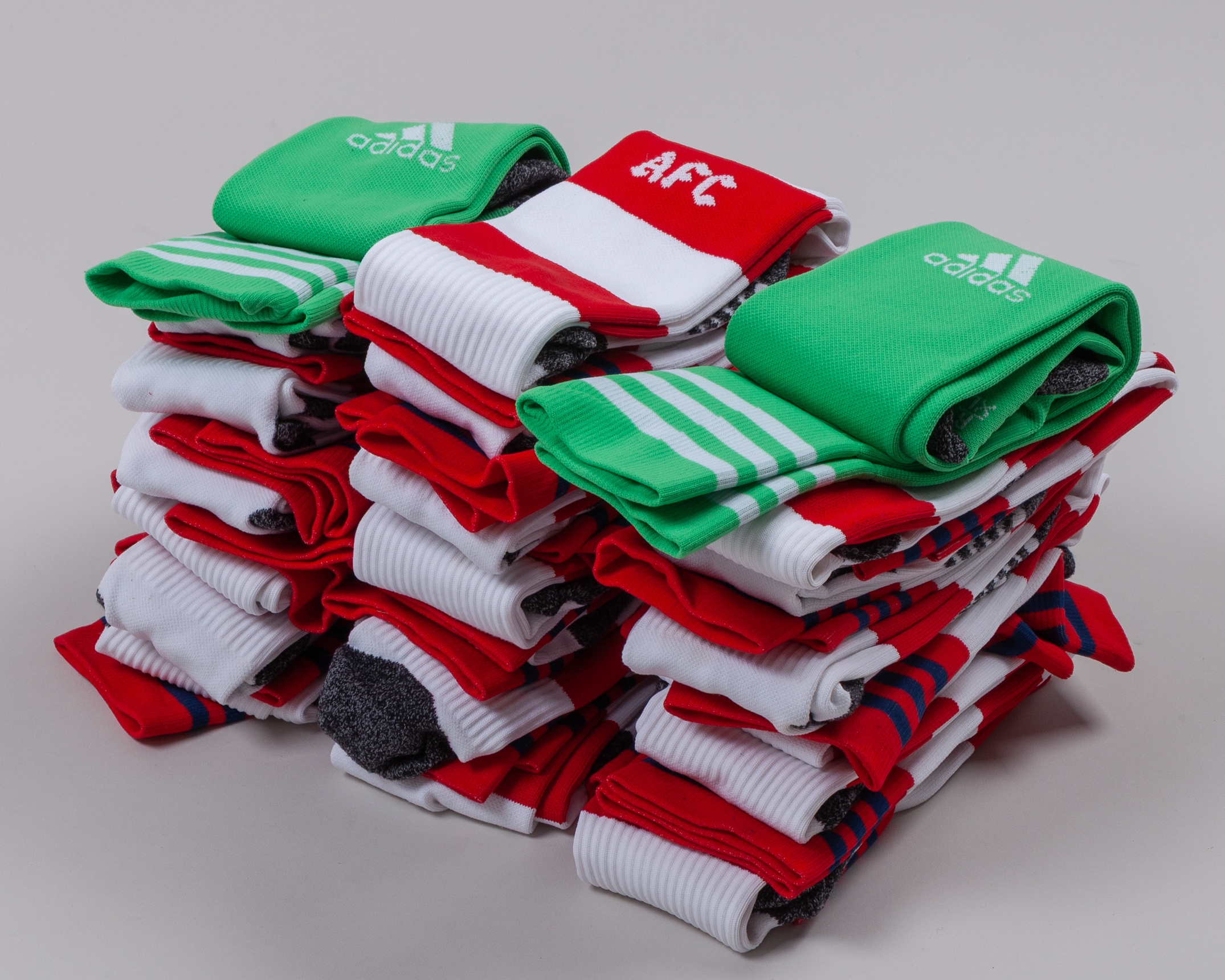 Sixteen red and white Arsenal short-sleeved shirts, 2021-22, Adidas, various sizes, with v-neck collar and embroidered cloth badge inscribed Arsenal, numbered 2, 3, 4, 5, 7, 9, 10, 14, 15, 16, 17, 19, 20, 21, 23 and 25, with thirteen pairs of matching white shorts, with embroidered cloth badge inscribed Arsenal and nineteen matching pairs of socks, two green Arsenal short-sleeved goalkeepers shirts, Adidas, various sizes, with v-neck collar and embroidered badge, numbered 1 and 13, with two matching pairs of green shorts, with embroidered badge and two matching pairs of socks, some staining, (a lot)