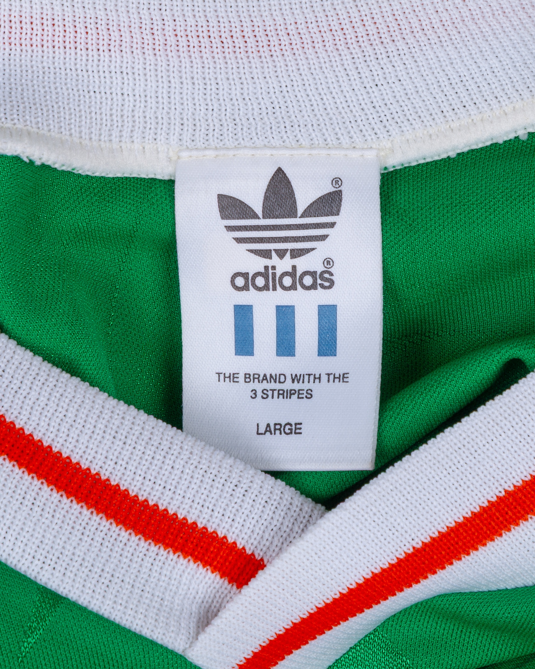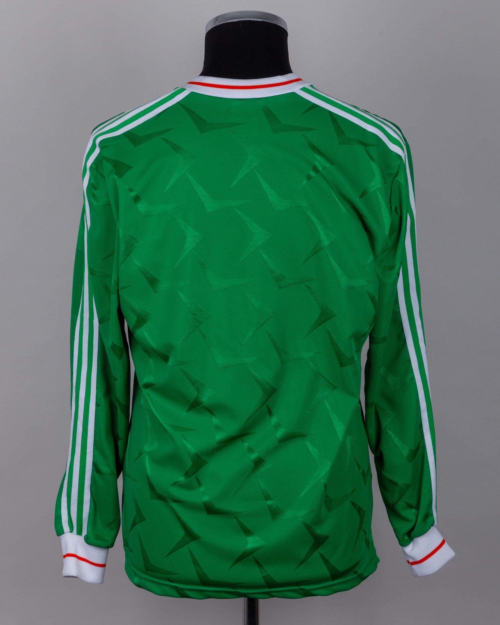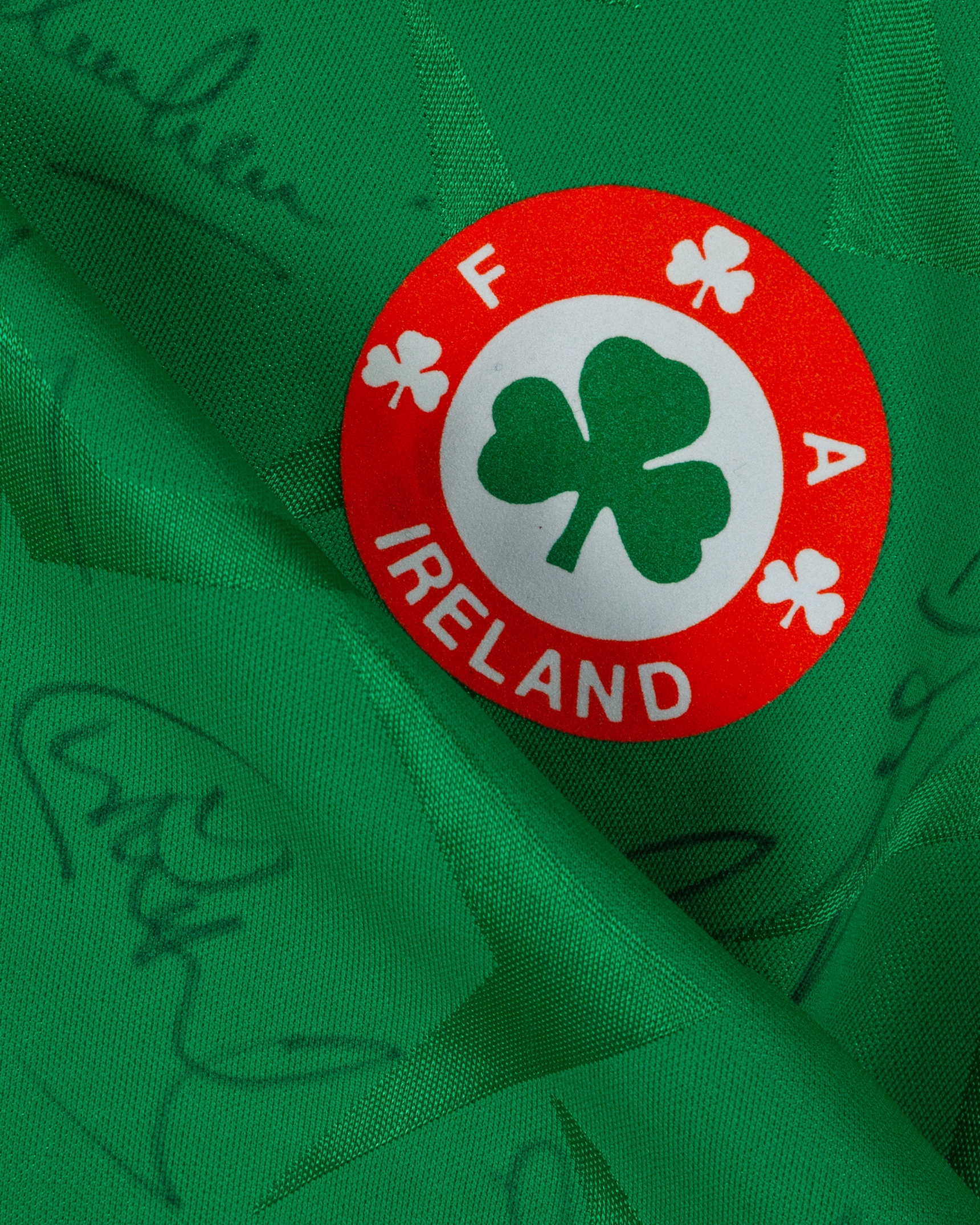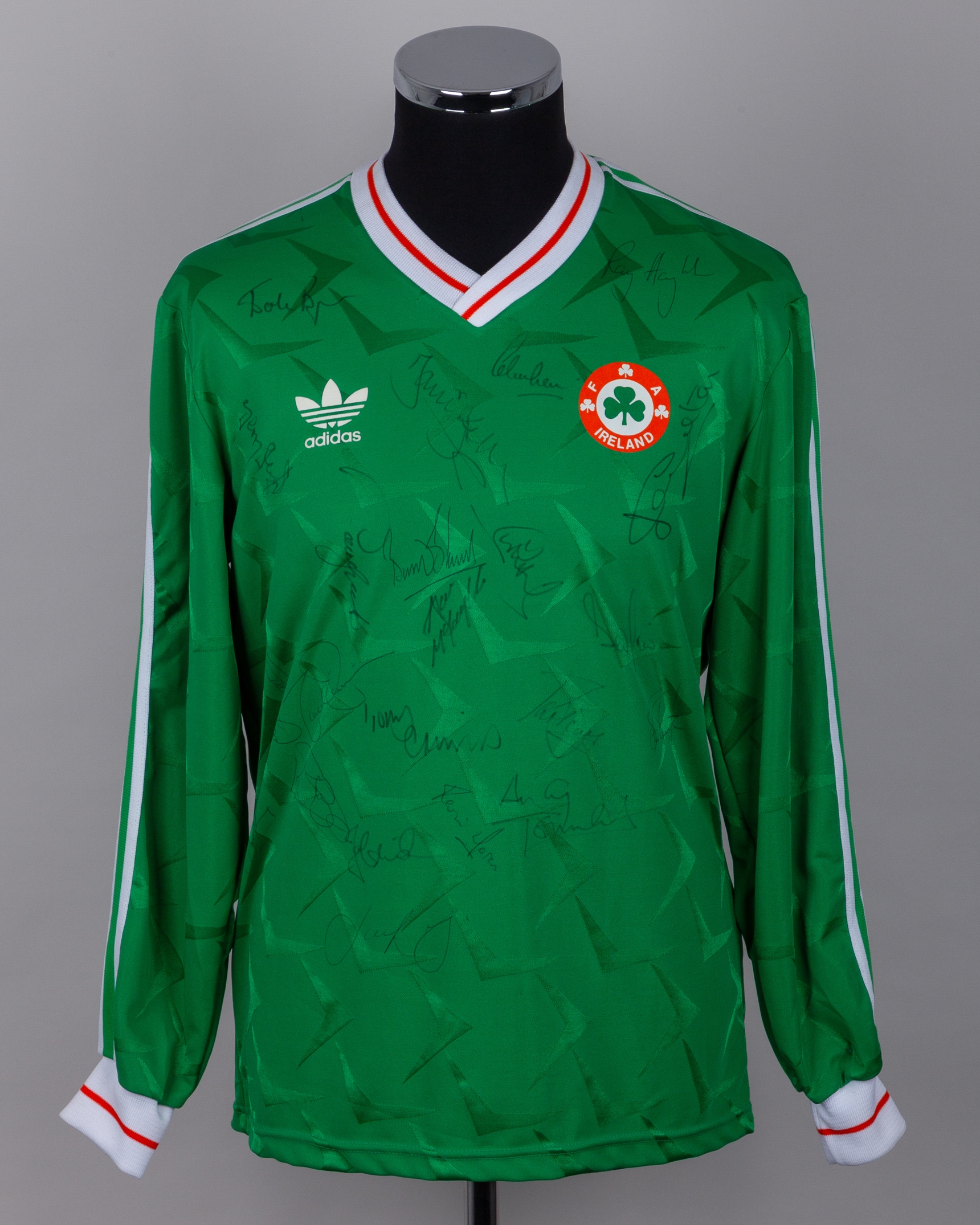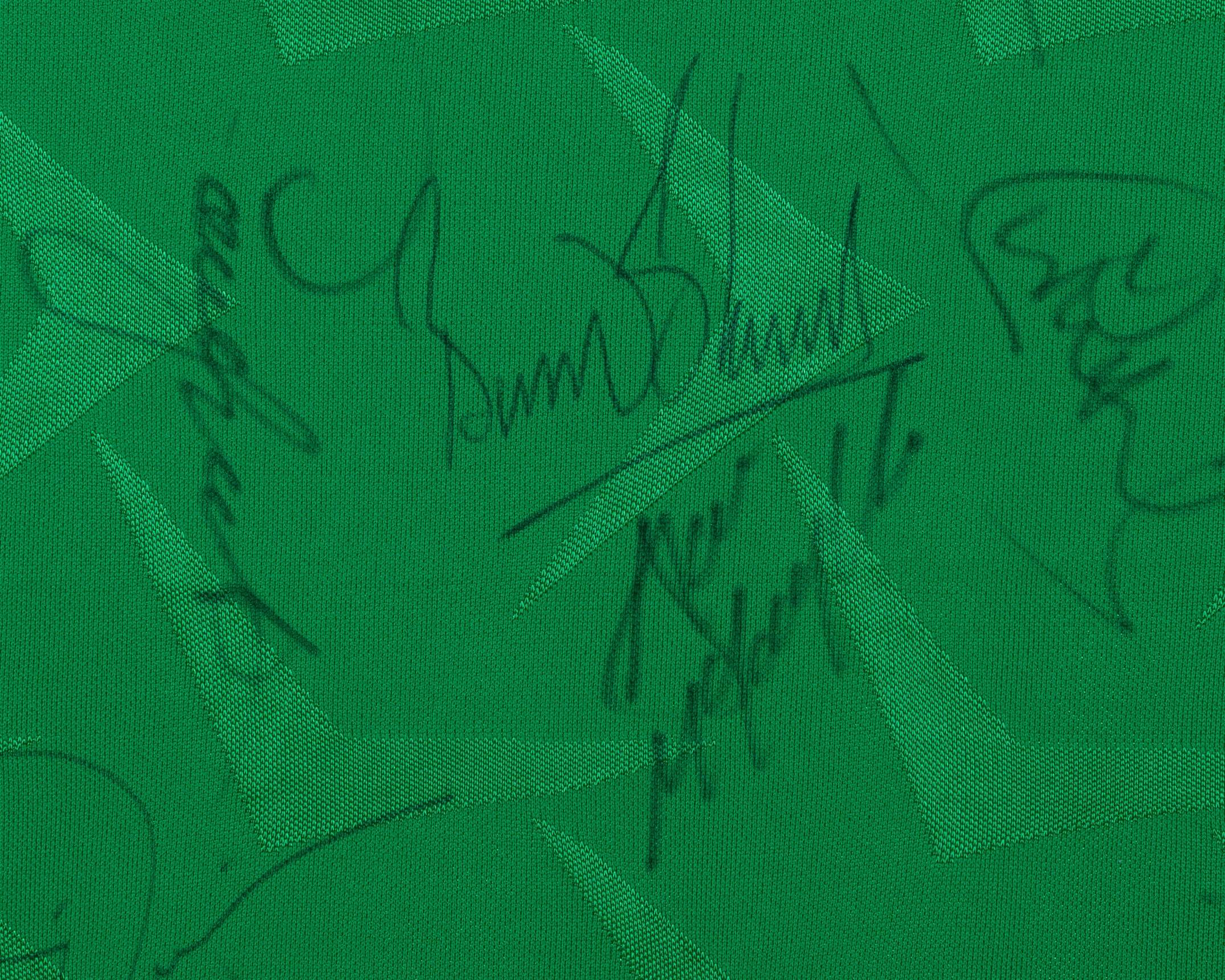 Green Ireland autographed long-sleeved shirt, Adidas, with v-neck collar and felt badge, with approximately twenty-two autographs