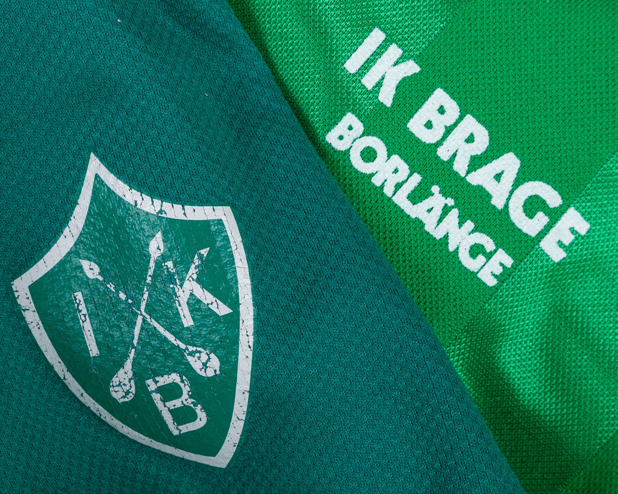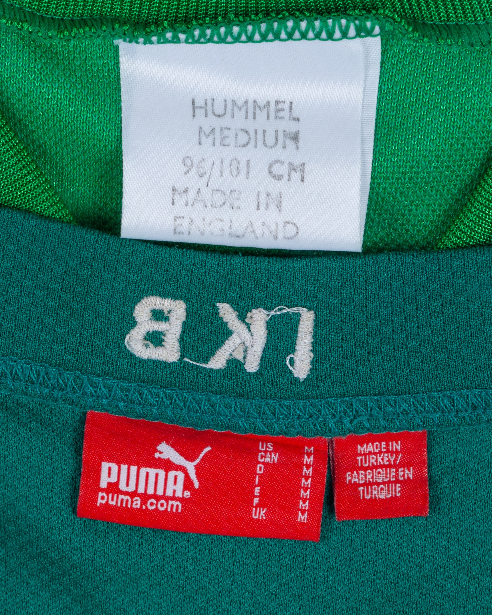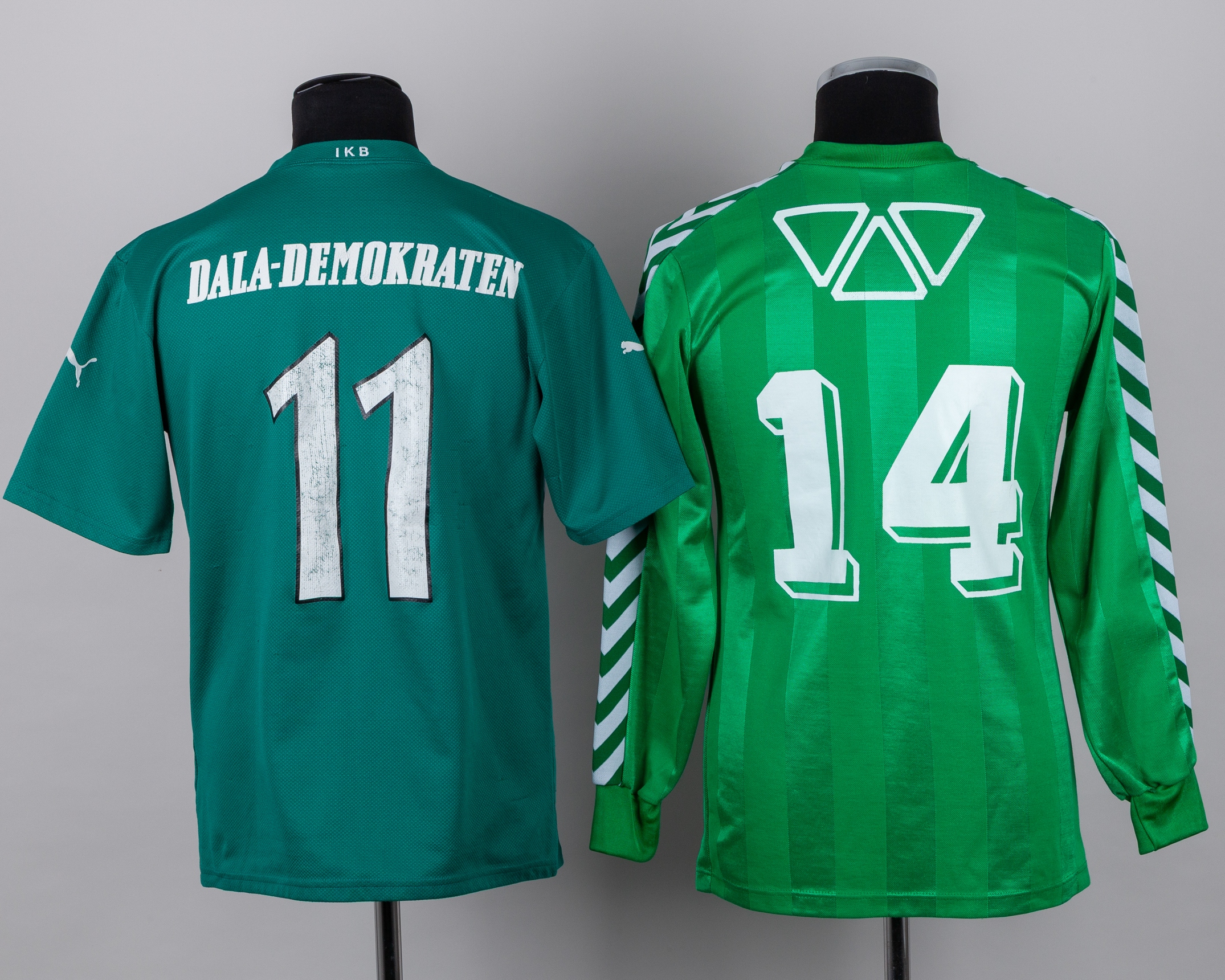 Green No.14 IK Brage long-sleeved shirt, Hummel, MEDIUM, with v-neck collar and printed badge, green No.11 IK Brage short-sleeved shirt, Puma, M, with crew-neck collar and printed badge, worn (2)