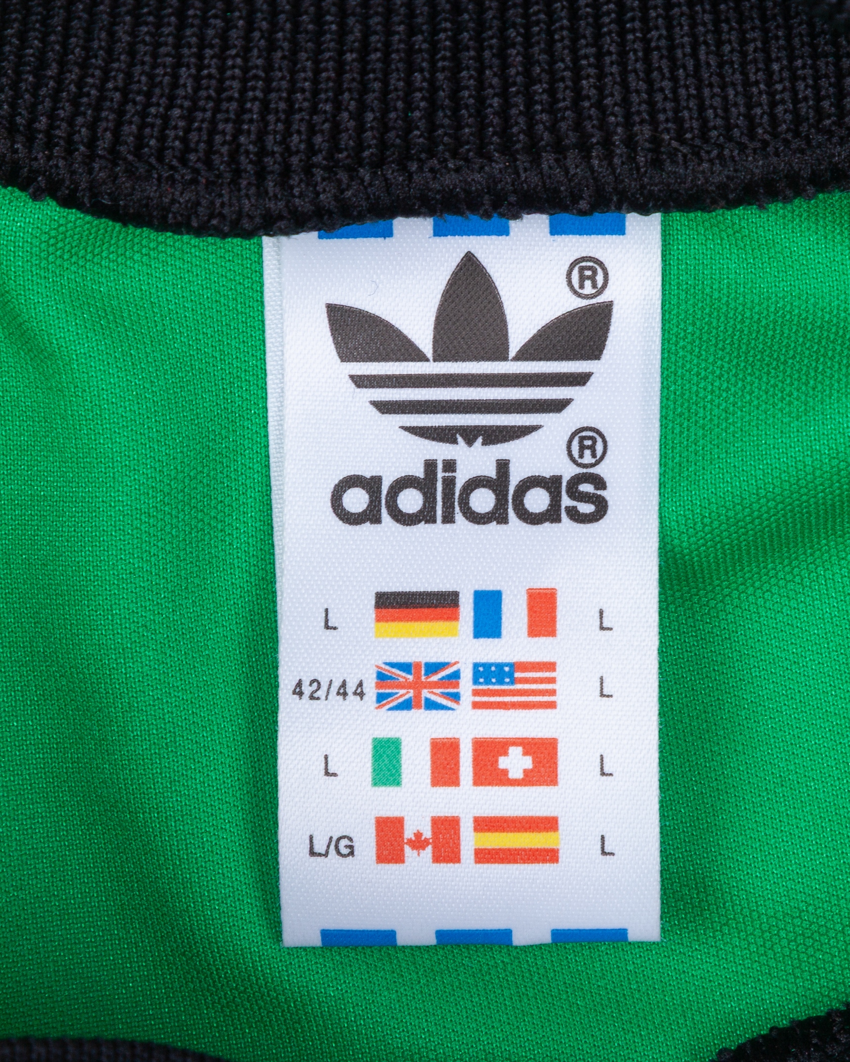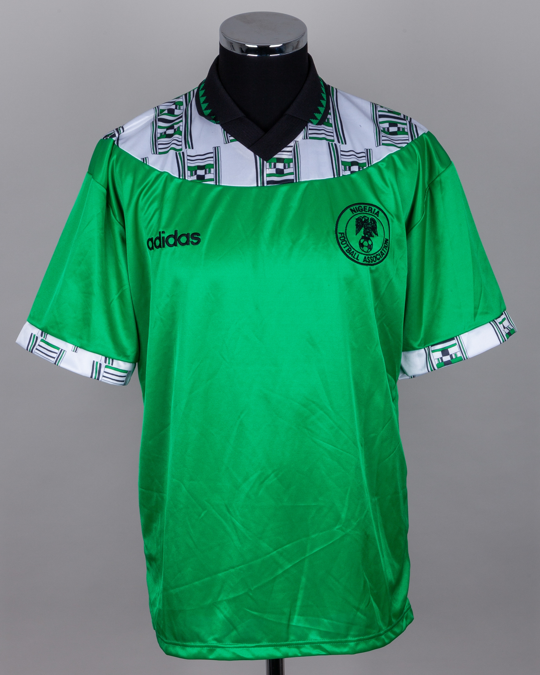 Green and White No.12 Nigeria v. Sweden short-sleeved shirt, 1994, adidas, 42/44, with v-neck collar and embroidered badge inscribed NIGERIA FOOTBALL ASSOCIATION