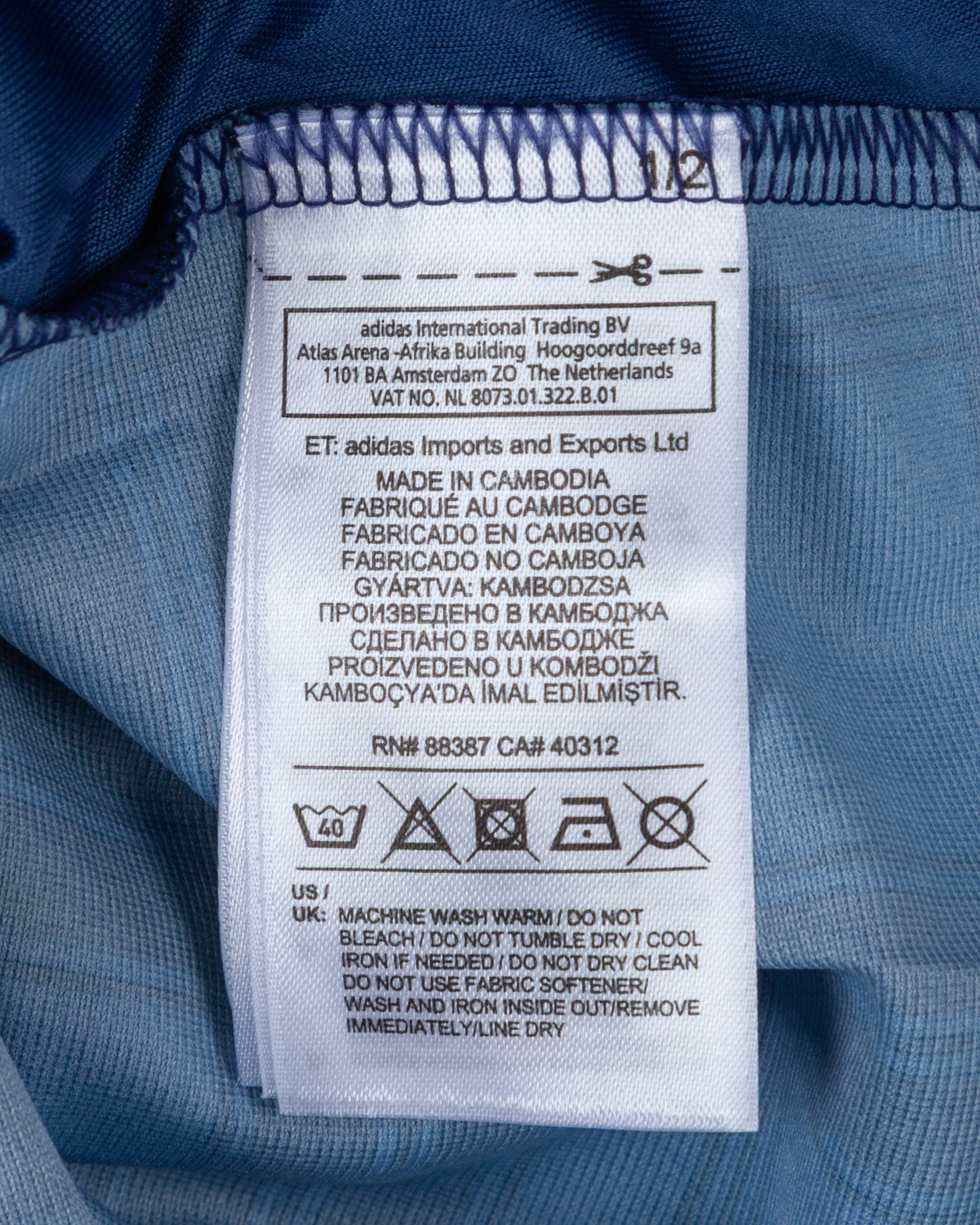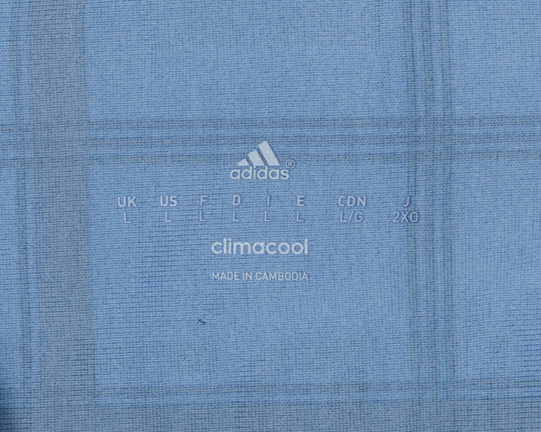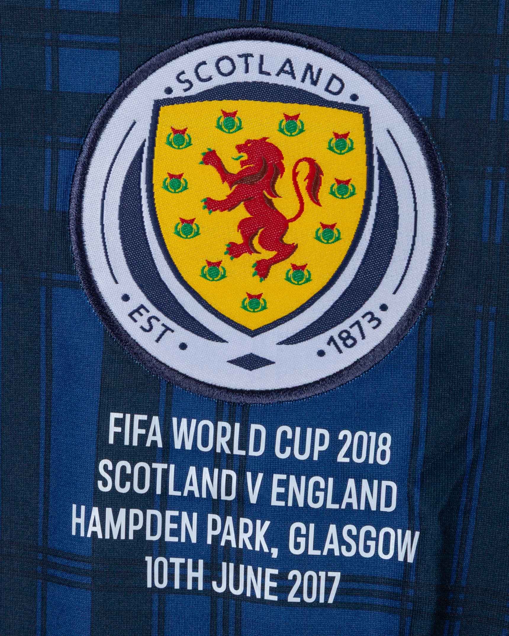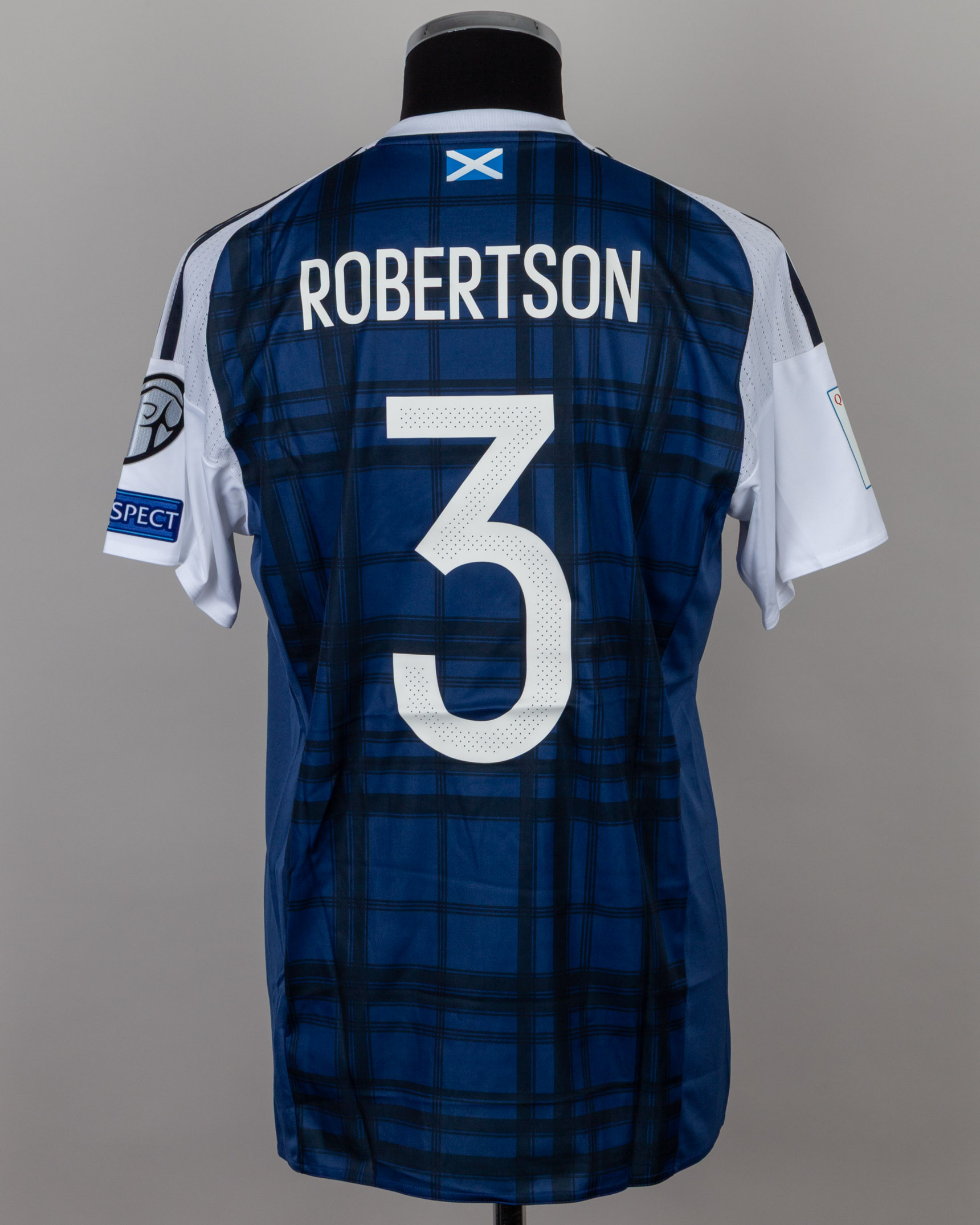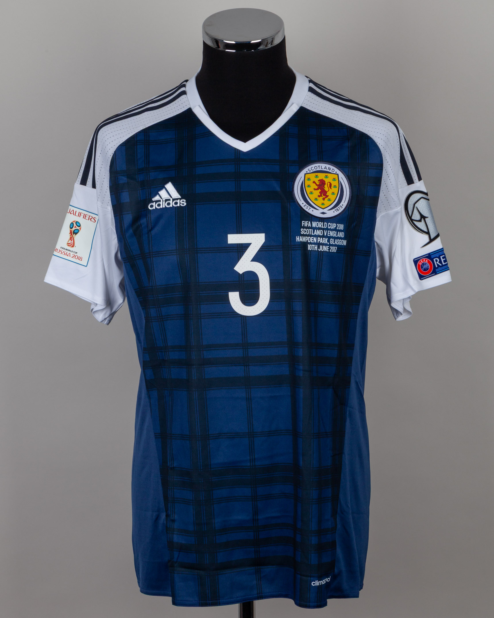 Andy Robertson blue and white No.3 Scotland v. England shirt, 2017, Adidas, L, with v-neck collar and embroidered cloth badge inscribed SCOTLAND EST 1873, with FIFA WORLD CUP 2018 SCOTLAND V ENGLAND HAMPDEN PARK, GLASGOW 10TH JUNE 2017 decal, with the reverse lettered ROBERTSON, the right sleeve with qualifiers FIFA World Cup Russia 2018 flash and the left sleeve with respect flash