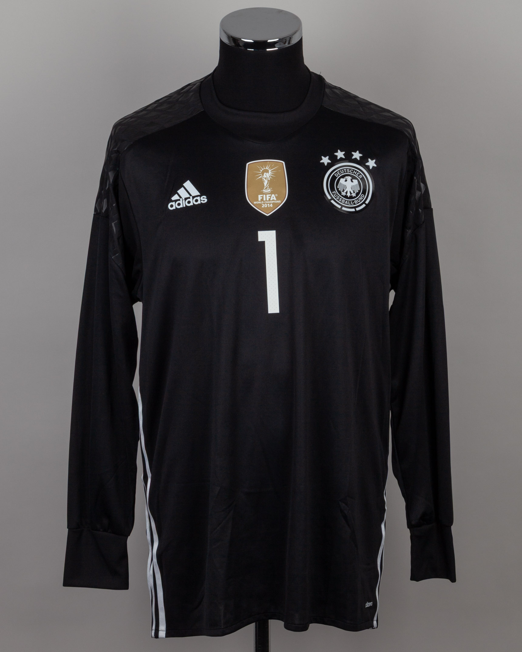 Manuel Neuer black No.1 Germany goalkeepers shirt, Adidas, with crew-neck collar and printed badge, the reverse lettered NEUER, the chest with FIFA World Champions 2014