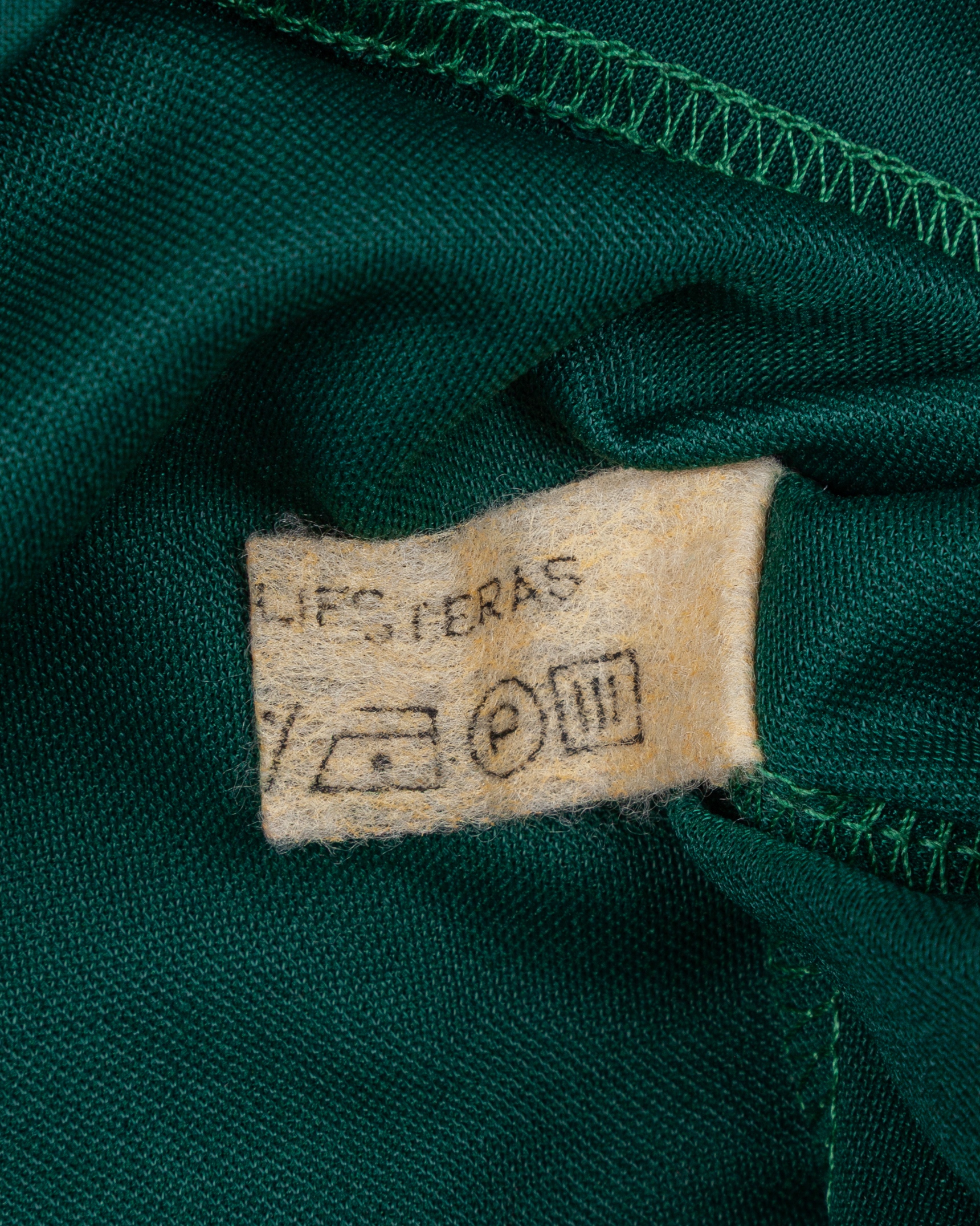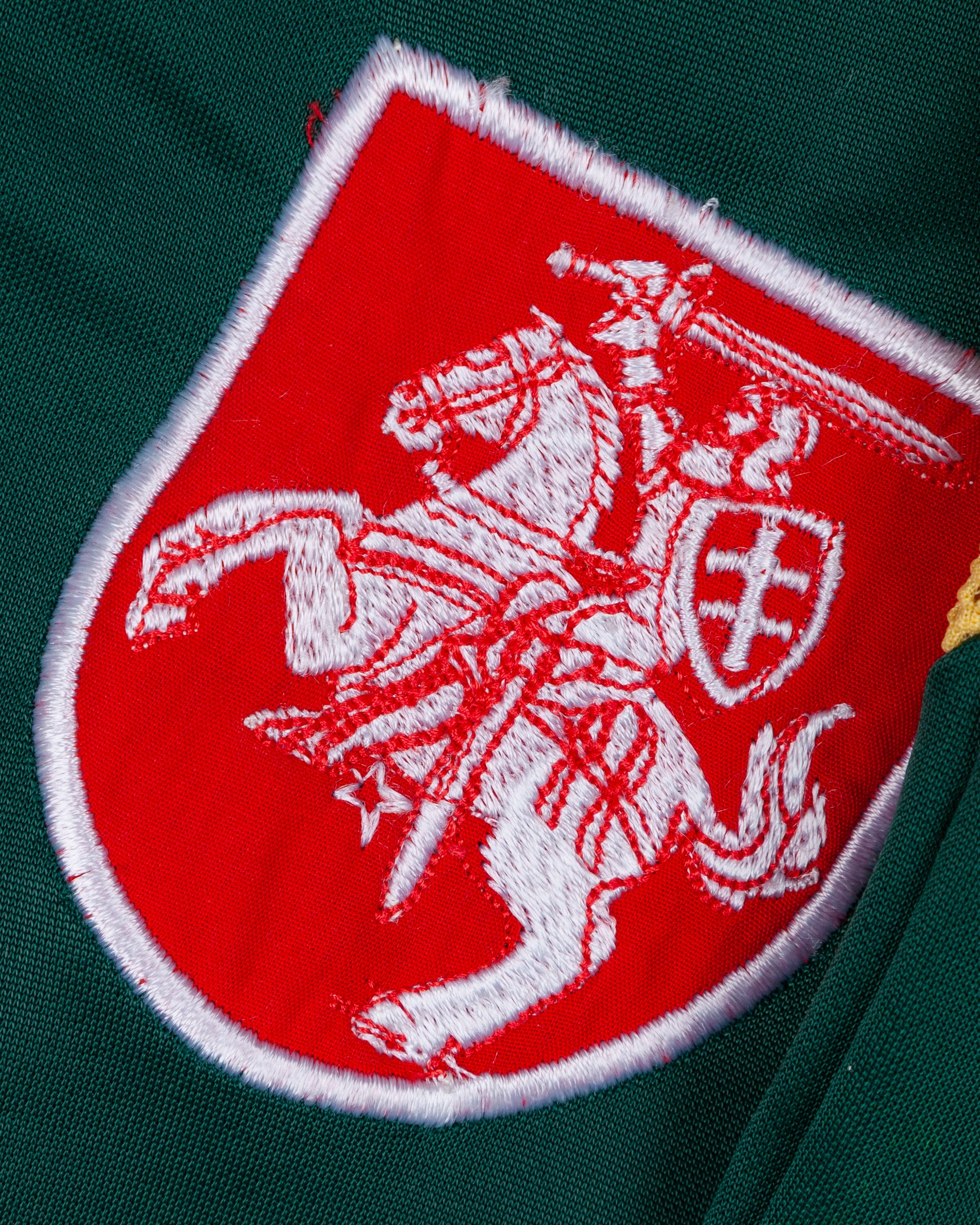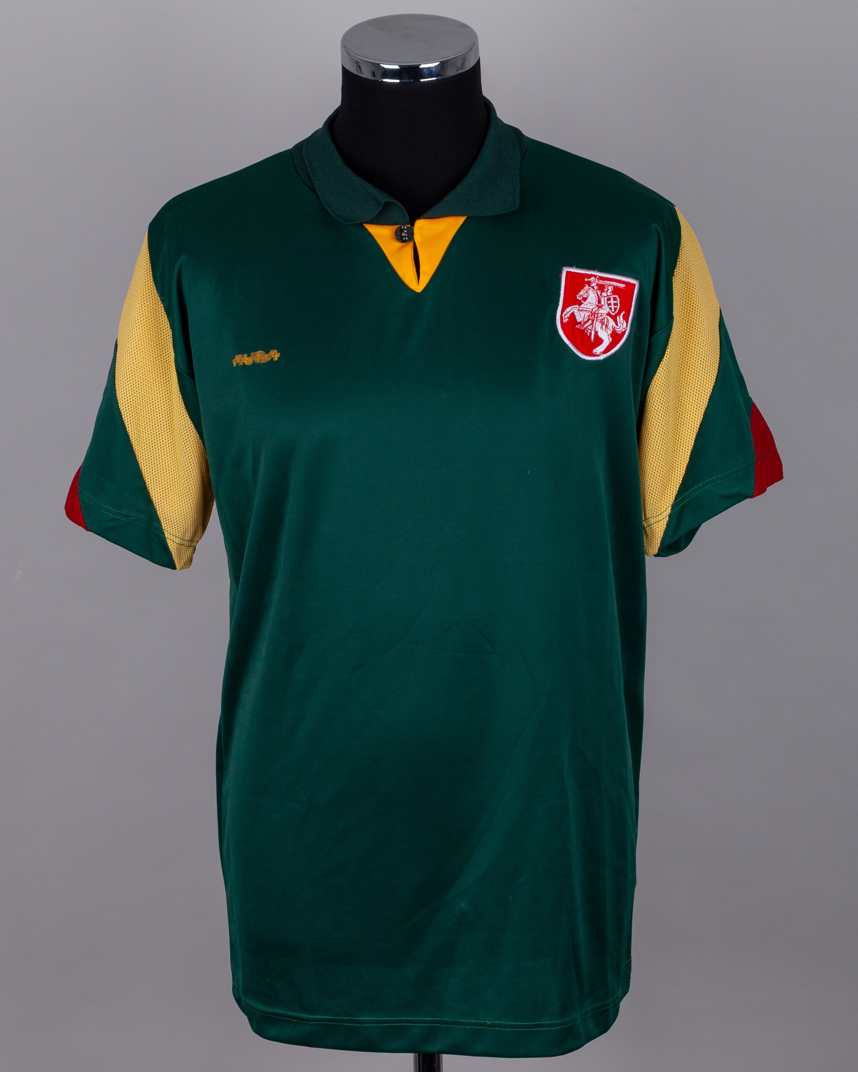 Green and yellow No.13 Lithuania v. Sweden short-sleeved shirt, 1997, Auda, with button-up collar and embroidered cloth badge inscribed