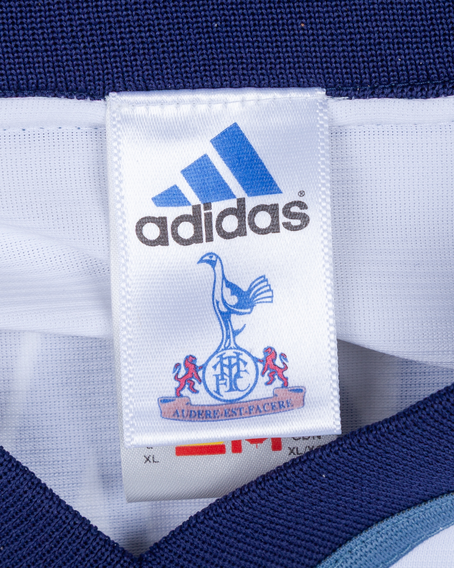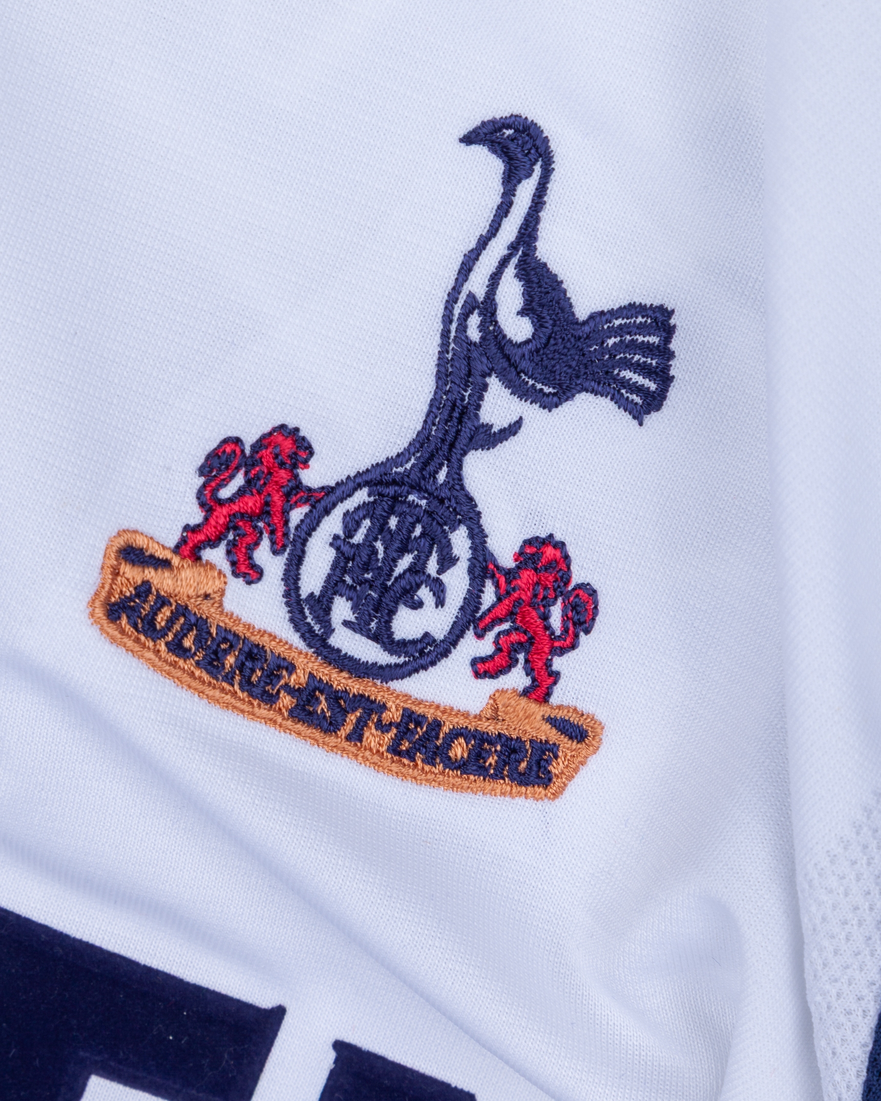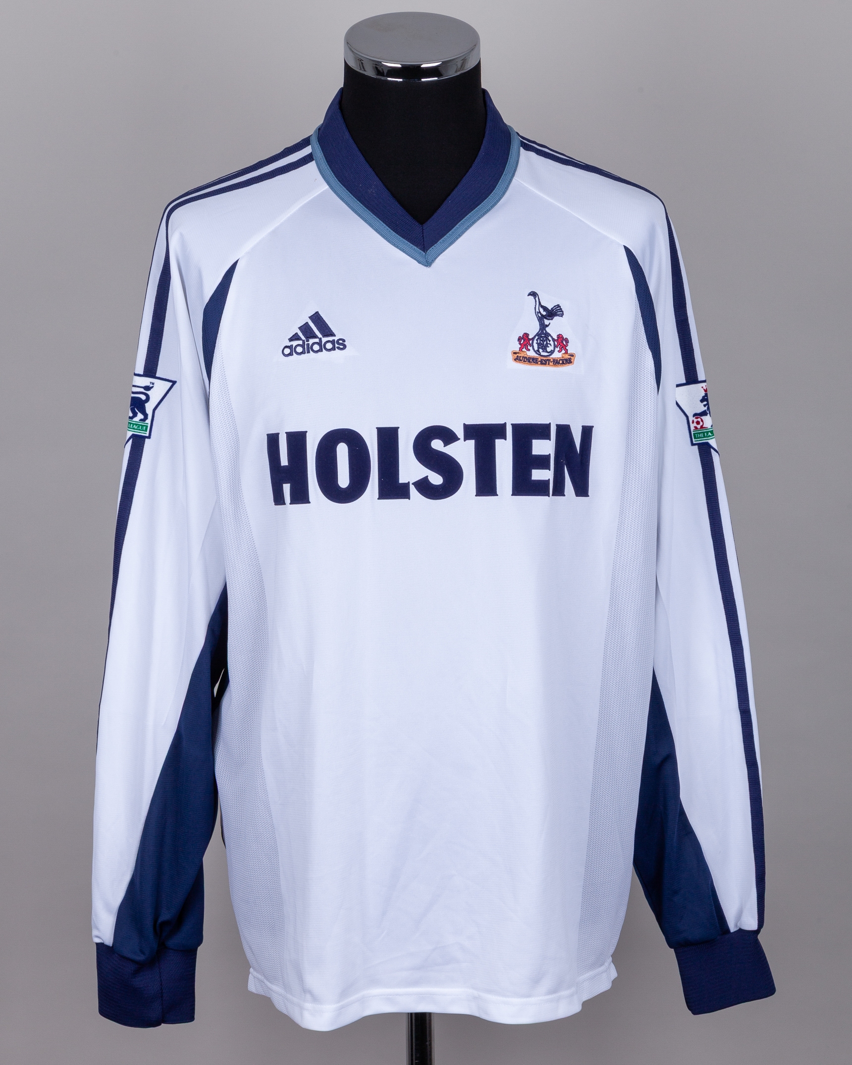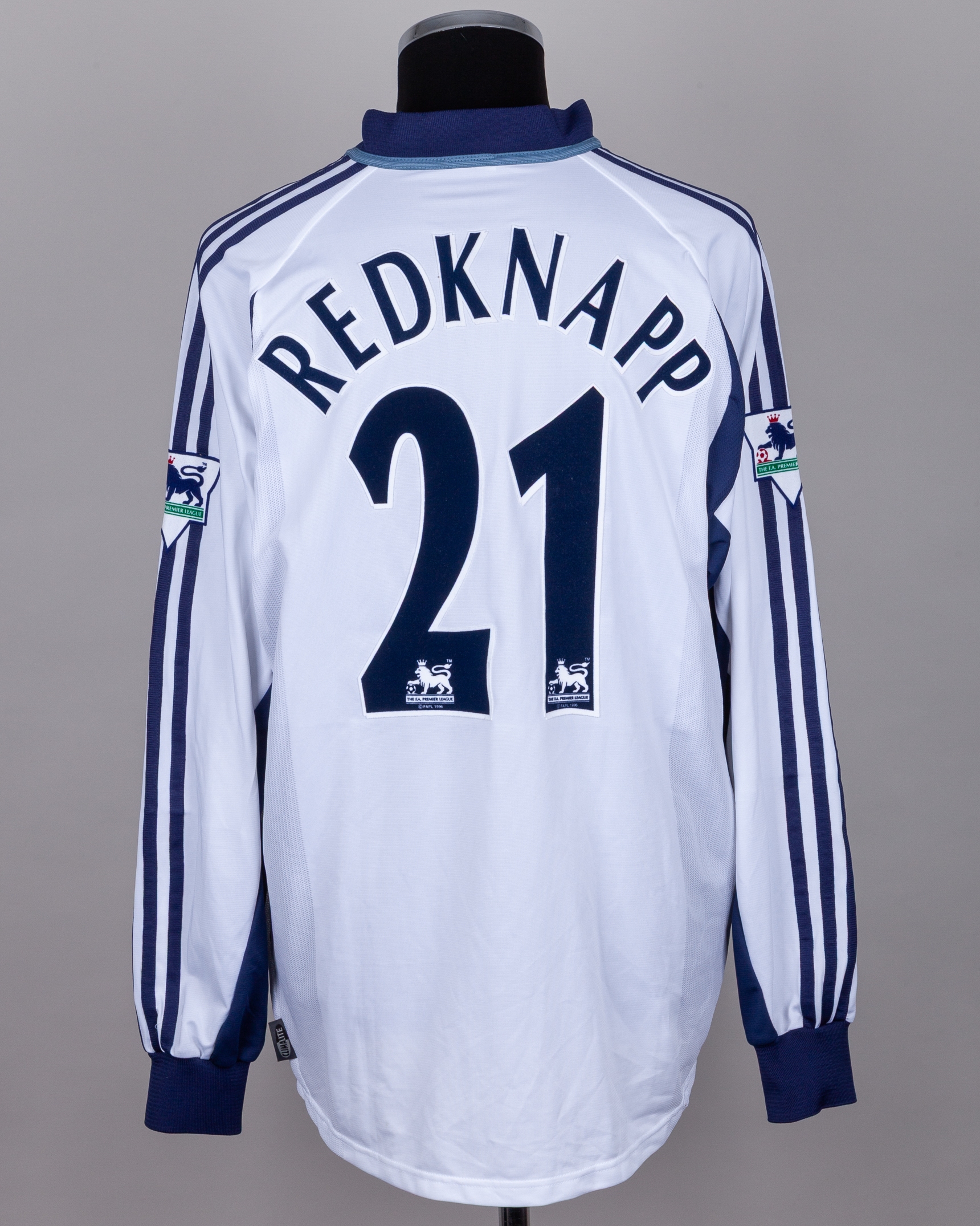 Jamie Redknapp white and blue No.21 Tottenham Hotspur long-sleeved shirt, 2001-02, Adidas, XL, with v-neck collar and embroidered badge inscribed THFC, the reverse lettered REDKANPP, the sleeves with The F.A. Premier League flashes