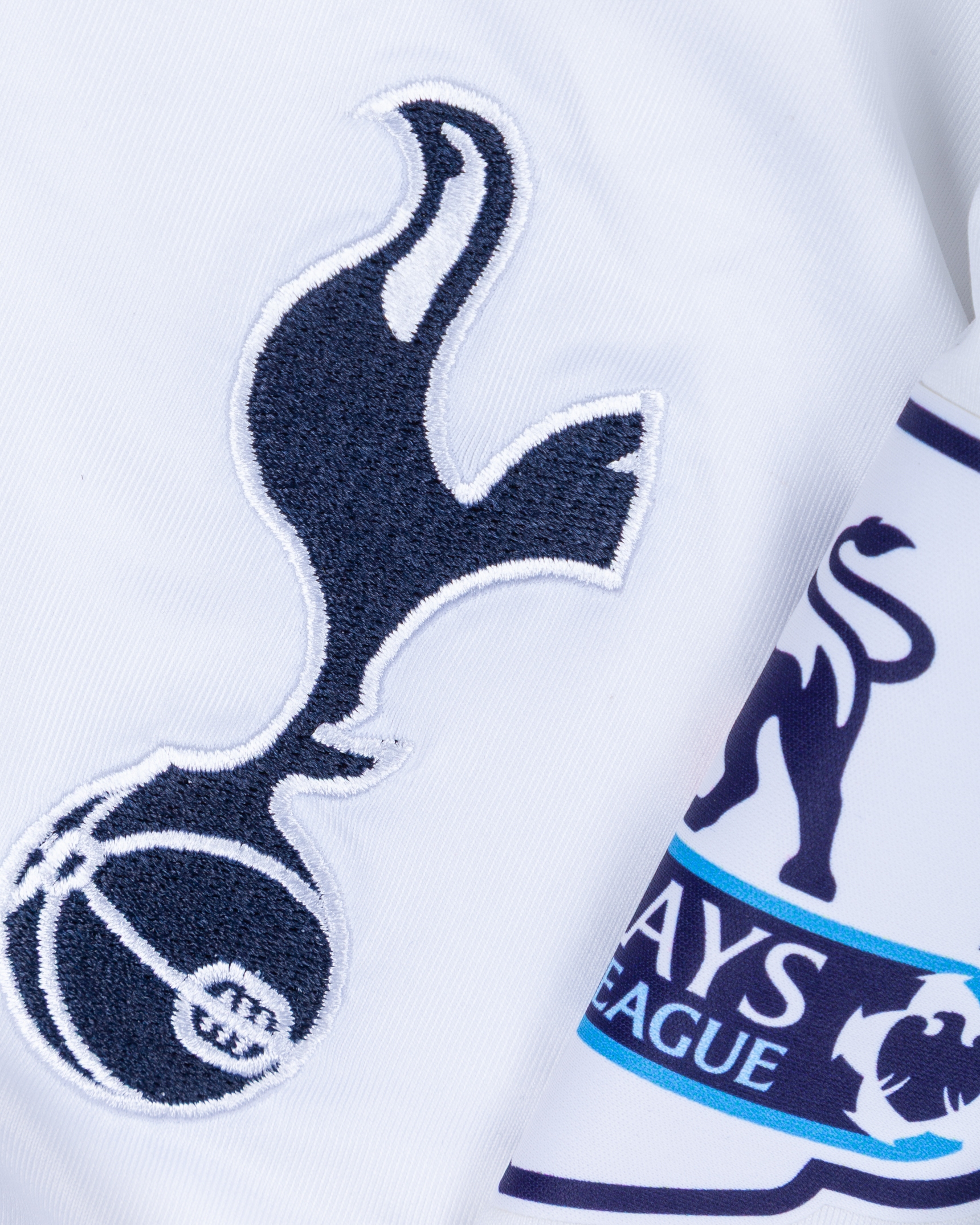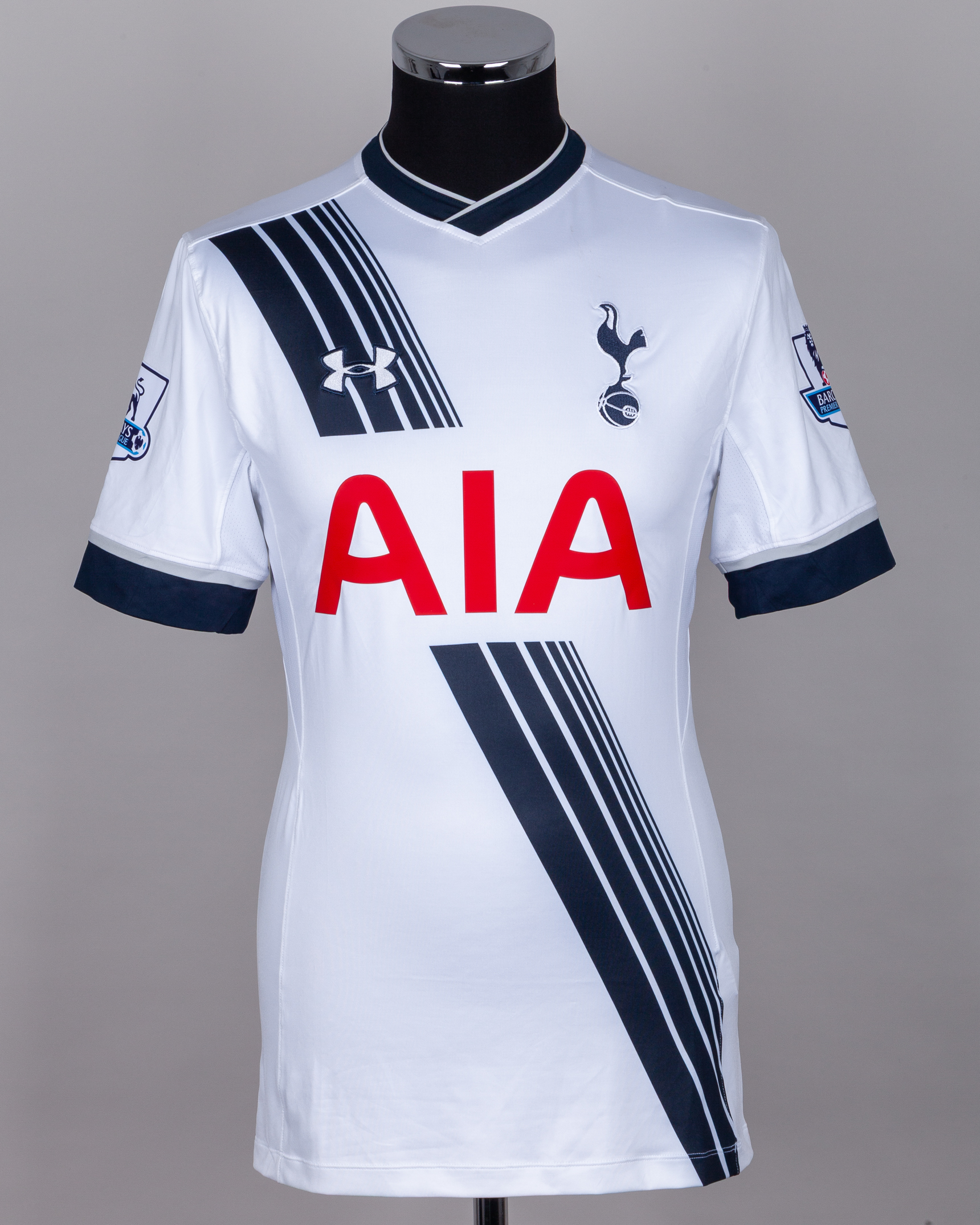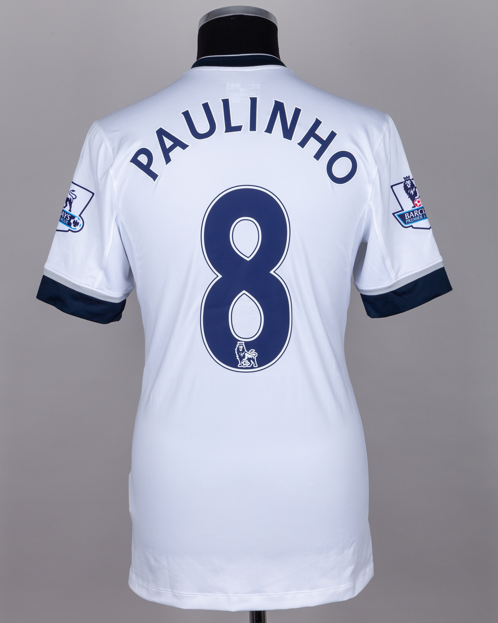 Paulinho white and blue No.8 Tottenham Hotspur short-sleeved shirt, 2015-16, Under Armour, M, with v-neck collar and embroidered cloth badge, the reverse lettered PAULINHO, the sleeves with Barclays Premier League flashes