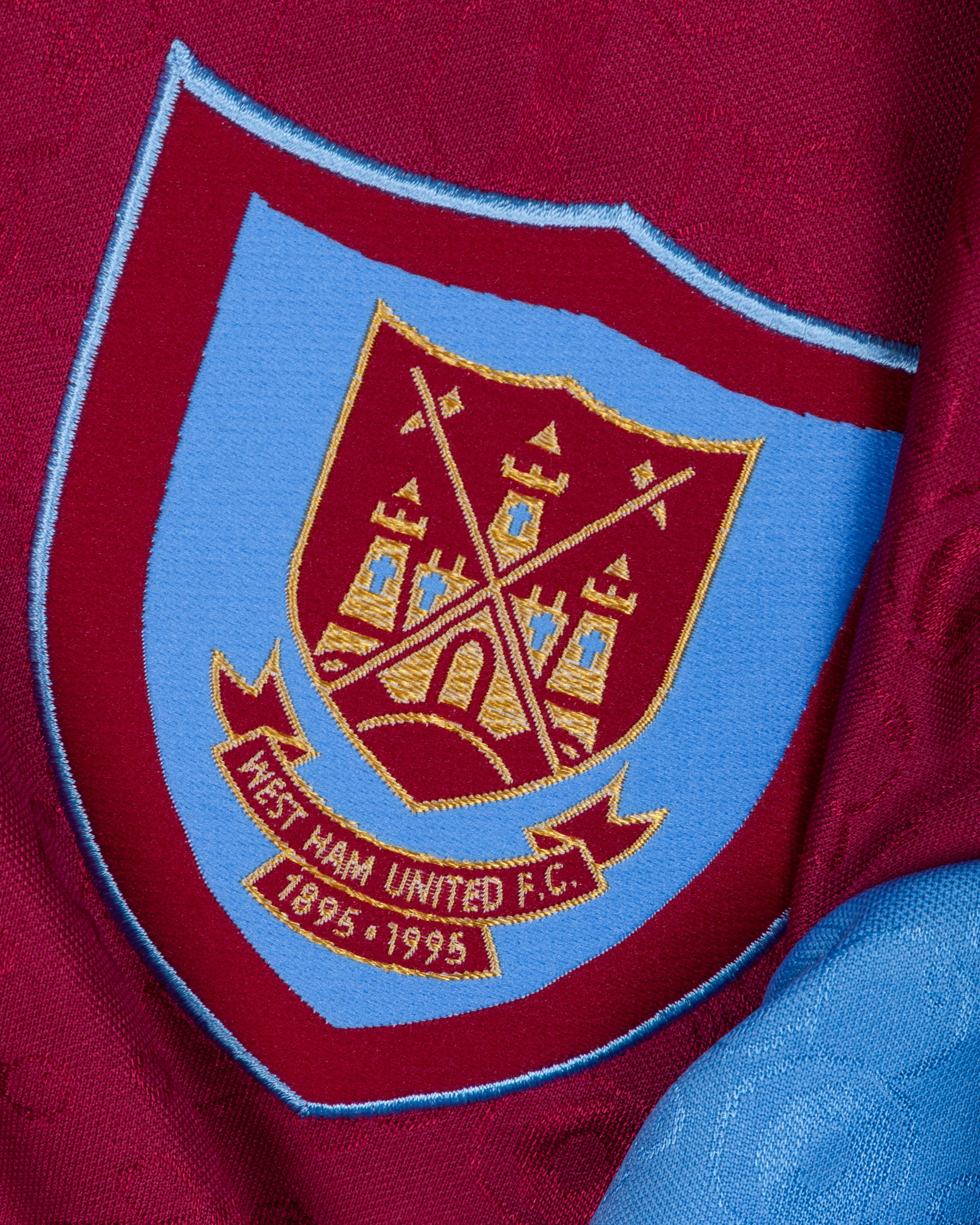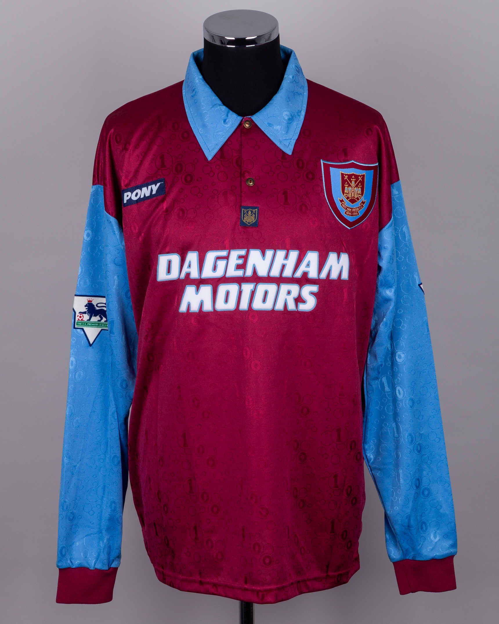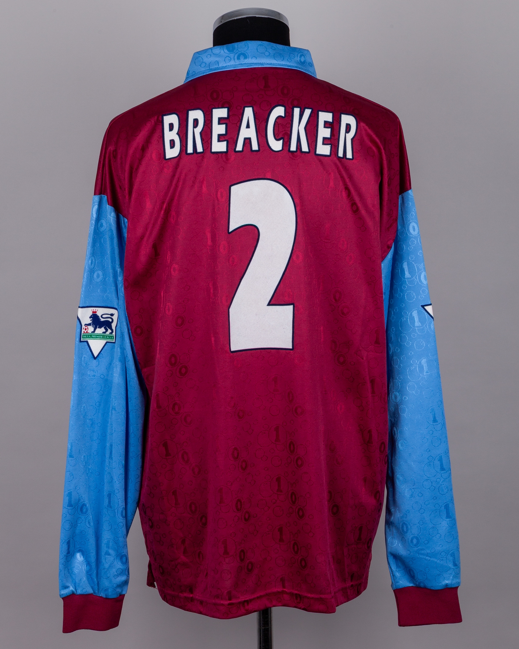 Tim Breacker claret and blue No.2 West Ham United v. Sheffield Wednesday long-sleeved shirt, 1996, Pony, XL, with button-up collar and embroidered cloth badge inscribed WEST HAM UNITED F.C. 1895-1995, the reverse lettered BREACKER, the sleeves with The F.A.Premier League flashes, areas of staining