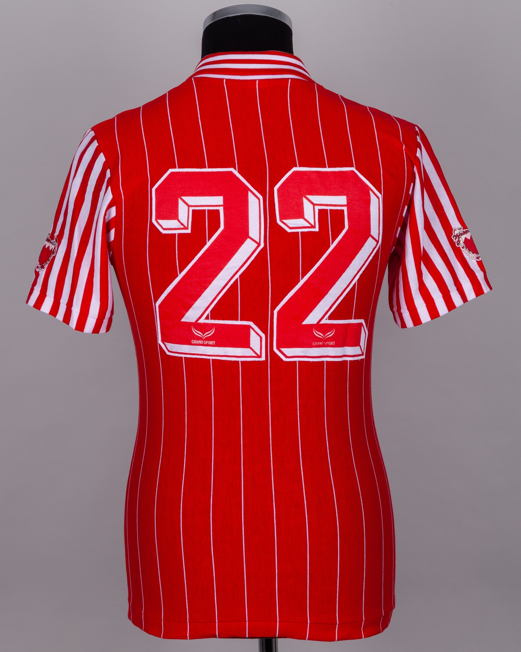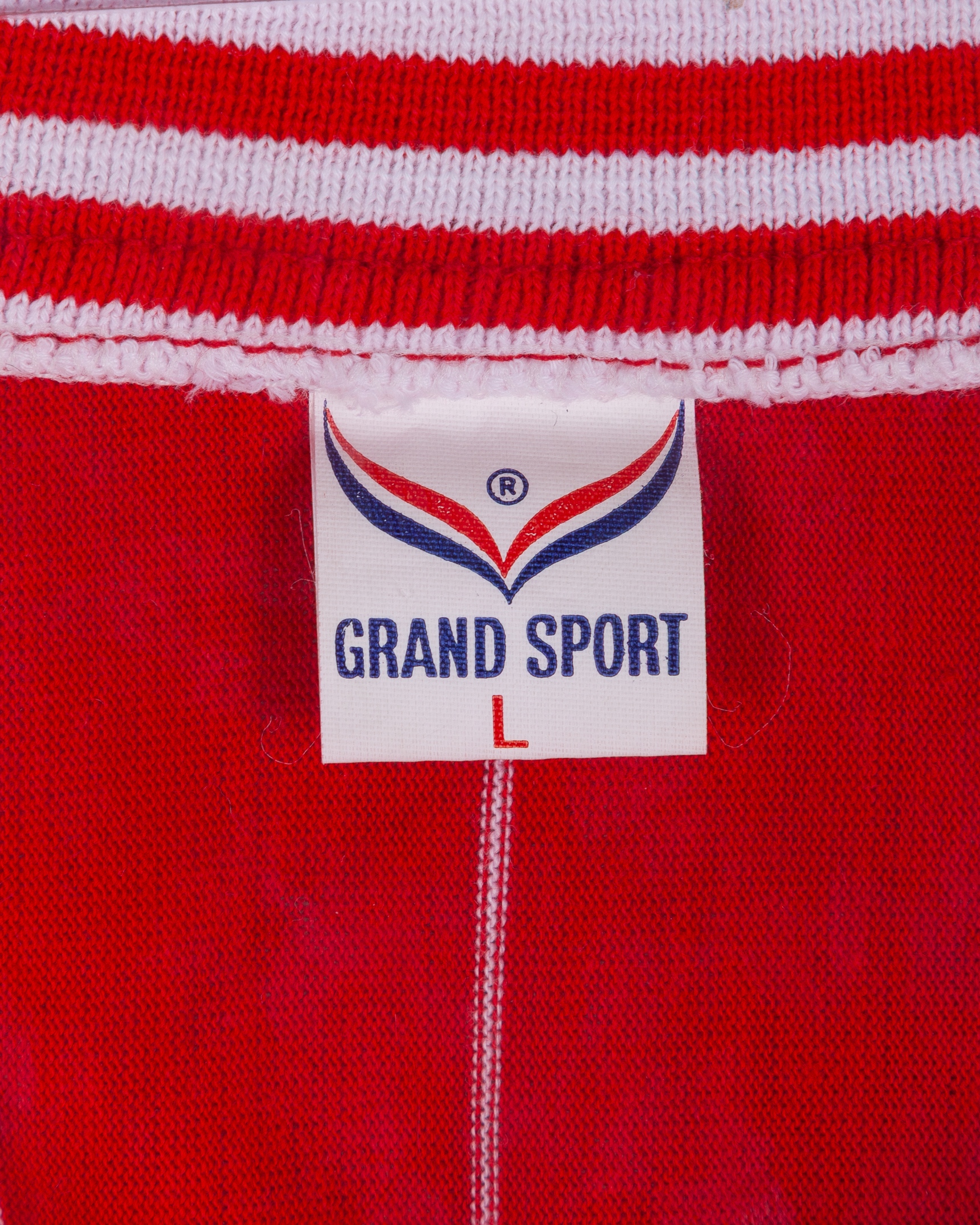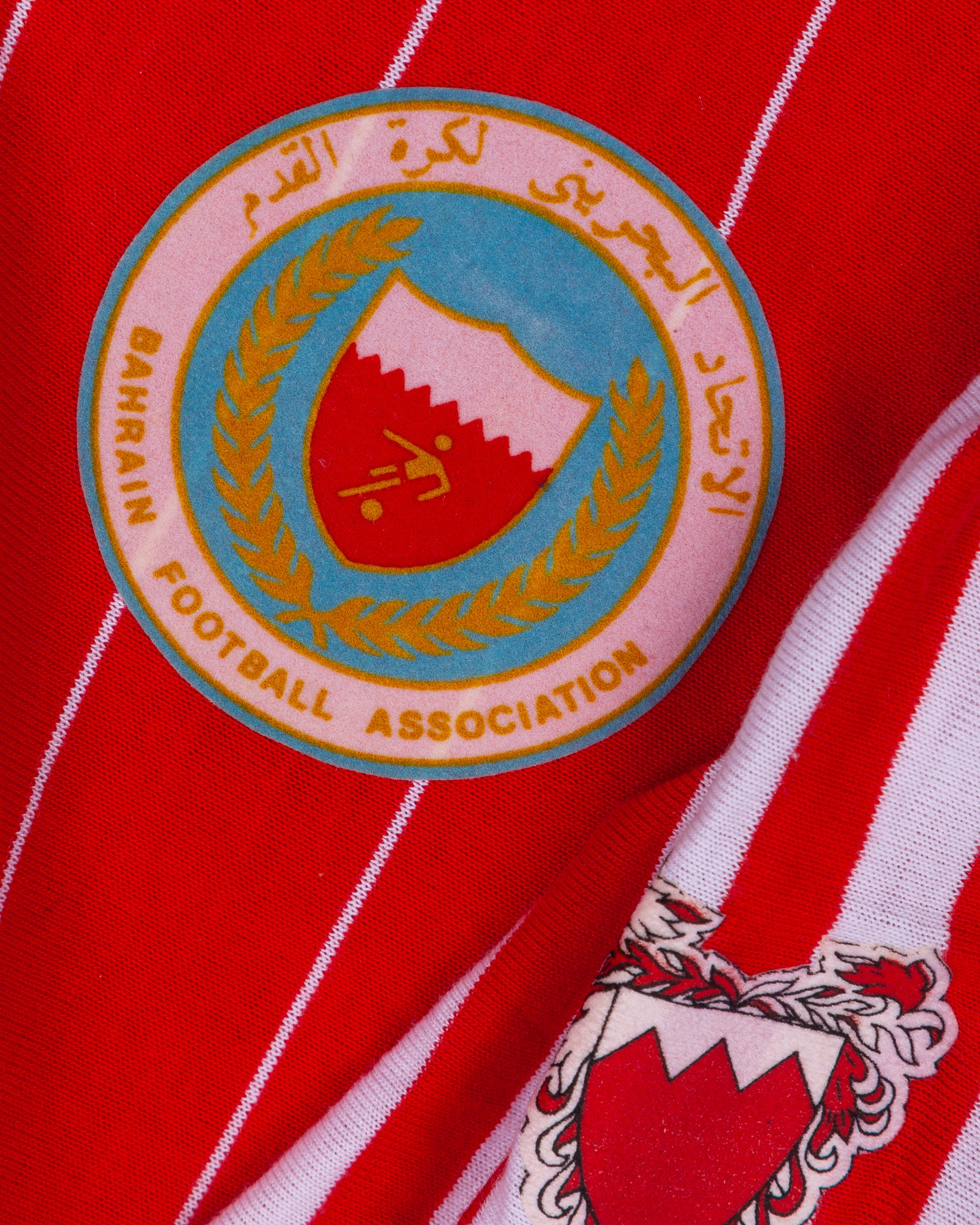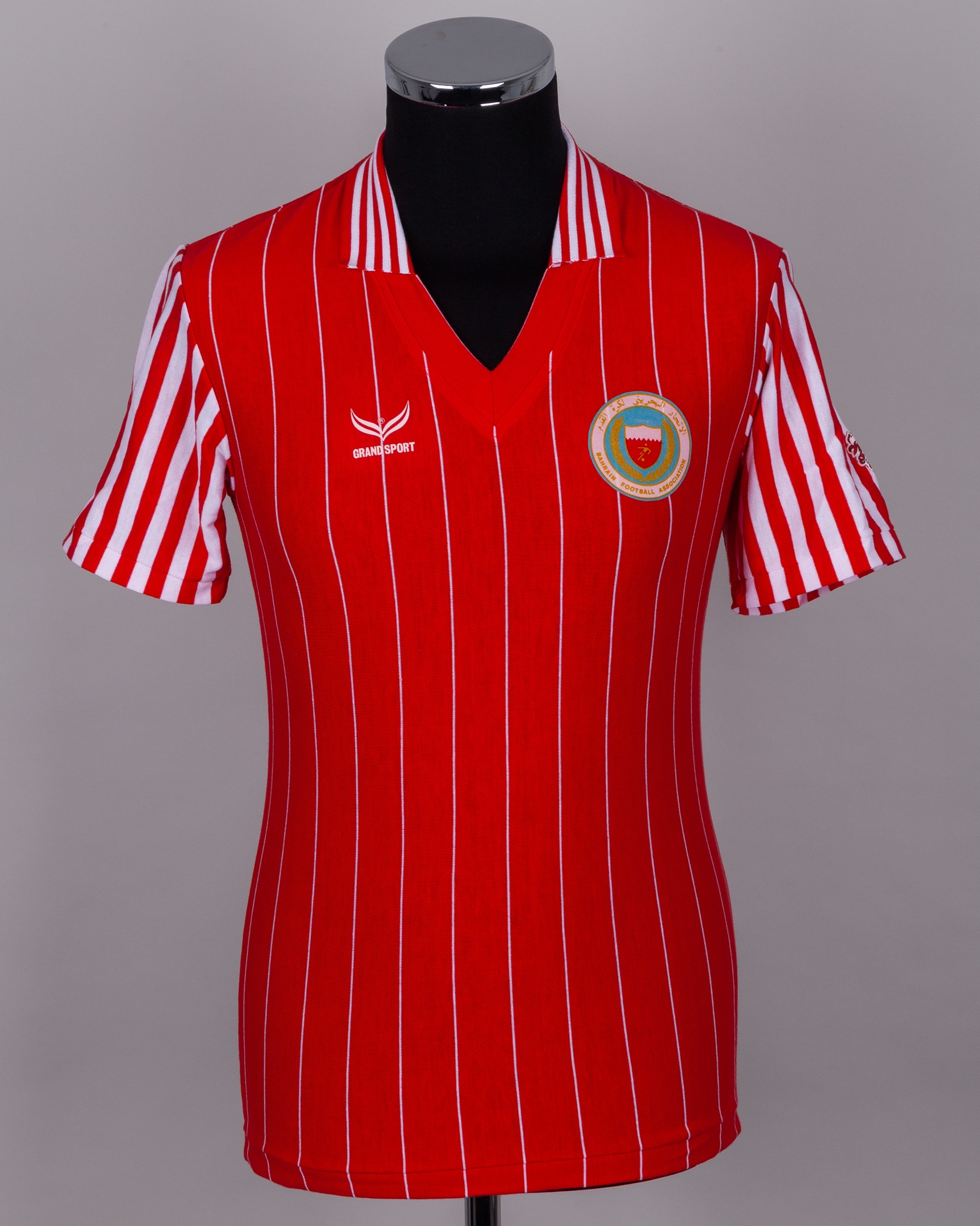 Red and white No.22 Bahrain short-sleeved shirt, 1987, Grand Sport, L, with v-neck collar and printed badge