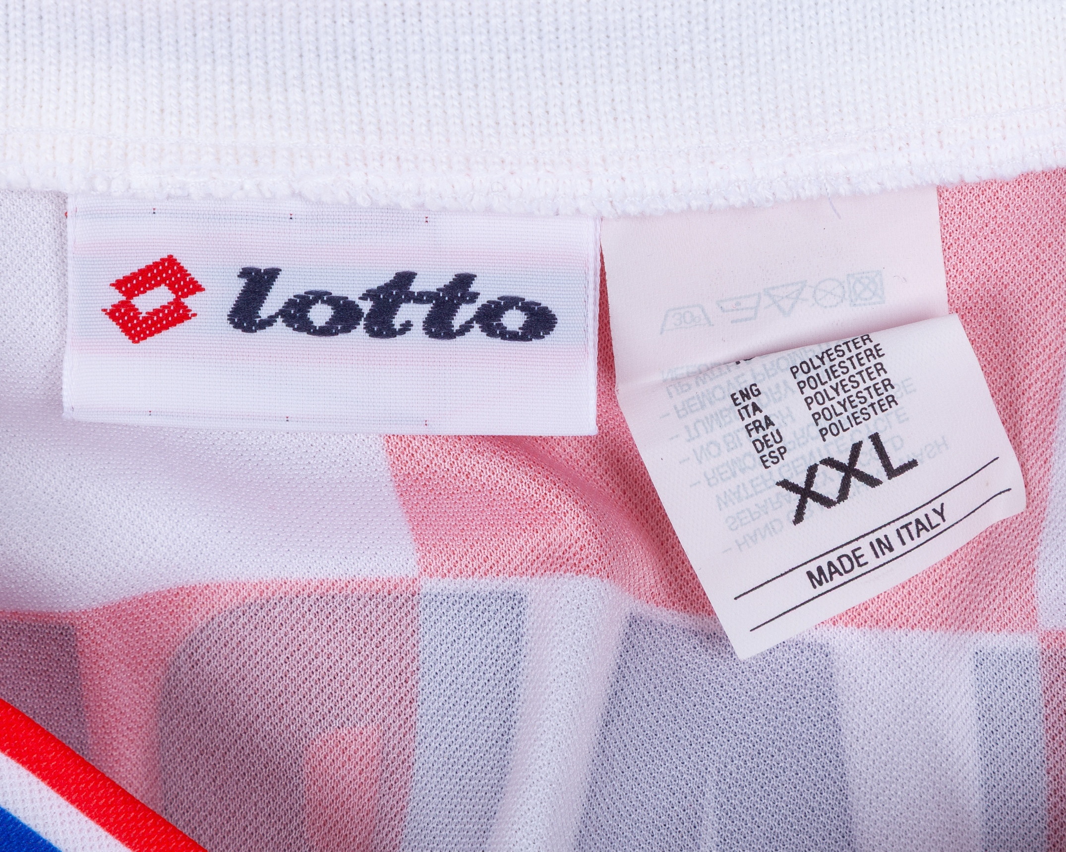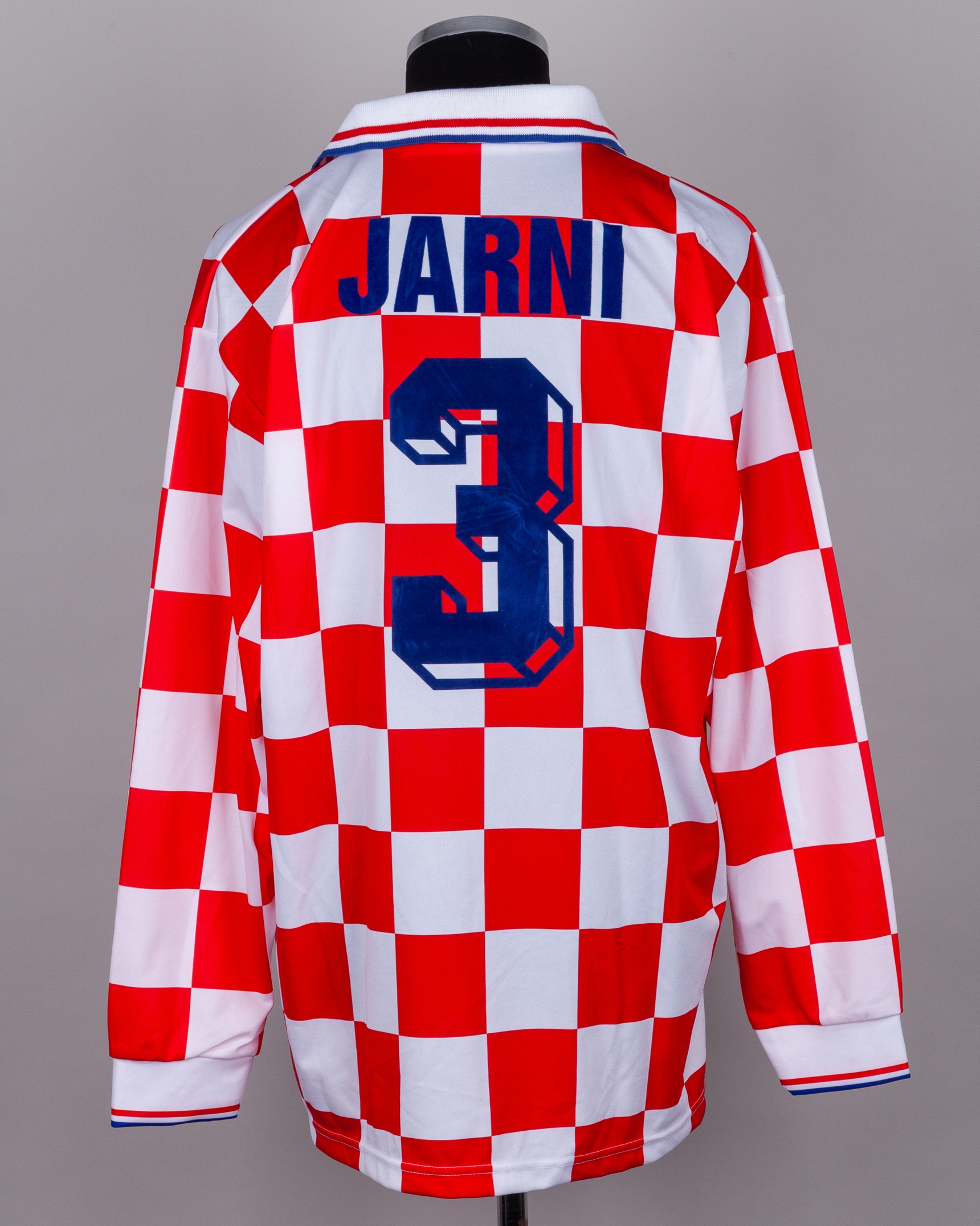 Robert Jarni red and white No.3 Croatia long-sleeved shirt, 1994, Lotto, XXL, with v-neck collar and printed badge, the reverse lettered JARNI, with COA
