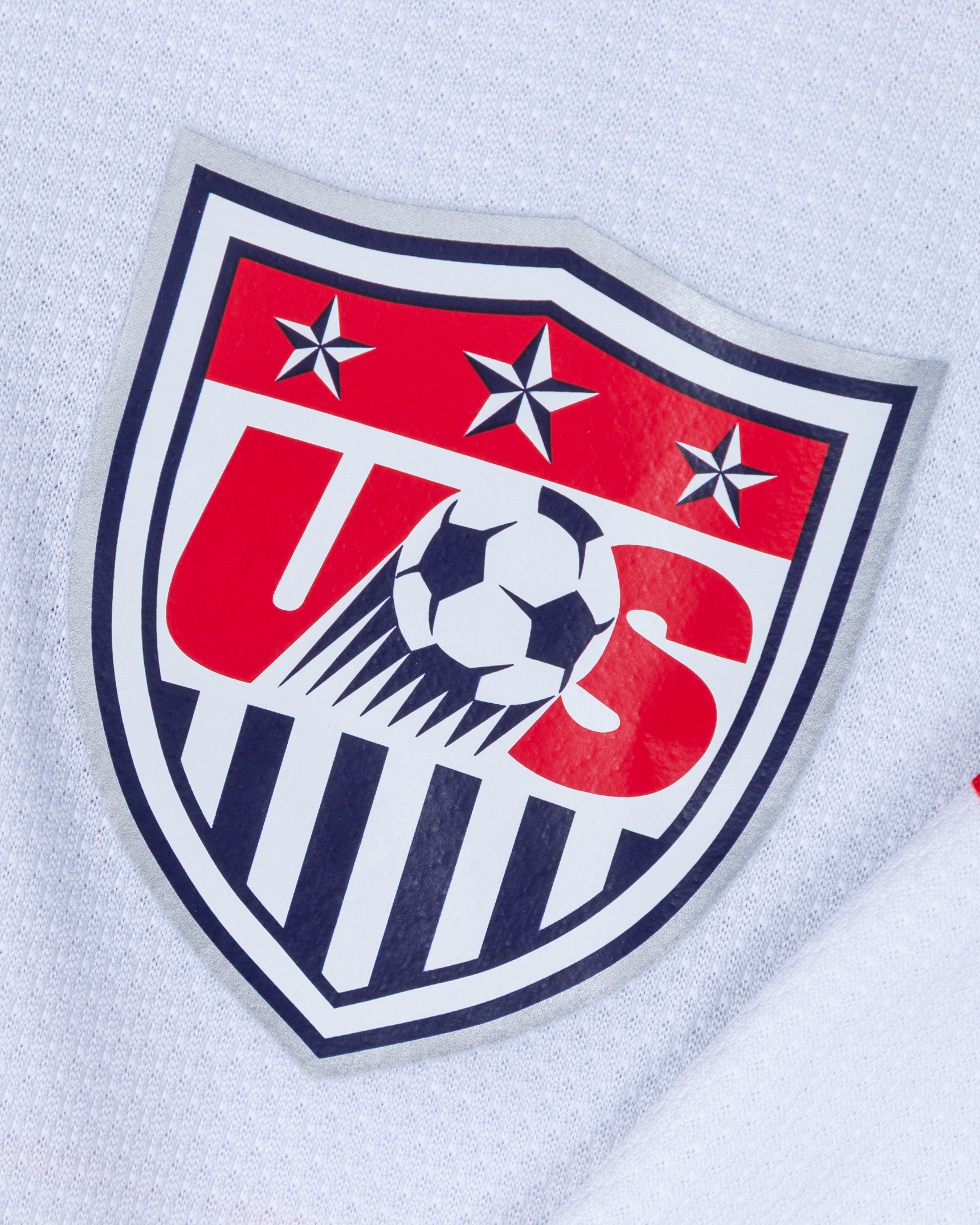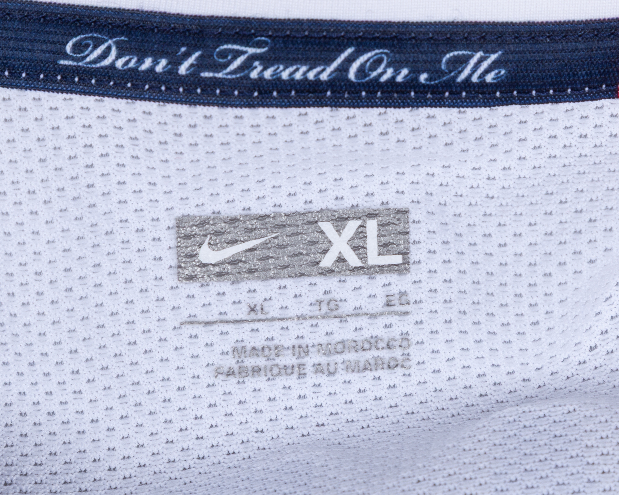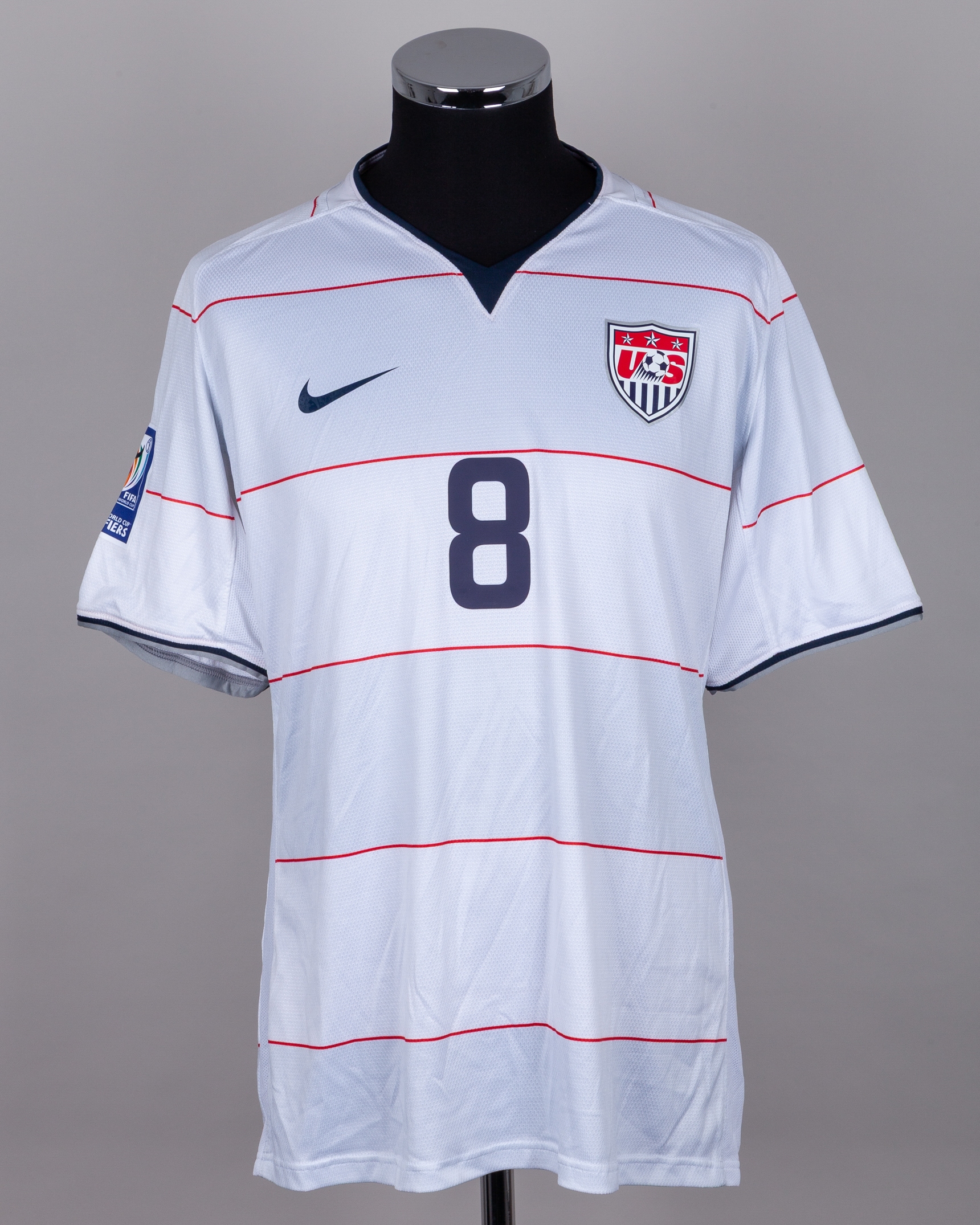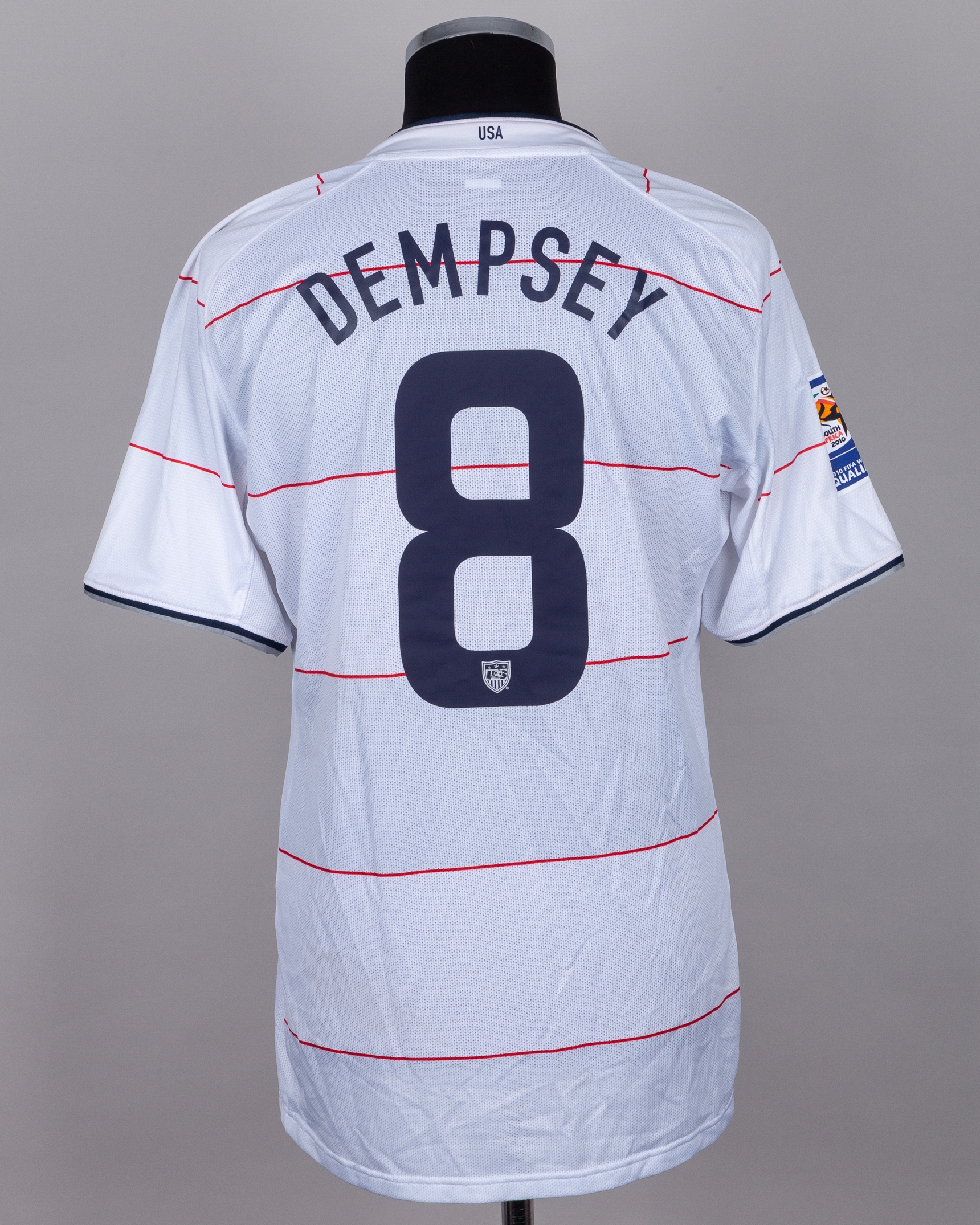 Clint Dempsey white and blue No.8 USA short-sleeved shirt, 2008, Nike, XL, with v-nck collar and printed badge, the reverse lettered DEMPSEY, the right sleeve with 2010 FIFA World Cup qualifiers flash