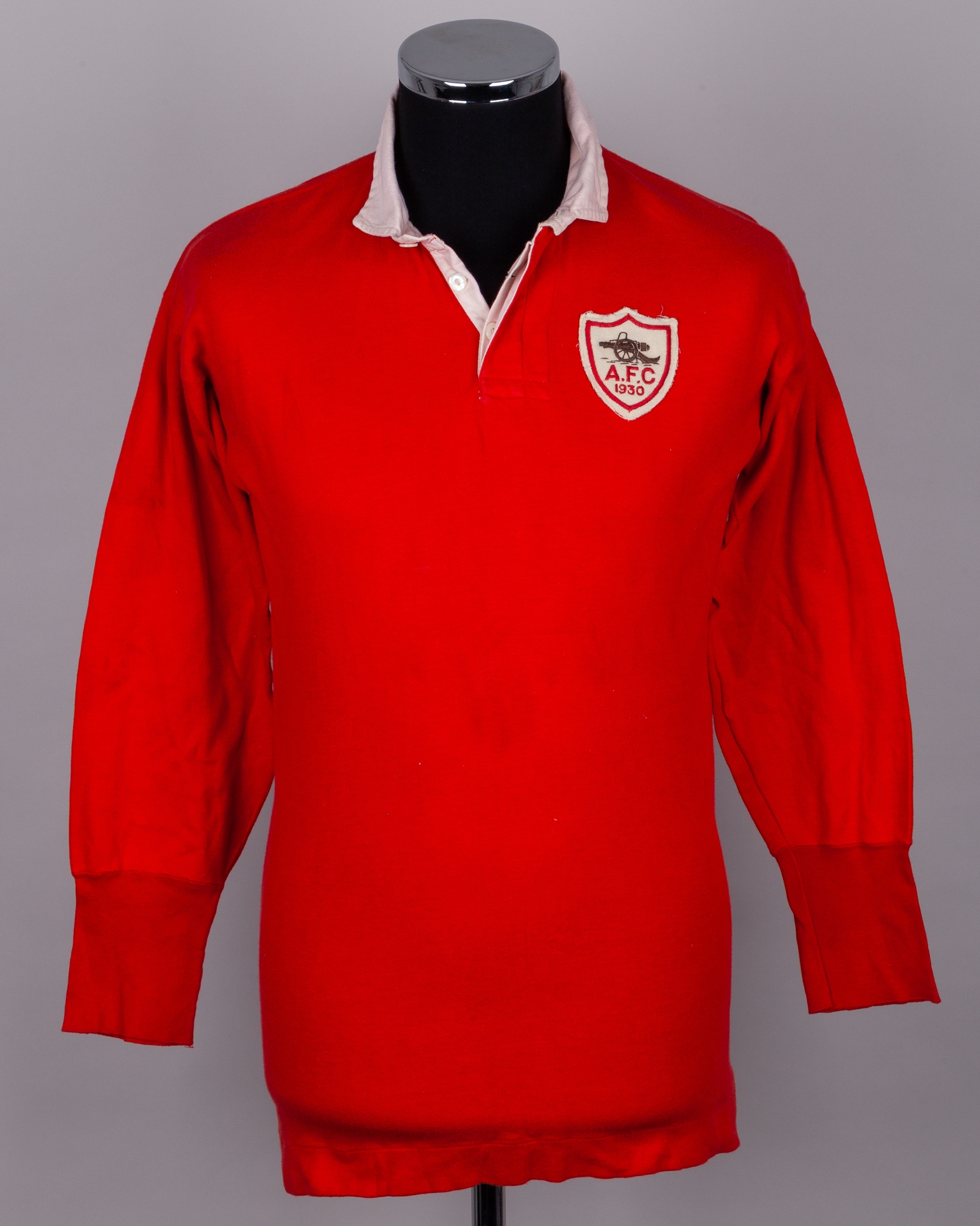 Bill Seddon rare red and white Arsenal v. Huddersfield Town F.A.Cup Final match worn long-sleeved shirt, 1930, Bukta, 30, with button-up collar and embroidered cloth badge inscribed A.F.C. 1930, some colour run on collar and some staining in shirt