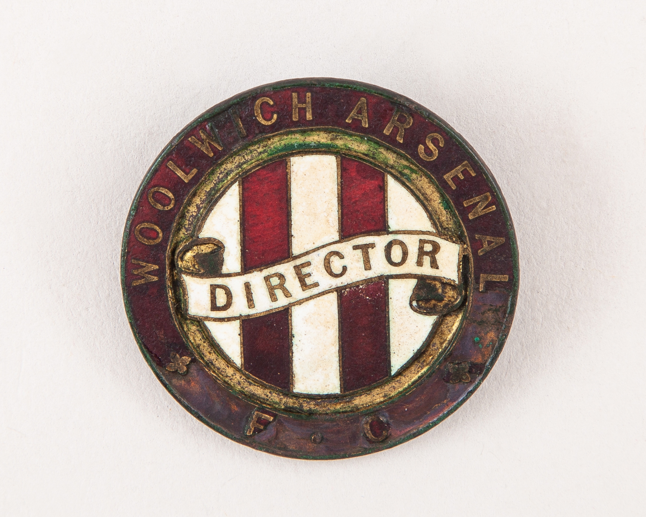 An extremely rare Woolwich Arsenal gilt-metal and enamel Director badge, the obverse inscribed WOOLWICH ARSENAL F.C. DIECTOR, the reverse with brooch attachment and stamped Fattorini Bradford, 3cm, tarnished.