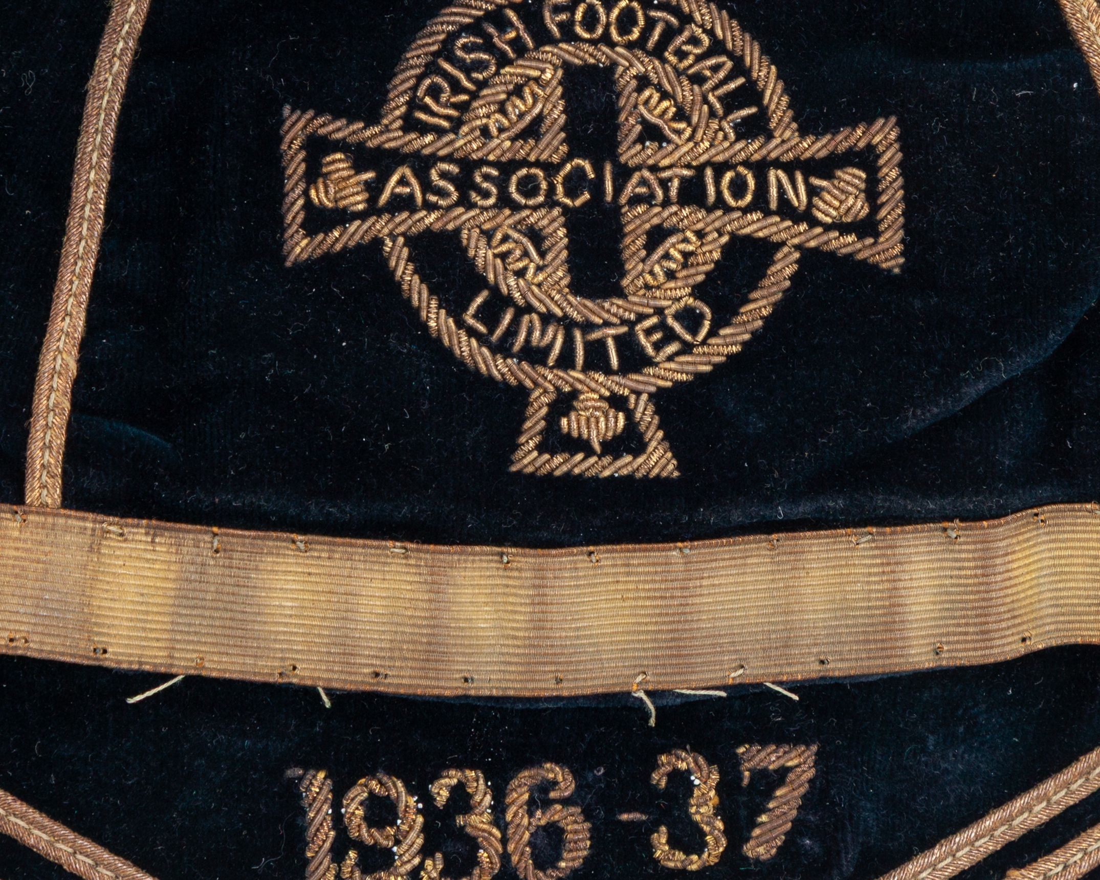 Billy Mitchell blue Northern Ireland v. Scotland, England and Wales International cap, 1936-37, blue velvet cap with gilt tassel and braiding and crest inscribed 1936-37