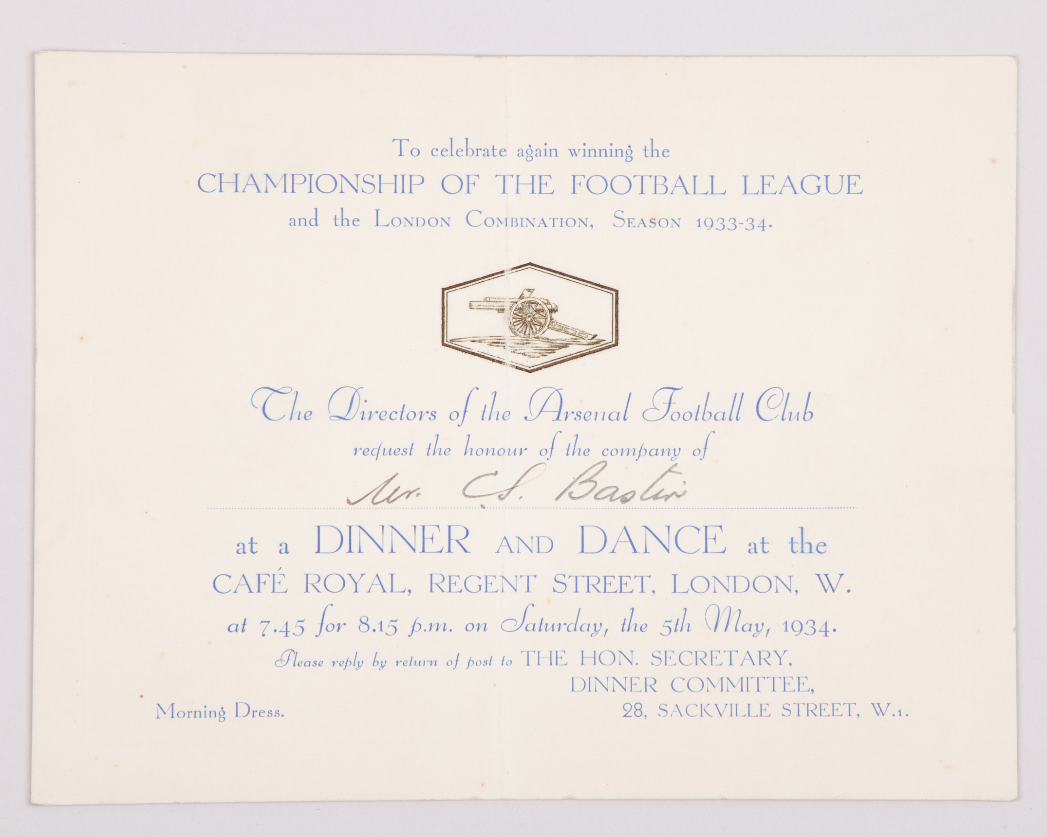 Cliff Bastin invitation to attend the Dinner & Dance to celebrate 1934 Championship, 8th May 1934