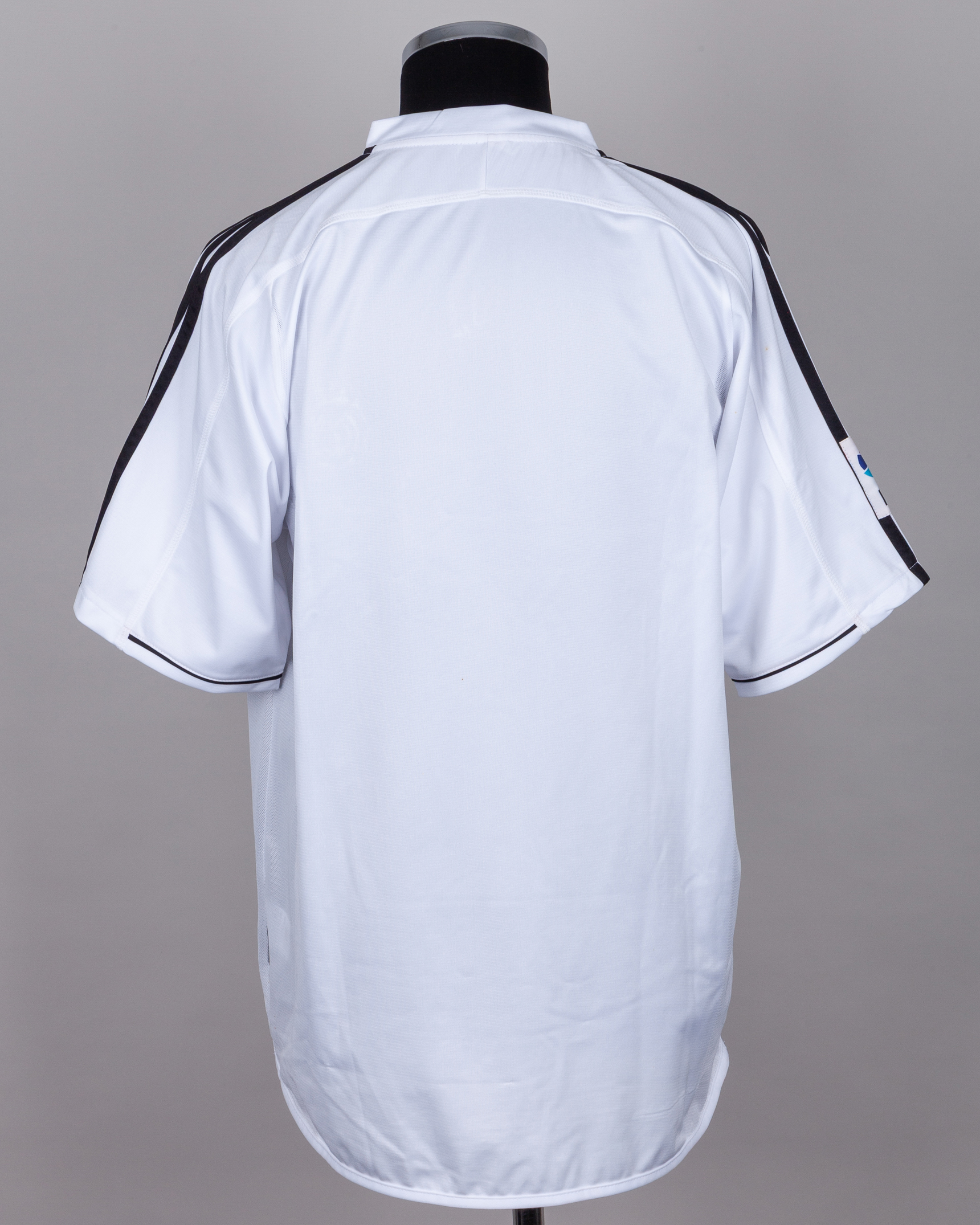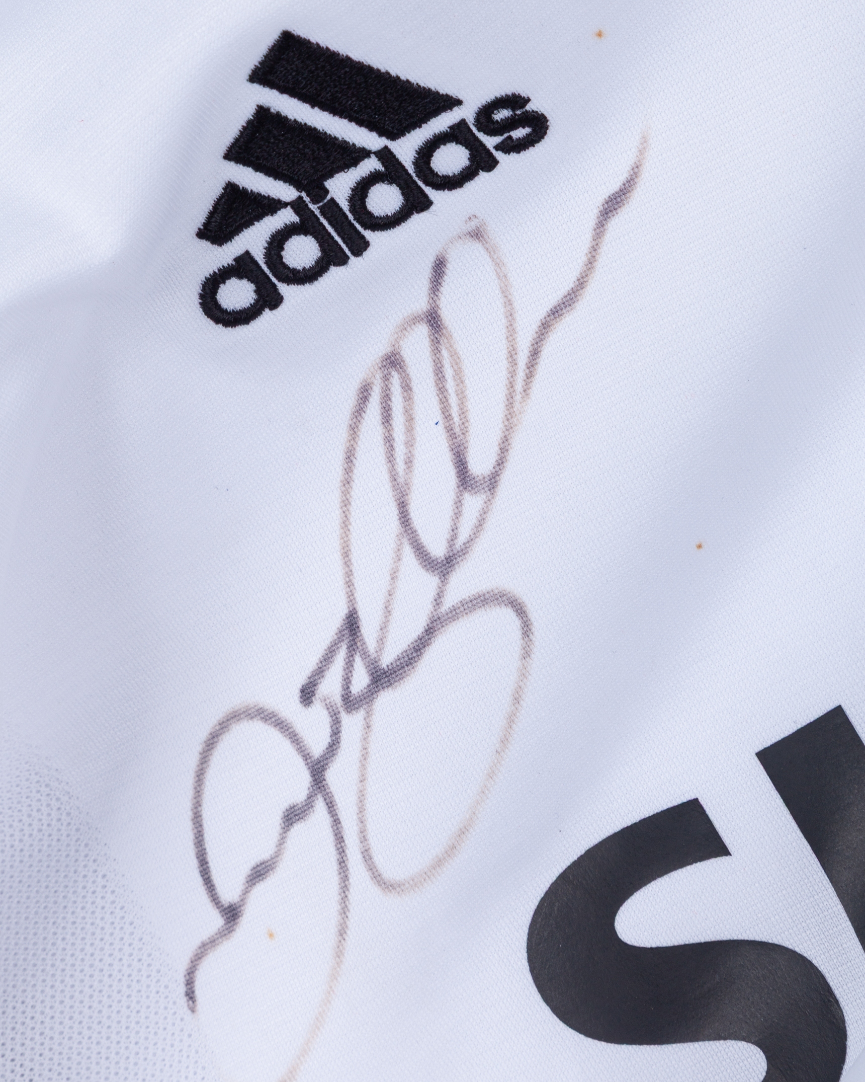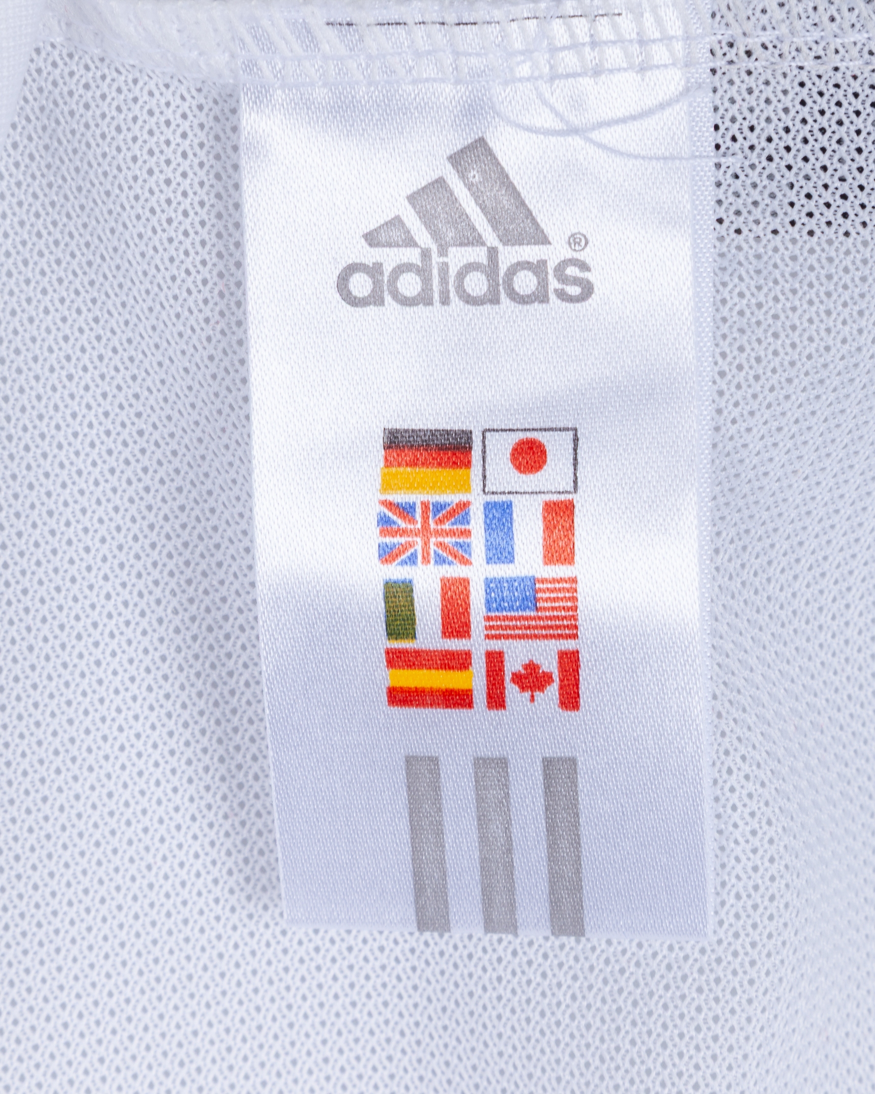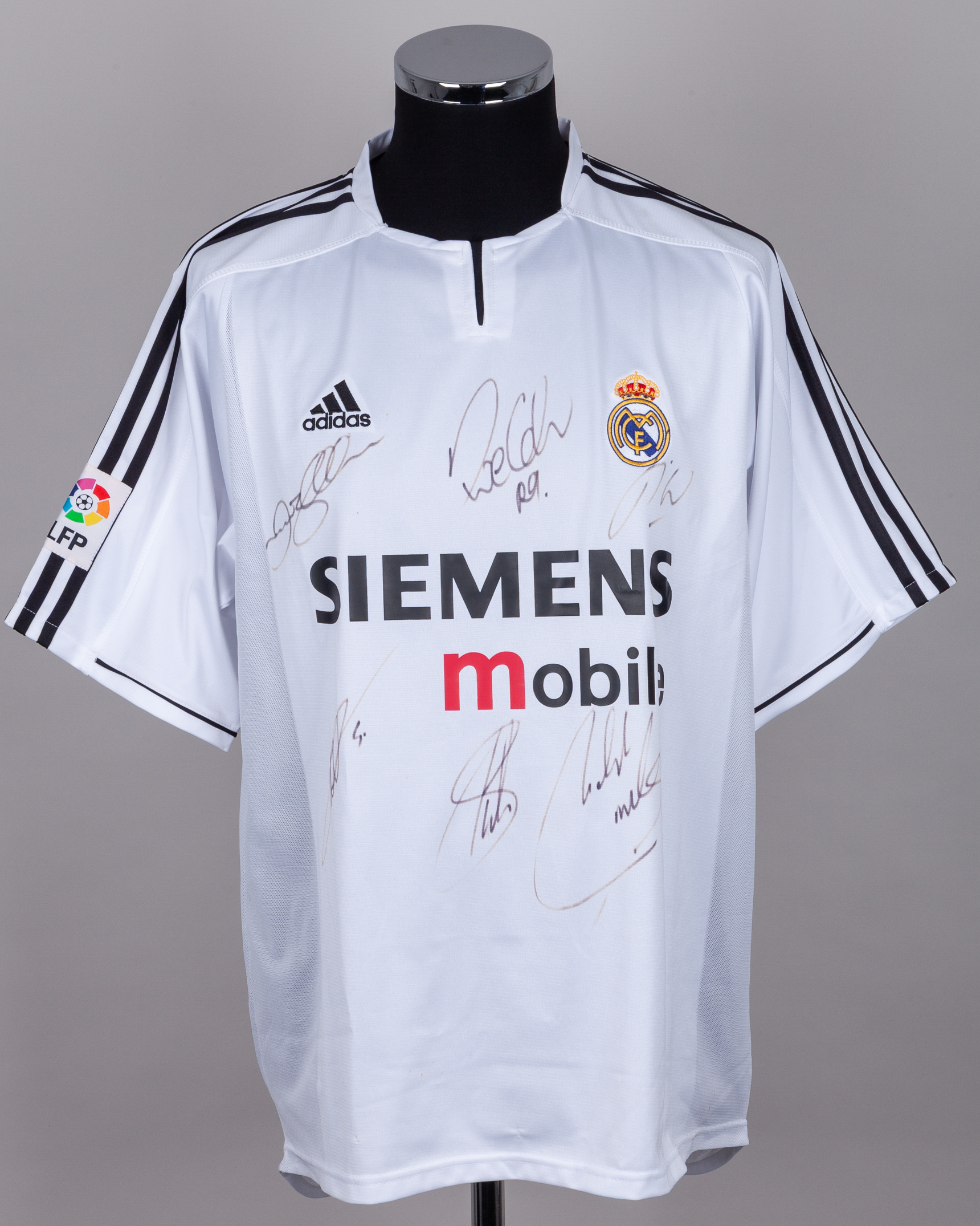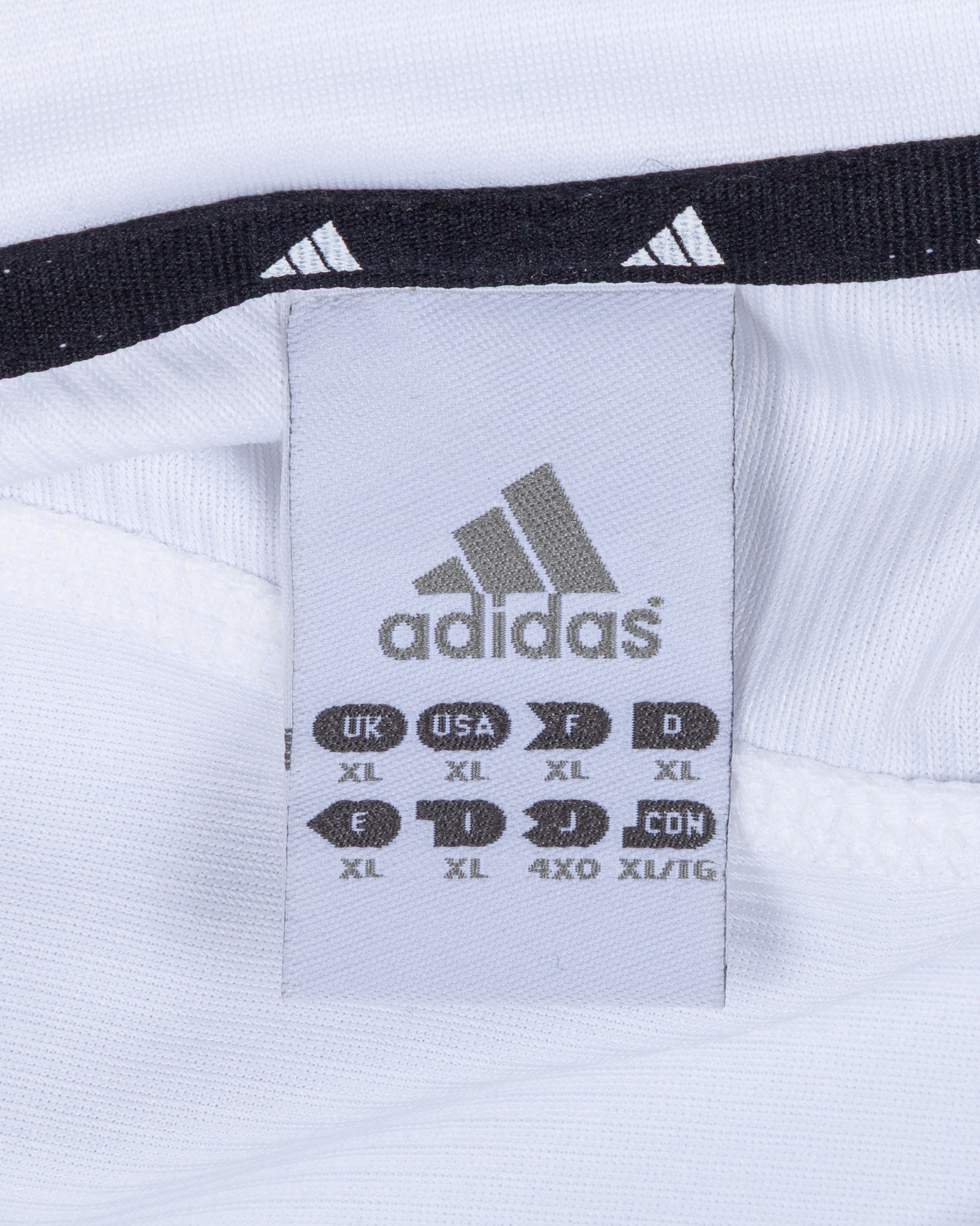 White Real Madrid autographed replica short-sleeved shirt, Adidas, XL, with crew-neck collar and embroidered badge, the right sleeve with LFP flash, with six autographs