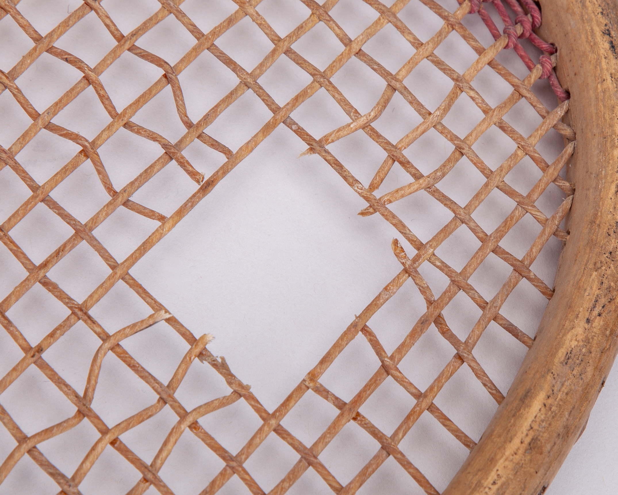 Tilt-headed Lawn Tennis racquet by Henry Malings of Frances Street, Woolwich, circa 1880, the convex wedge stamped with maker’s stamp, bears some wear and damage to stringing