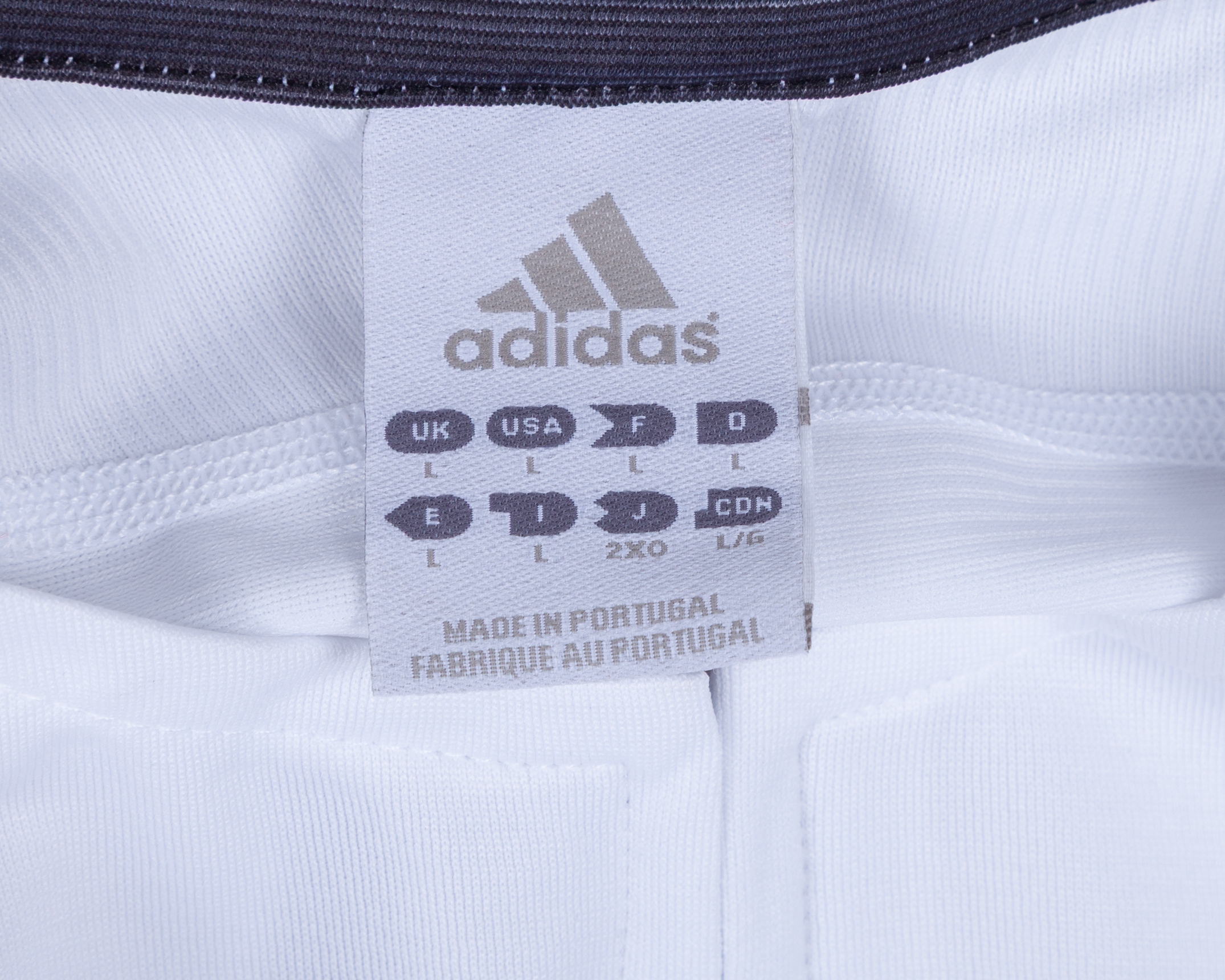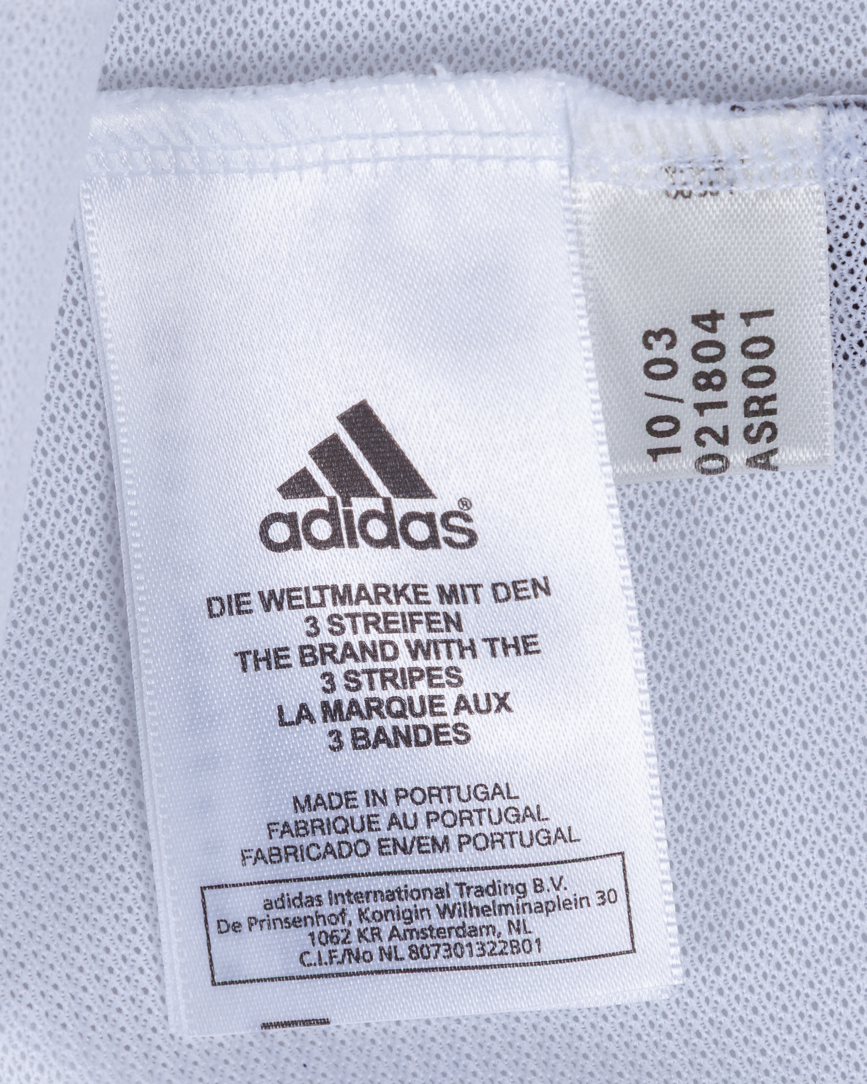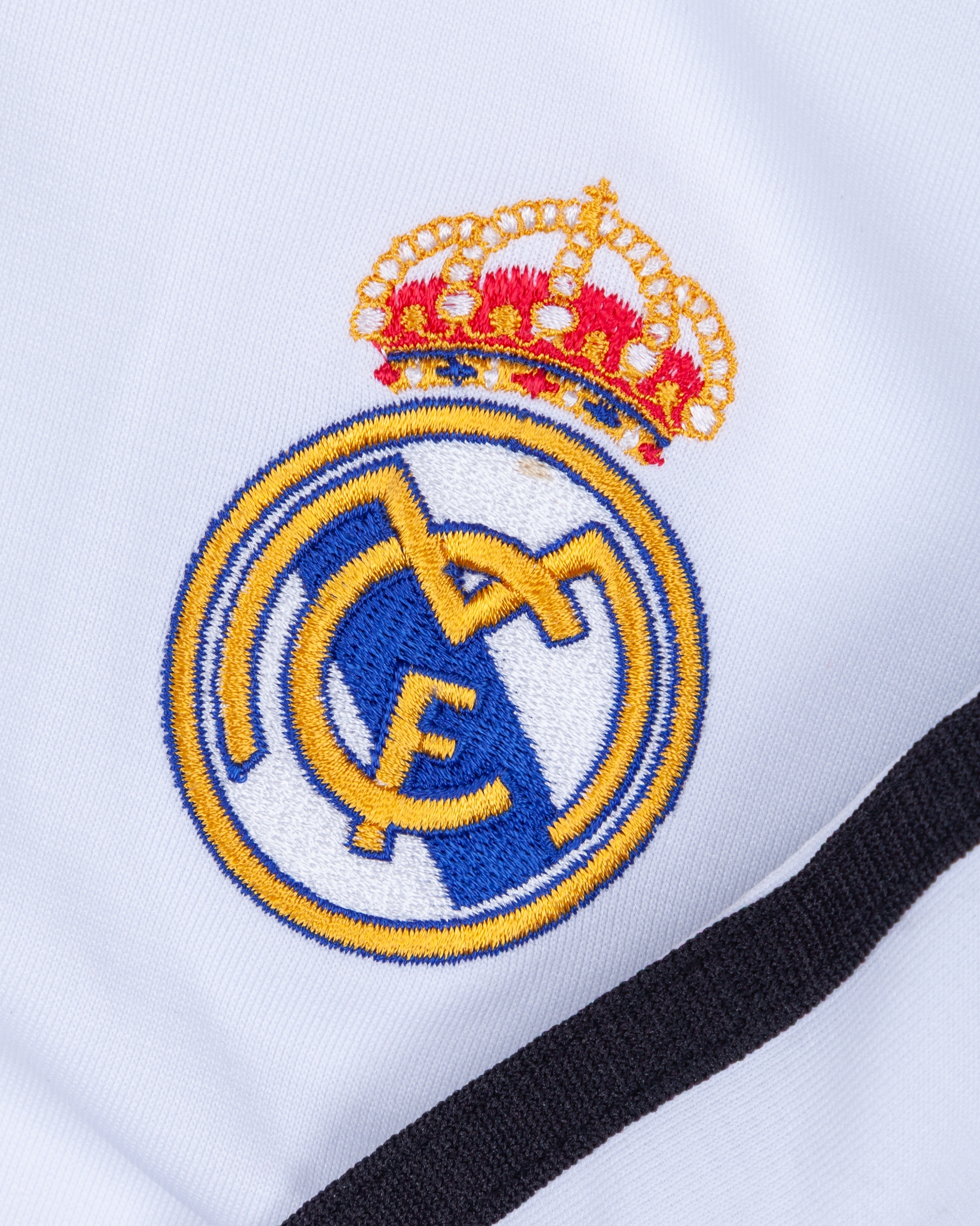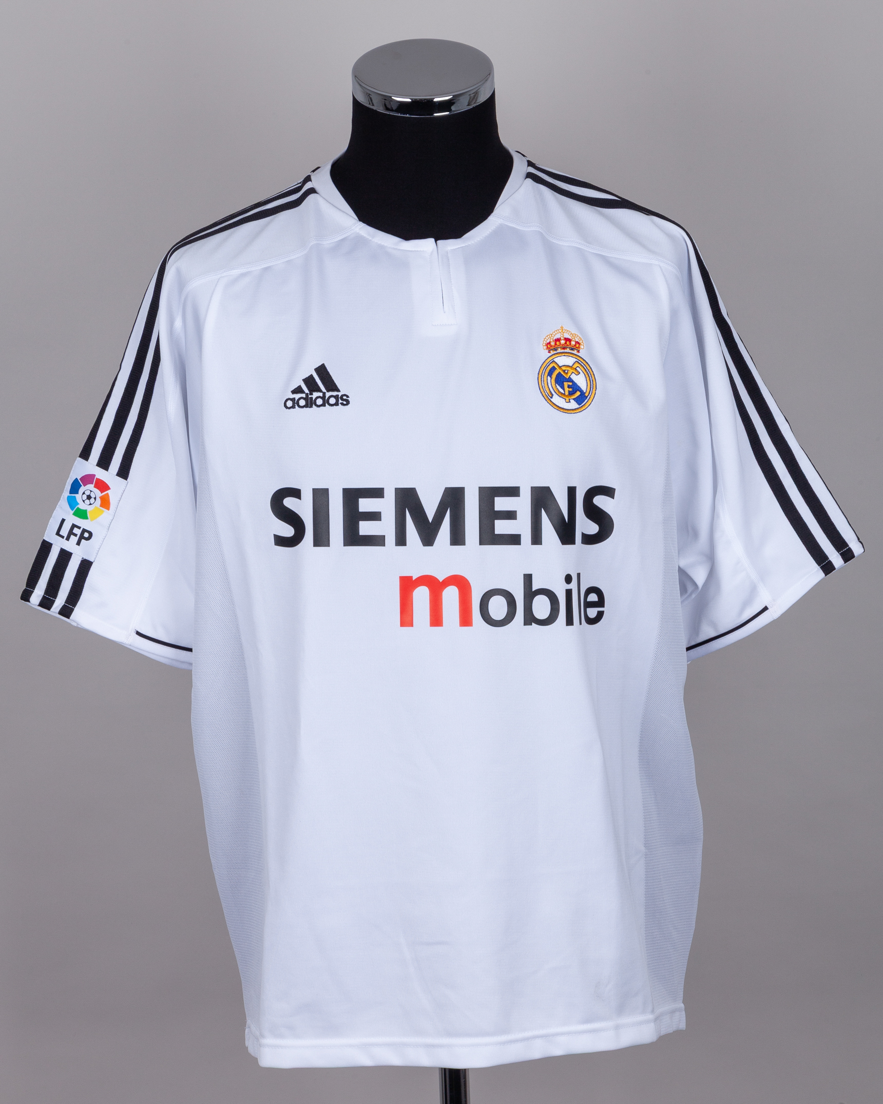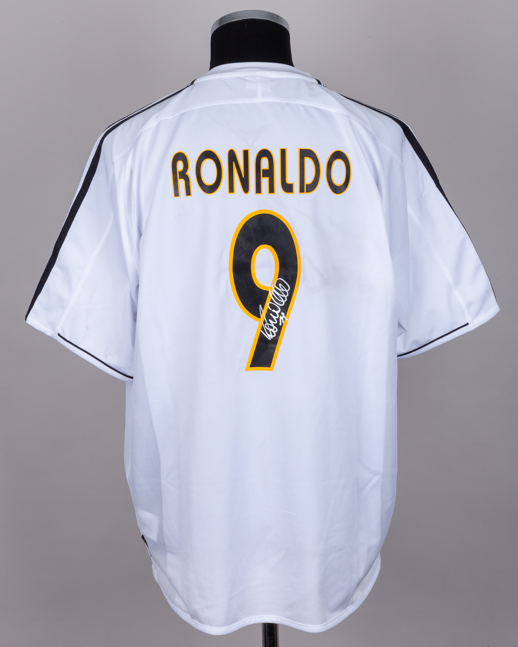 Ronaldo autographed white Real Madrid replica short-sleeved shirt, Adidas, L, with crew-neck collar and embroidered badge, the reverse lettered RONALDO, the right sleeve with LFP flash, autographed on the number, with some staining