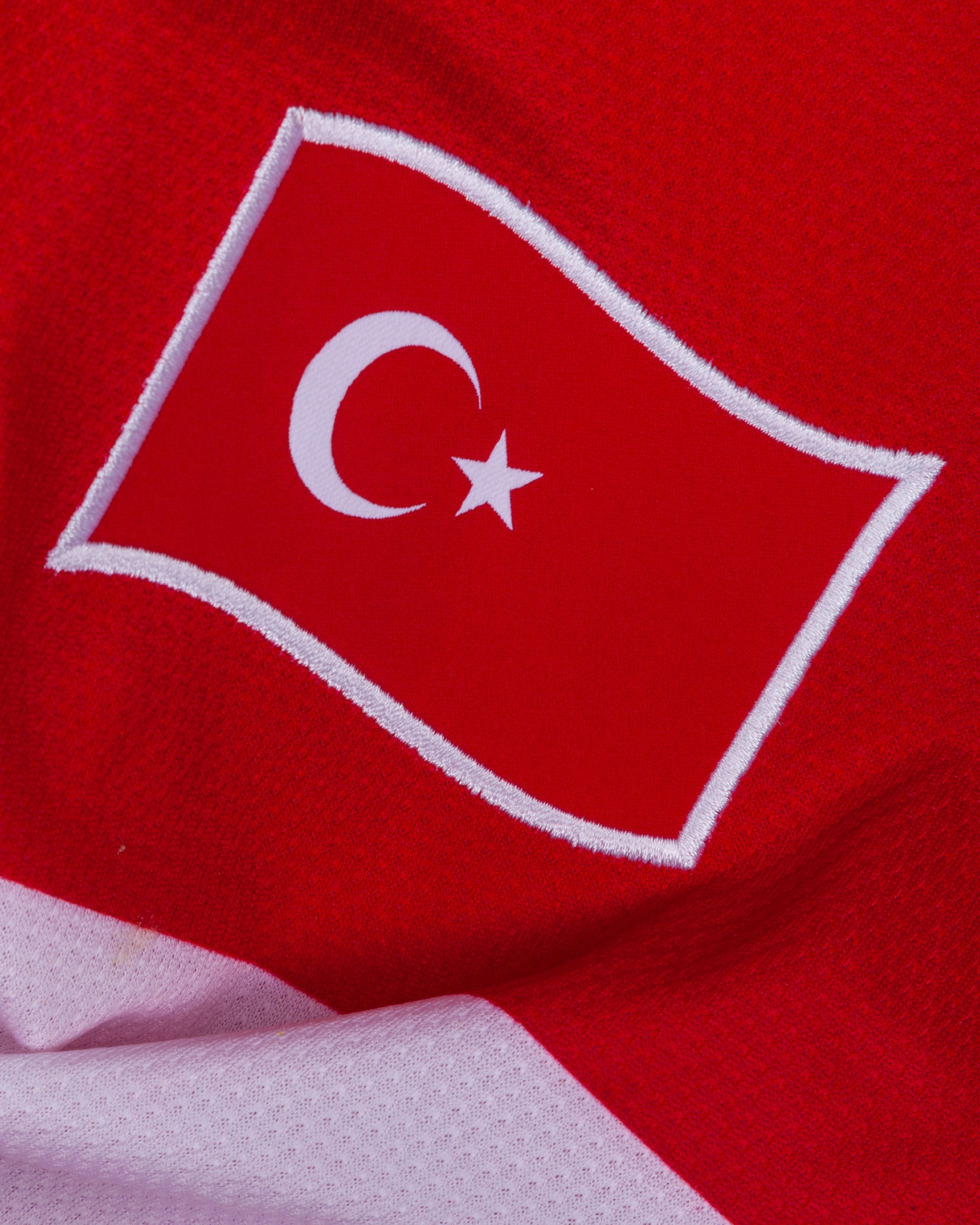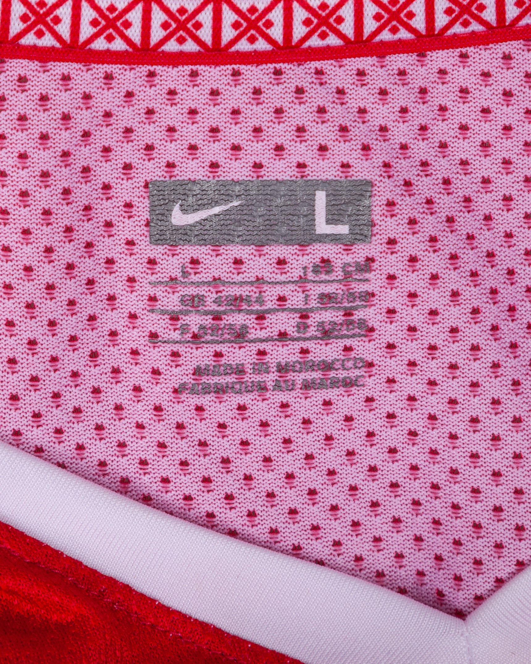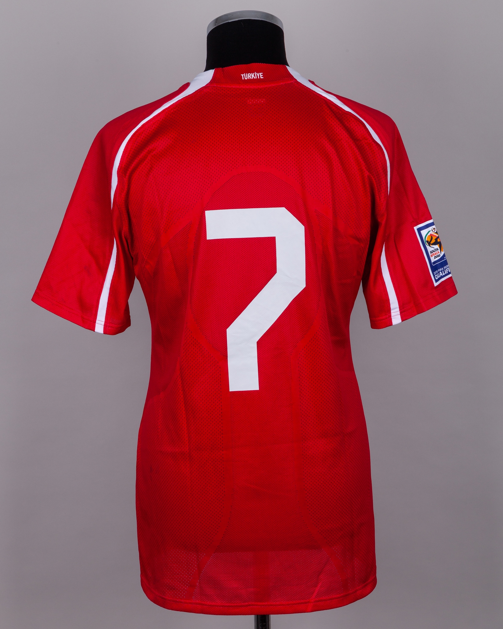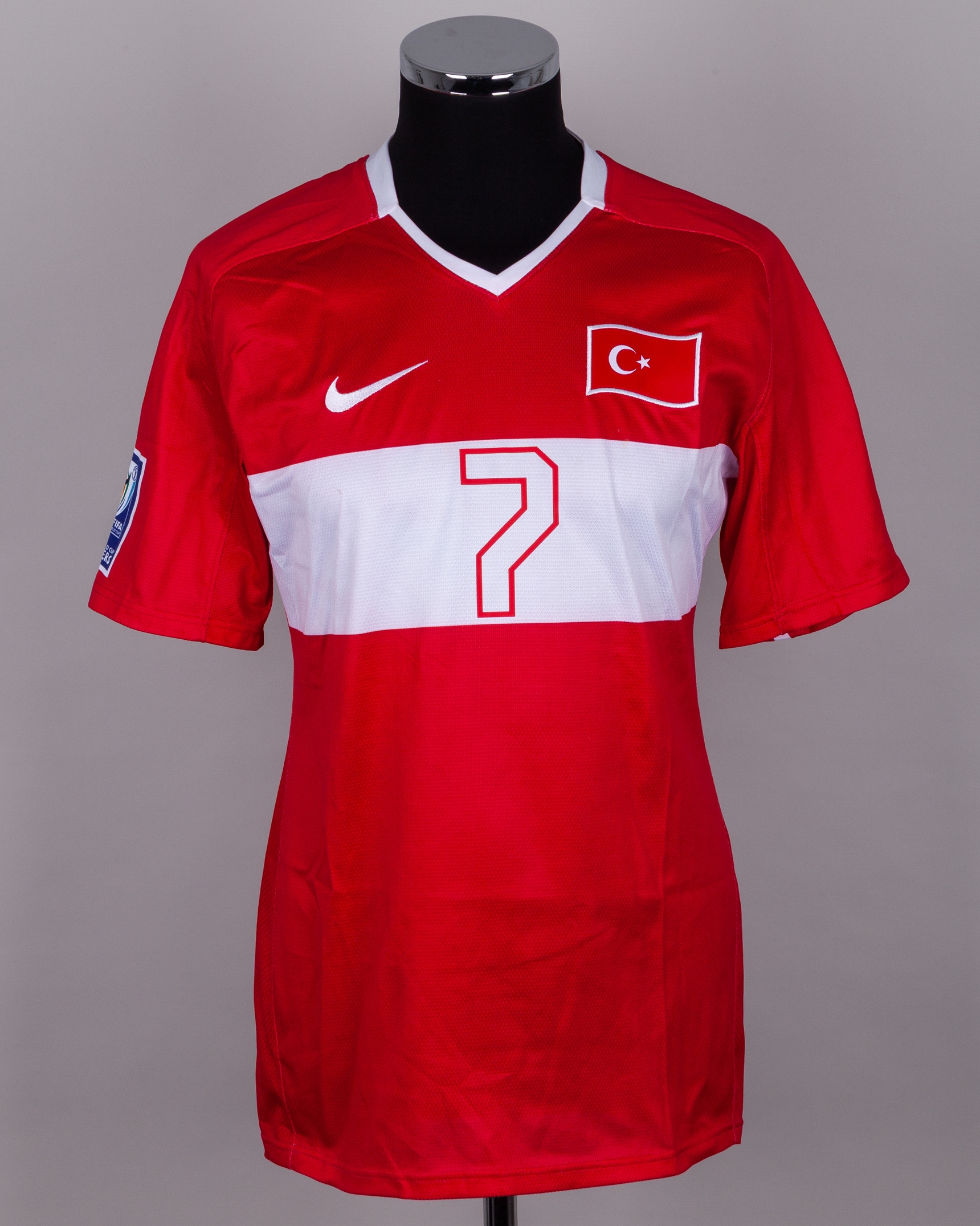 Gokhan Gonul red and white No.7 Turkey v. Bosnia short-sleeved shirt, 2010, Nike, 42/44, with v-neck collar and embroidered cloth badge, the right sleeve with FIFA 2010 World Cup flash