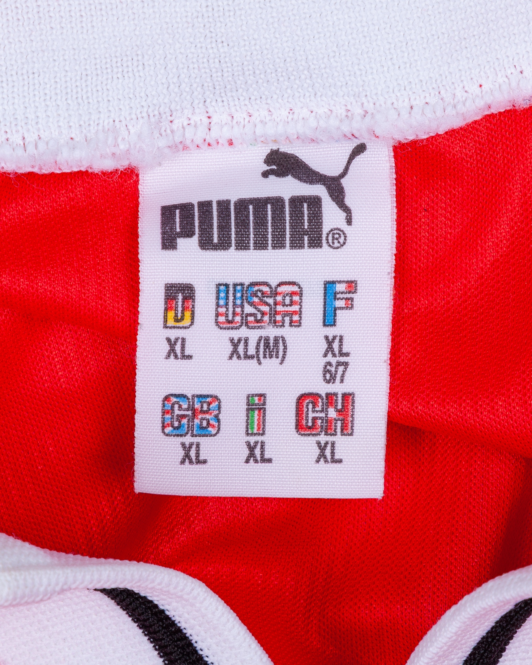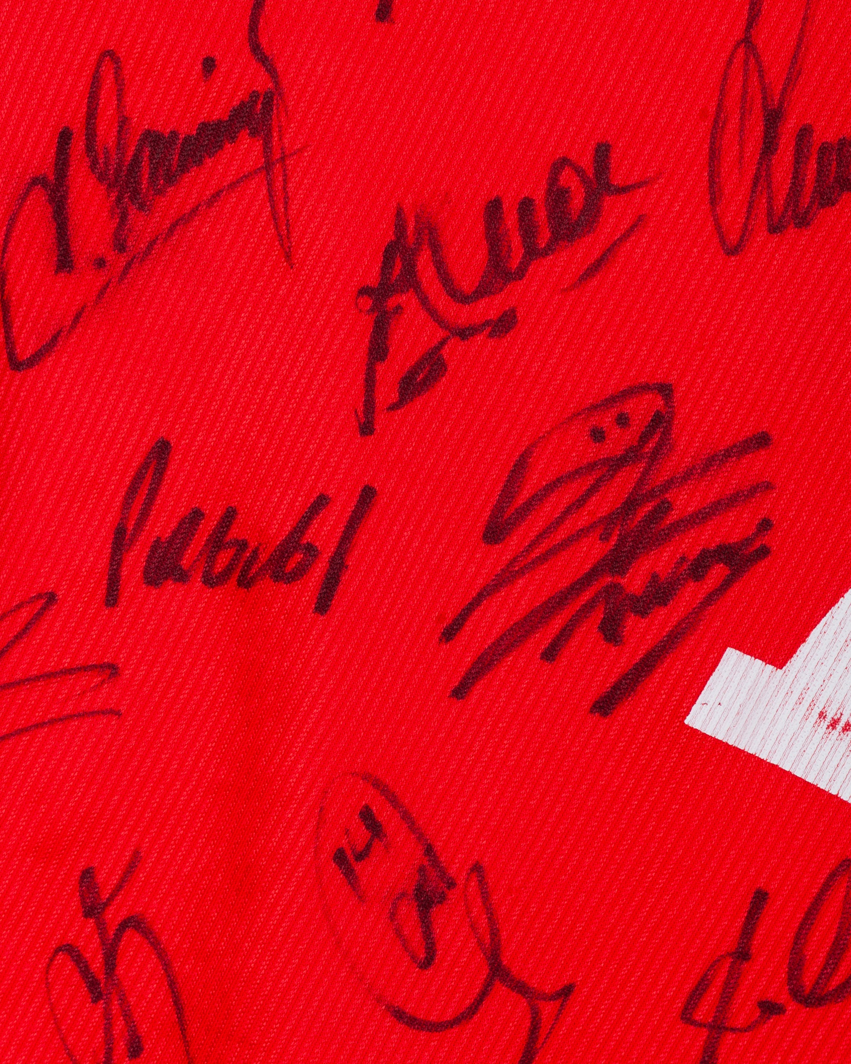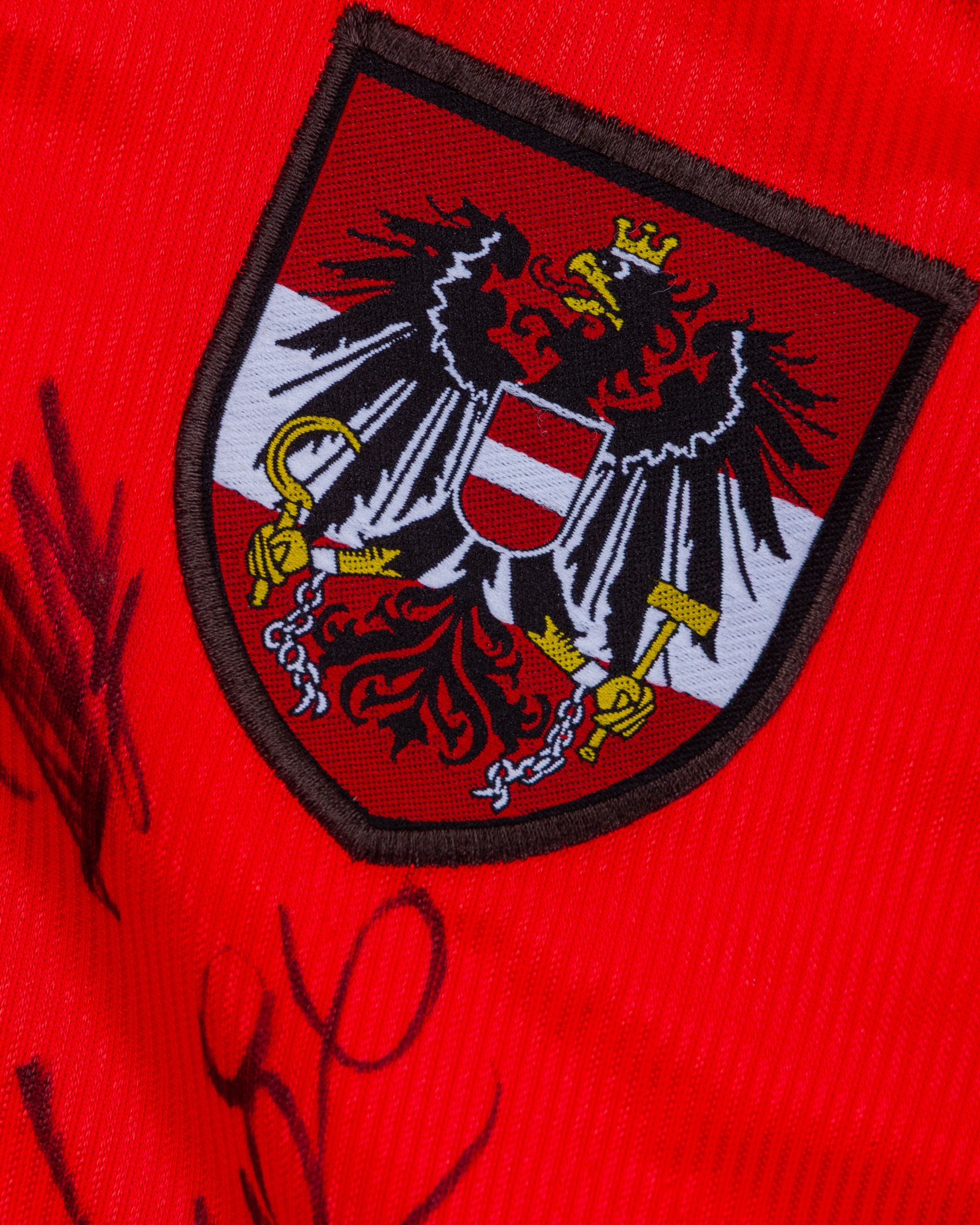 Red and white No.7 Austria squad signed short-sleeved shirt, Puma, XL, with v-neck collar and embroidered cloth badge, the front bearing numerous squad autographs